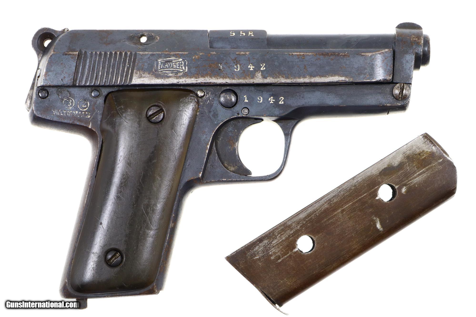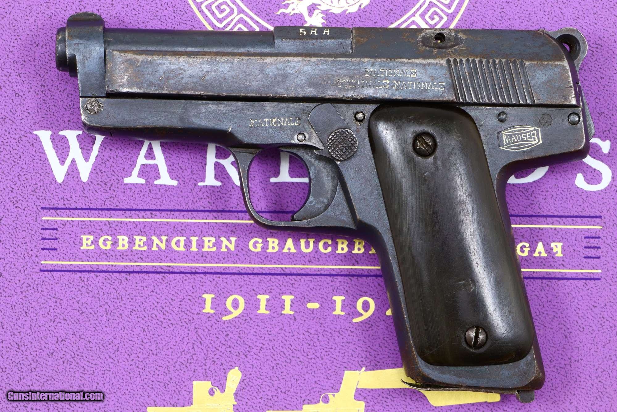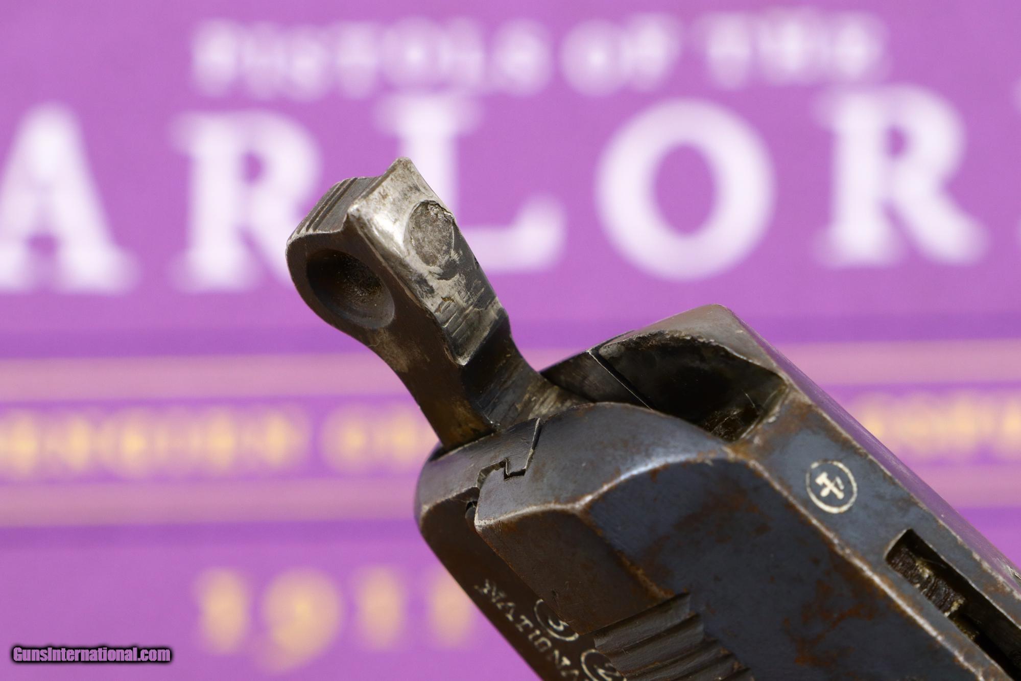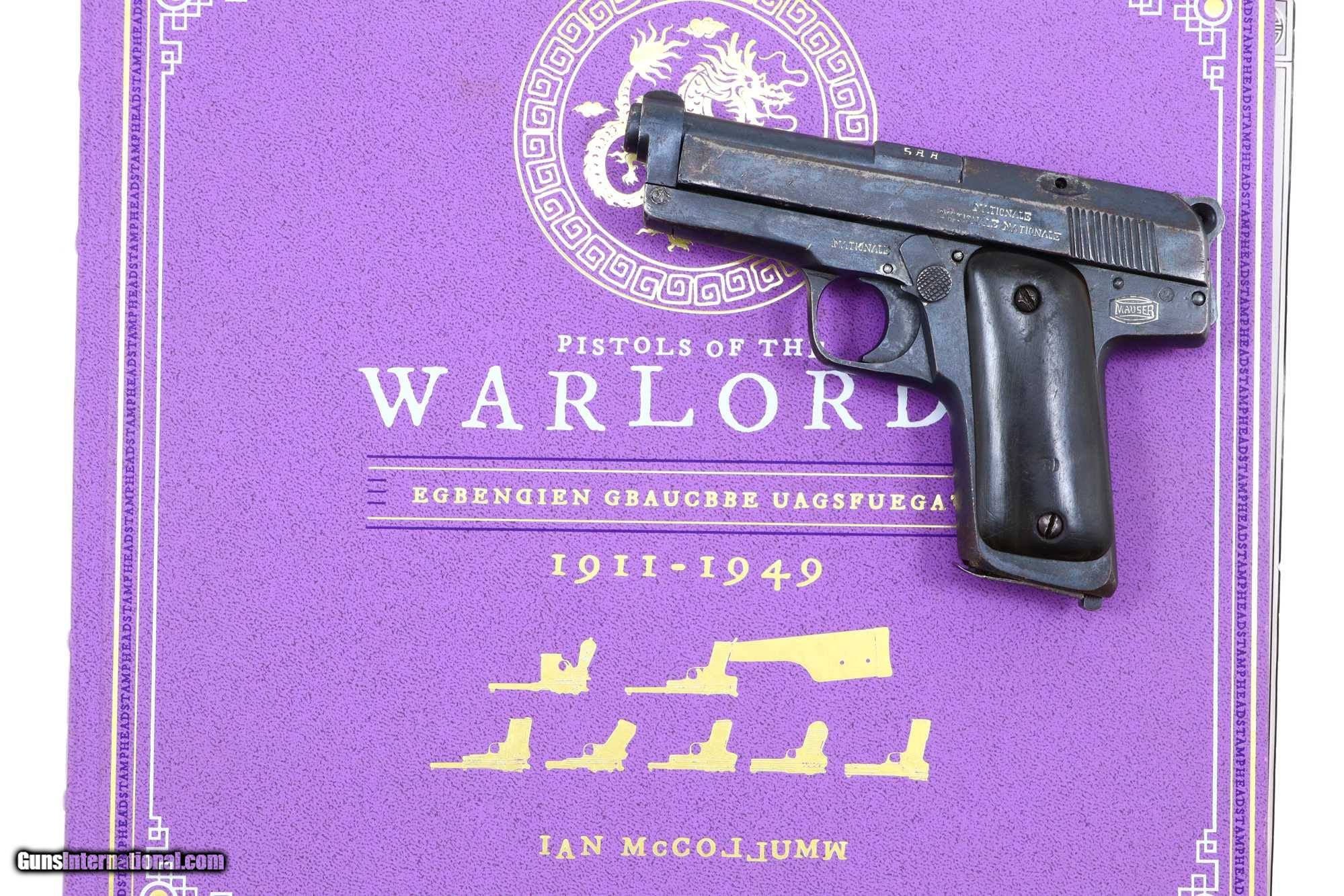 Description: This typical Chinese Warlord – Era pistol with dimpled slide is a single action blowback with external hammer having a fixed front sight, top mounted extractor (missing), and no rear sight. Both sides of the slide and frame have a scattering falsified FN and Mauser markings. Full serial number is on the top of the chamber, right side of slide and frame. The left side of the frame has been fitted with a mid-frame Eibar-type safety. Smooth horn grips. Unmarked magazine with 2 indicator holes and fixed floorplate. This exact pistol is pictured in the "Pistols of the Warlords 1911-1949" by Ian McCollum pages 168-169. Synopsis: Warlord Chinese Arsenal, Dimpled Slide, Fake Markings, Documented, 7.65mm, 1942, PCA-166 Condition: Generally VG original finish with sharp edge wear, dings, and oxidation consistent with a pistol that has seen moderate use. The barrel band is loose and the extractor is missing, though the firing pin is present. Face of the hammer has impact deformation as pictured. Dull bore with easily discernible rifling. Perfect manual mechanics. Dimple slide pistols are seldom encountered, nice to have one that has been pictured in a well distributed reference book. NOT TO BE FIRED! NOT TO BE FIRED! NOT TO BE FIRED! ~~Insured shipping fee of $65; most packages shipped using FedEx 2nd Day.~~ SOLD Manufacturer: Chinese Arsenal Serial Number: 1942 Caliber Info: 7.65 |