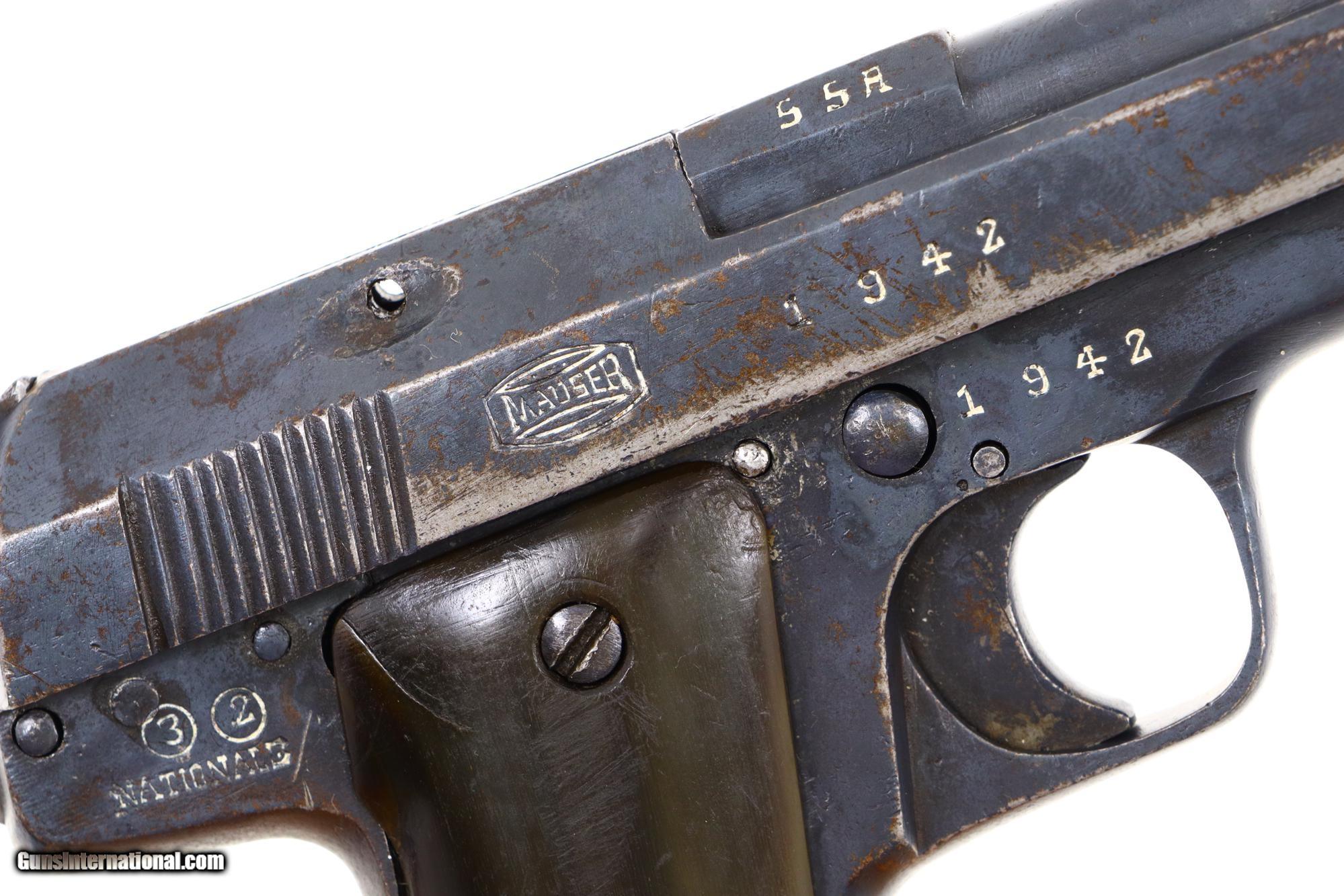 Description: This typical Chinese Warlord – Era pistol with dimpled slide is a single action blowback with external hammer having a fixed front sight, top mounted extractor (missing), and no rear sight. Both sides of the slide and frame have a scattering falsified FN and Mauser markings. Full serial number is on the top of the chamber, right side of slide and frame. The left side of the frame has been fitted with a mid-frame Eibar-type safety. Smooth horn grips. Unmarked magazine with 2 indicator holes and fixed floorplate. This exact pistol is pictured in the "Pistols of the Warlords 1911-1949" by Ian McCollum pages 168-169. Synopsis: Warlord Chinese Arsenal, Dimpled Slide, Fake Markings, Documented, 7.65mm, 1942, PCA-166 Condition: Generally VG original finish with sharp edge wear, dings, and oxidation consistent with a pistol that has seen moderate use. The barrel band is loose and the extractor is missing, though the firing pin is present. Face of the hammer has impact deformation as pictured. Dull bore with easily discernible rifling. Perfect manual mechanics. Dimple slide pistols are seldom encountered, nice to have one that has been pictured in a well distributed reference book. NOT TO BE FIRED! NOT TO BE FIRED! NOT TO BE FIRED! ~~Insured shipping fee of $65; most packages shipped using FedEx 2nd Day.~~ SOLD Manufacturer: Chinese Arsenal Serial Number: 1942 Caliber Info: 7.65 |