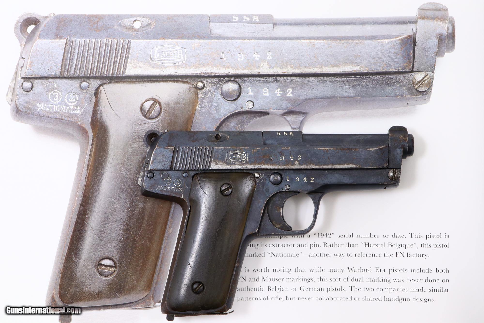 Description: This typical Chinese Warlord – Era pistol with dimpled slide is a single action blowback with external hammer having a fixed front sight, top mounted extractor (missing), and no rear sight. Both sides of the slide and frame have a scattering falsified FN and Mauser markings. Full serial number is on the top of the chamber, right side of slide and frame. The left side of the frame has been fitted with a mid-frame Eibar-type safety. Smooth horn grips. Unmarked magazine with 2 indicator holes and fixed floorplate. This exact pistol is pictured in the "Pistols of the Warlords 1911-1949" by Ian McCollum pages 168-169. Synopsis: Warlord Chinese Arsenal, Dimpled Slide, Fake Markings, Documented, 7.65mm, 1942, PCA-166 Condition: Generally VG original finish with sharp edge wear, dings, and oxidation consistent with a pistol that has seen moderate use. The barrel band is loose and the extractor is missing, though the firing pin is present. Face of the hammer has impact deformation as pictured. Dull bore with easily discernible rifling. Perfect manual mechanics. Dimple slide pistols are seldom encountered, nice to have one that has been pictured in a well distributed reference book. NOT TO BE FIRED! NOT TO BE FIRED! NOT TO BE FIRED! ~~Insured shipping fee of $65; most packages shipped using FedEx 2nd Day.~~ SOLD Manufacturer: Chinese Arsenal Serial Number: 1942 Caliber Info: 7.65 |