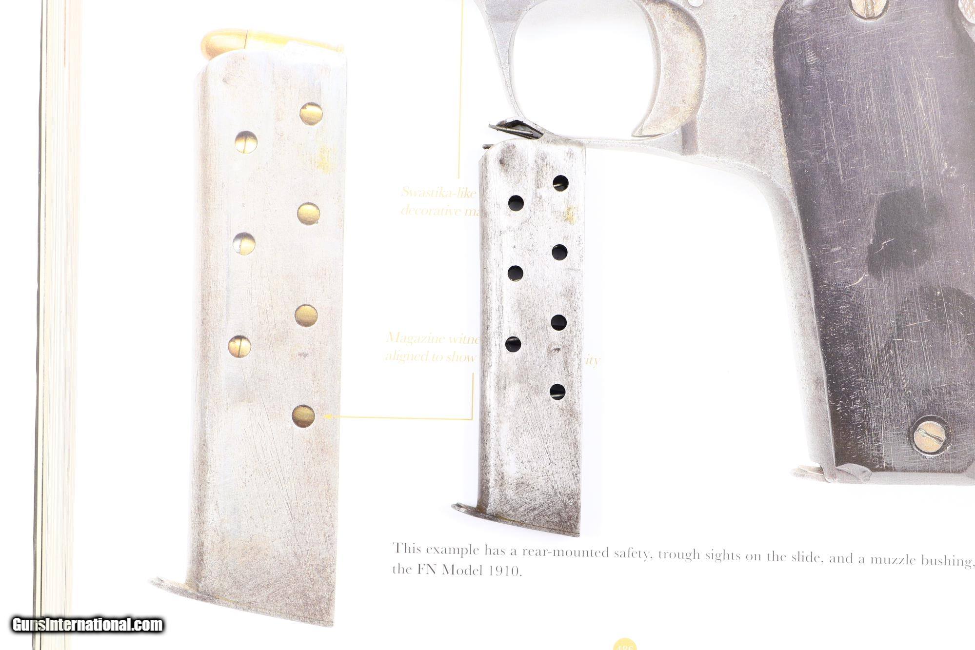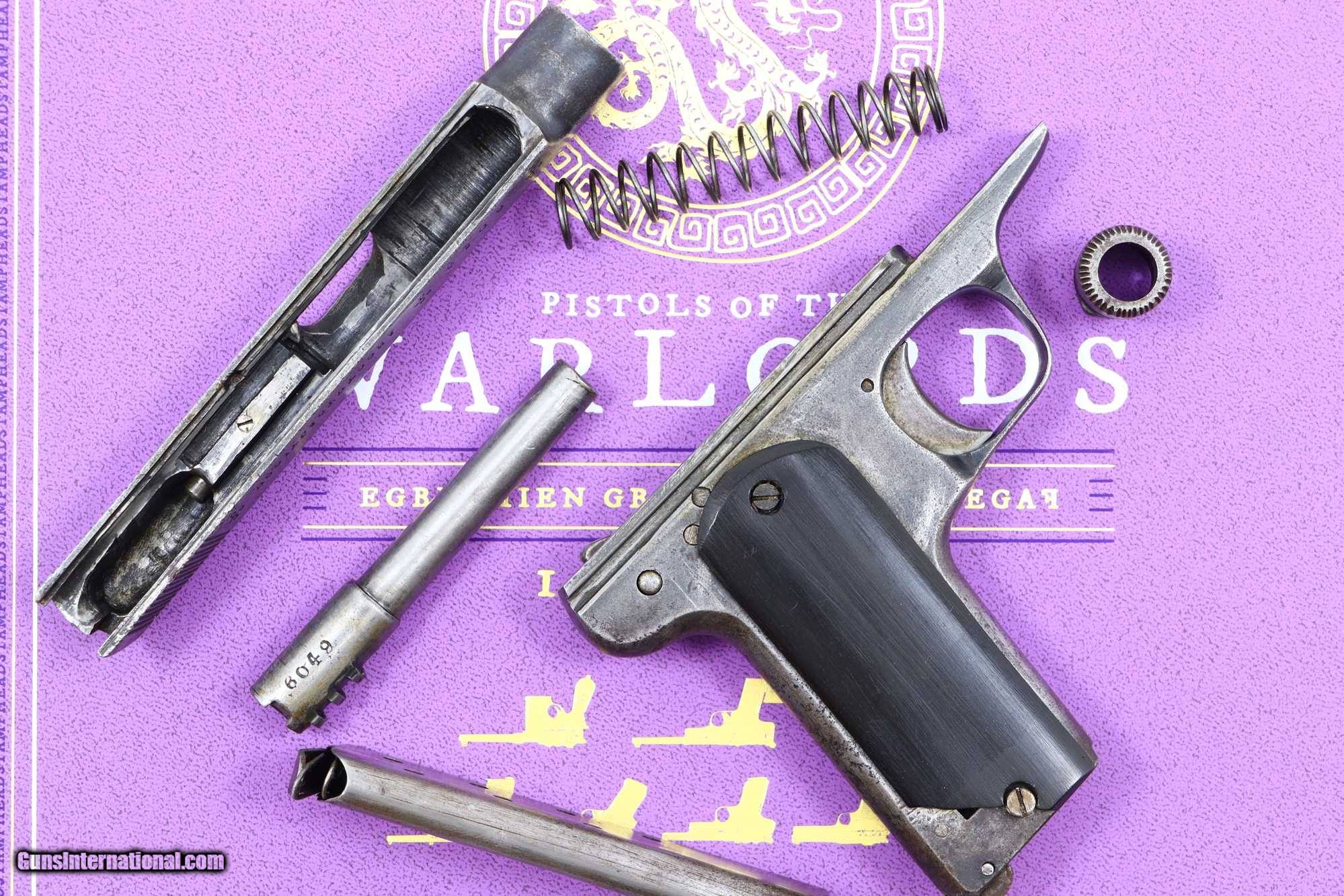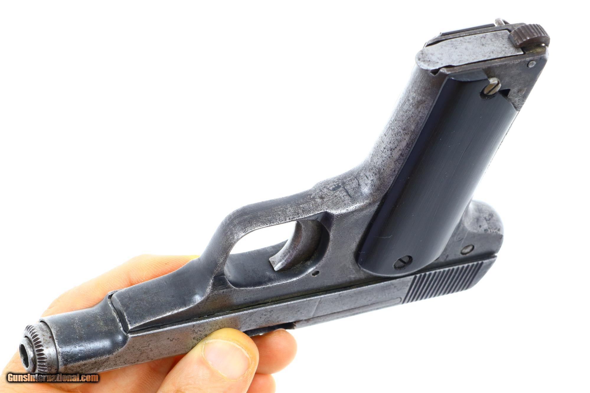 Description: In addition to the Mauser C96, the Chinese Warlords were especially fond of the FN 1900 pistols in caliber 7.65mm (.32ACP). This example is a mechanically close copy of the FN 1910 with nonsense writing on the left side of the slide but having a matching barrel and frame. Like the FN, it dismounts by depressing and rotating the knurled bushing at the muzzle with slide removal disclosing an internal hammer. Frame mounted safety on the left tang. Period replacement grips. Fitted with bottom release magazine having 7 indicator holes and a fixed floorplate. This EXACT pistol pictured in “Pistols of the Warlords” text by Ian McCollum on pages 486-487. Synopsis: Bizarre Chinese Arsenal Warlord Pistol, FN 1900 Copy, Documented, 7.65mm, 6049, PCA-160 Condition: Generally gray gun with minimal blue in protected areas. Missing ejector (reflected by hole at rear slide). Period replacement grips, the right panel missing a wedge at bottom rear. Surprisingly bright but etched bore with distinct rifling. Perfect manual mechanics. A true “One of a Kind” Chinese Warlord FN 1910 Copy. NOT TO BE FIRED!! NOT TO BE FIRED!! NOT TO BE FIRED!! ~~Insured shipping fee of $55; most packages shipped using FedEx 2nd Day.~~ SOLD Manufacturer: Chinese Arsenal Serial Number: 6049 Caliber Info: 7.65mm |