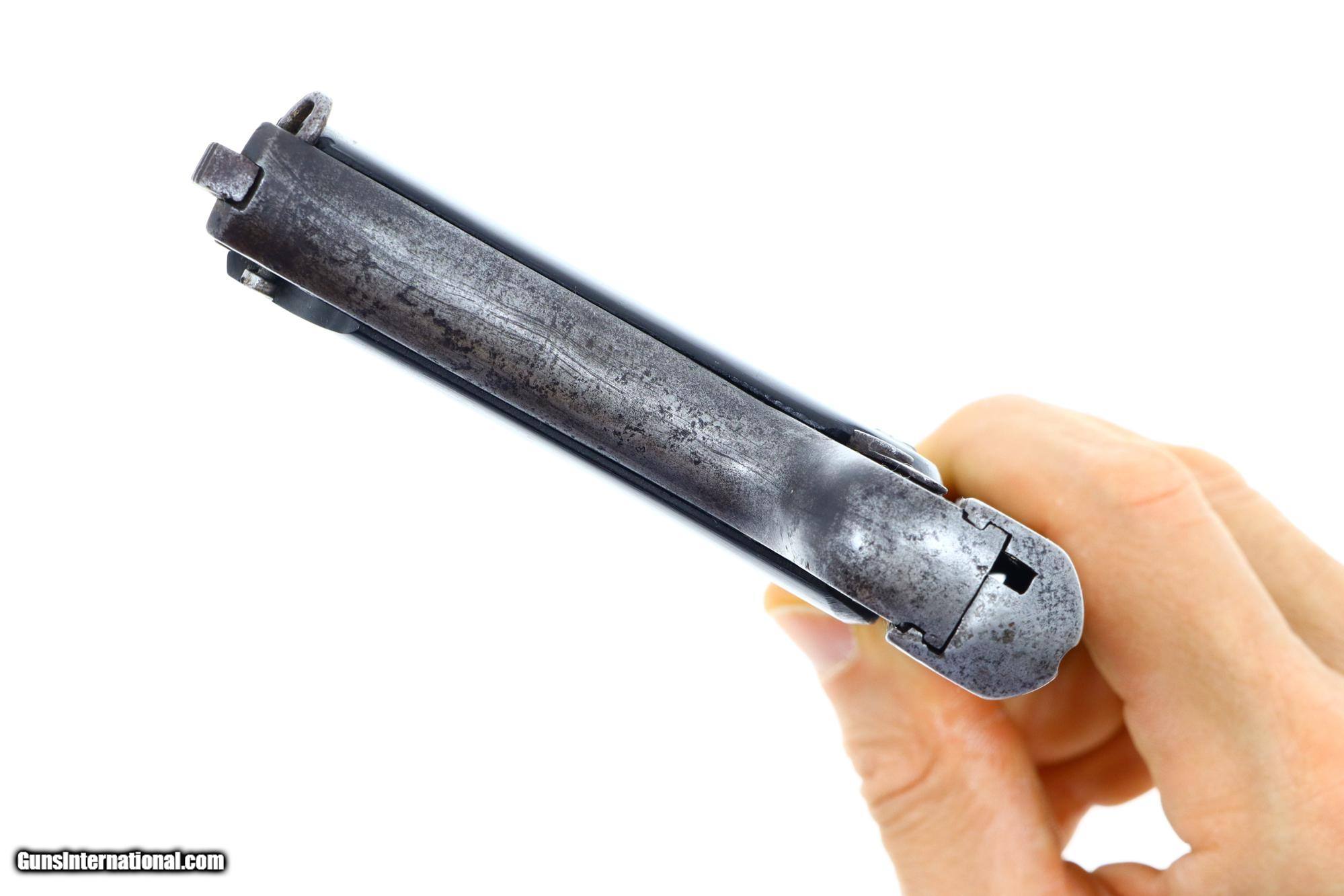 Description: In addition to the Mauser C96, the Chinese Warlords were especially fond of the FN 1900 pistols in caliber 7.65mm (.32ACP). This example is a mechanically close copy of the FN 1910 with nonsense writing on the left side of the slide but having a matching barrel and frame. Like the FN, it dismounts by depressing and rotating the knurled bushing at the muzzle with slide removal disclosing an internal hammer. Frame mounted safety on the left tang. Period replacement grips. Fitted with bottom release magazine having 7 indicator holes and a fixed floorplate. This EXACT pistol pictured in “Pistols of the Warlords” text by Ian McCollum on pages 486-487. Synopsis: Bizarre Chinese Arsenal Warlord Pistol, FN 1900 Copy, Documented, 7.65mm, 6049, PCA-160 Condition: Generally gray gun with minimal blue in protected areas. Missing ejector (reflected by hole at rear slide). Period replacement grips, the right panel missing a wedge at bottom rear. Surprisingly bright but etched bore with distinct rifling. Perfect manual mechanics. A true “One of a Kind” Chinese Warlord FN 1910 Copy. NOT TO BE FIRED!! NOT TO BE FIRED!! NOT TO BE FIRED!! ~~Insured shipping fee of $55; most packages shipped using FedEx 2nd Day.~~ SOLD Manufacturer: Chinese Arsenal Serial Number: 6049 Caliber Info: 7.65mm |