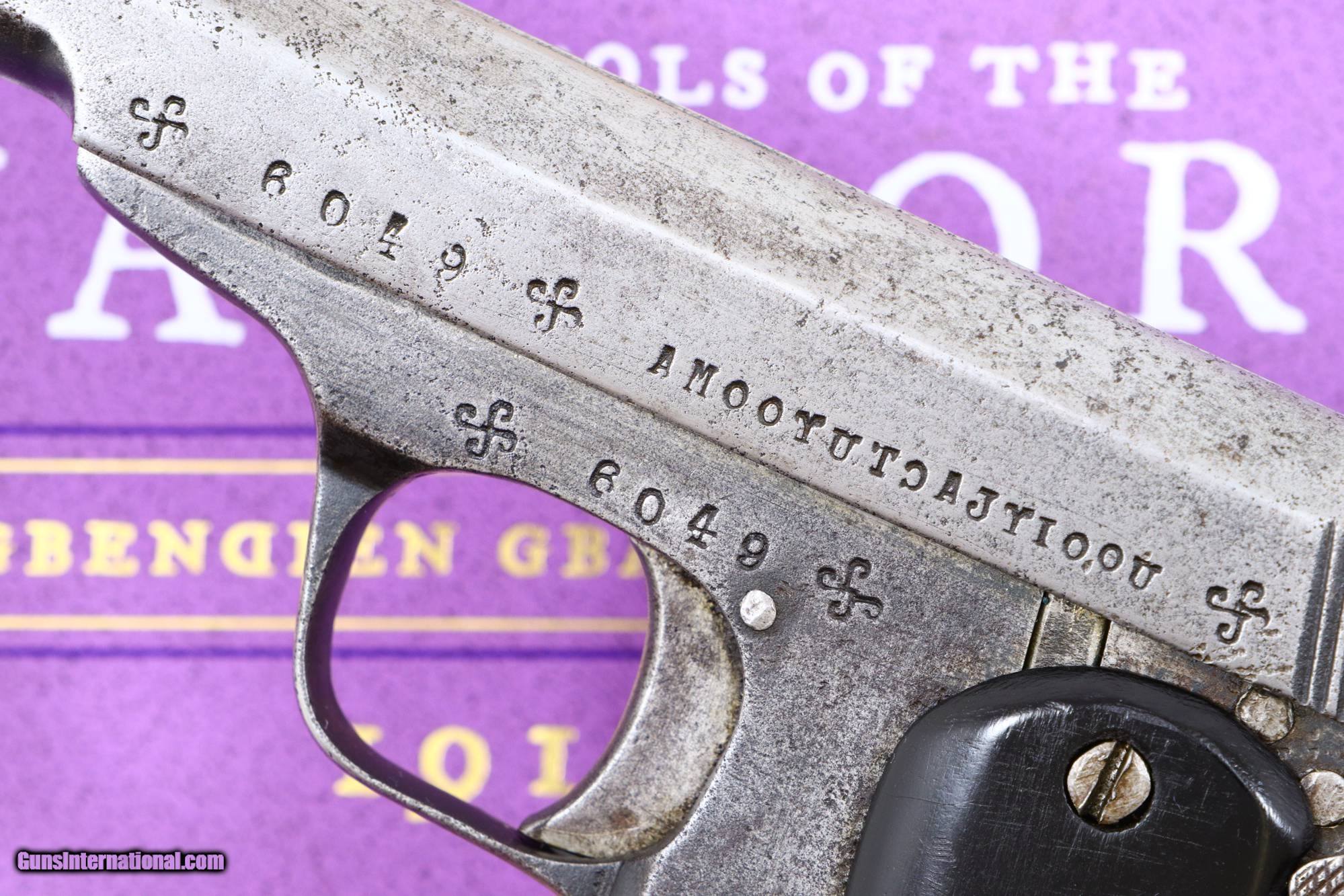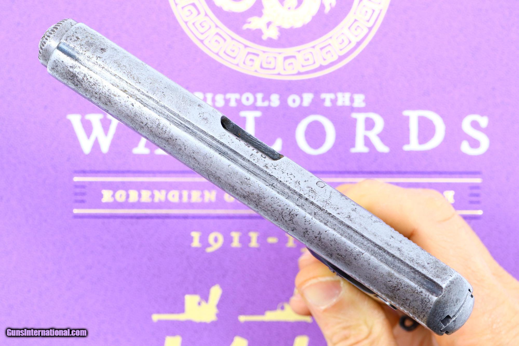 Description: In addition to the Mauser C96, the Chinese Warlords were especially fond of the FN 1900 pistols in caliber 7.65mm (.32ACP). This example is a mechanically close copy of the FN 1910 with nonsense writing on the left side of the slide but having a matching barrel and frame. Like the FN, it dismounts by depressing and rotating the knurled bushing at the muzzle with slide removal disclosing an internal hammer. Frame mounted safety on the left tang. Period replacement grips. Fitted with bottom release magazine having 7 indicator holes and a fixed floorplate. This EXACT pistol pictured in “Pistols of the Warlords” text by Ian McCollum on pages 486-487. Synopsis: Bizarre Chinese Arsenal Warlord Pistol, FN 1900 Copy, Documented, 7.65mm, 6049, PCA-160 Condition: Generally gray gun with minimal blue in protected areas. Missing ejector (reflected by hole at rear slide). Period replacement grips, the right panel missing a wedge at bottom rear. Surprisingly bright but etched bore with distinct rifling. Perfect manual mechanics. A true “One of a Kind” Chinese Warlord FN 1910 Copy. NOT TO BE FIRED!! NOT TO BE FIRED!! NOT TO BE FIRED!! ~~Insured shipping fee of $55; most packages shipped using FedEx 2nd Day.~~ SOLD Manufacturer: Chinese Arsenal Serial Number: 6049 Caliber Info: 7.65mm |