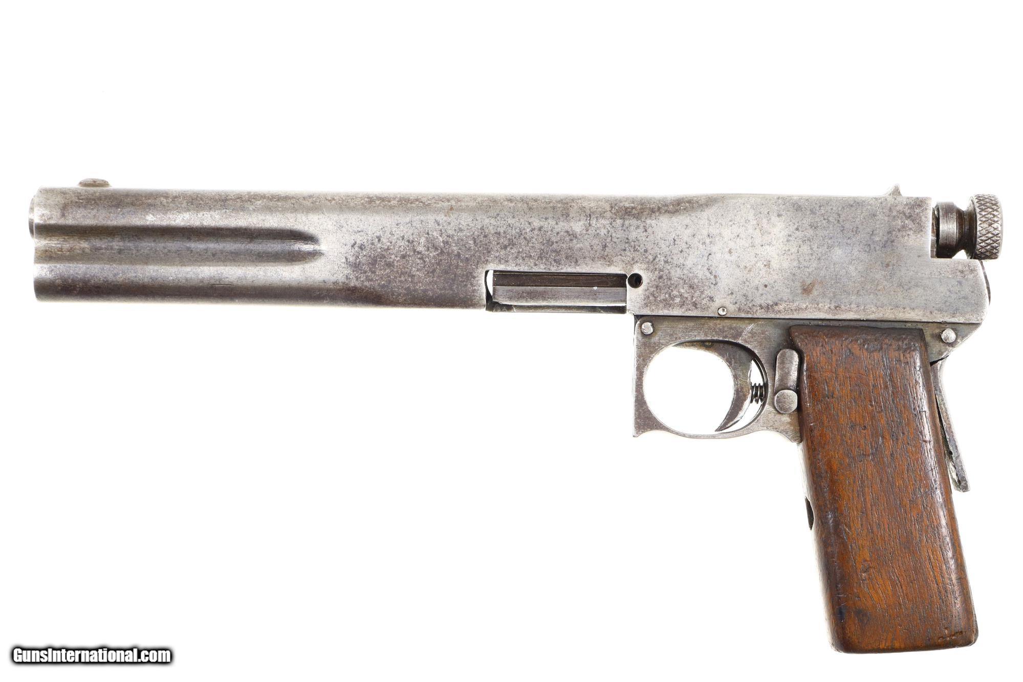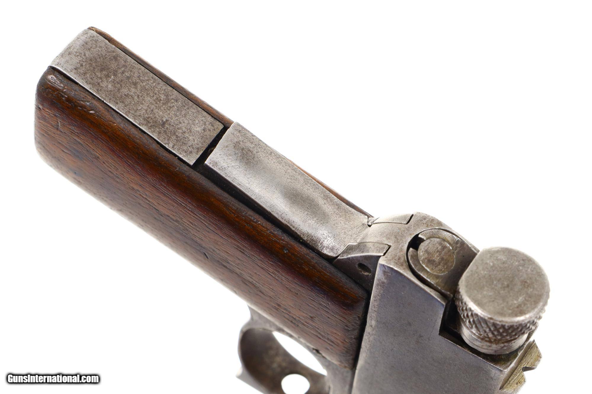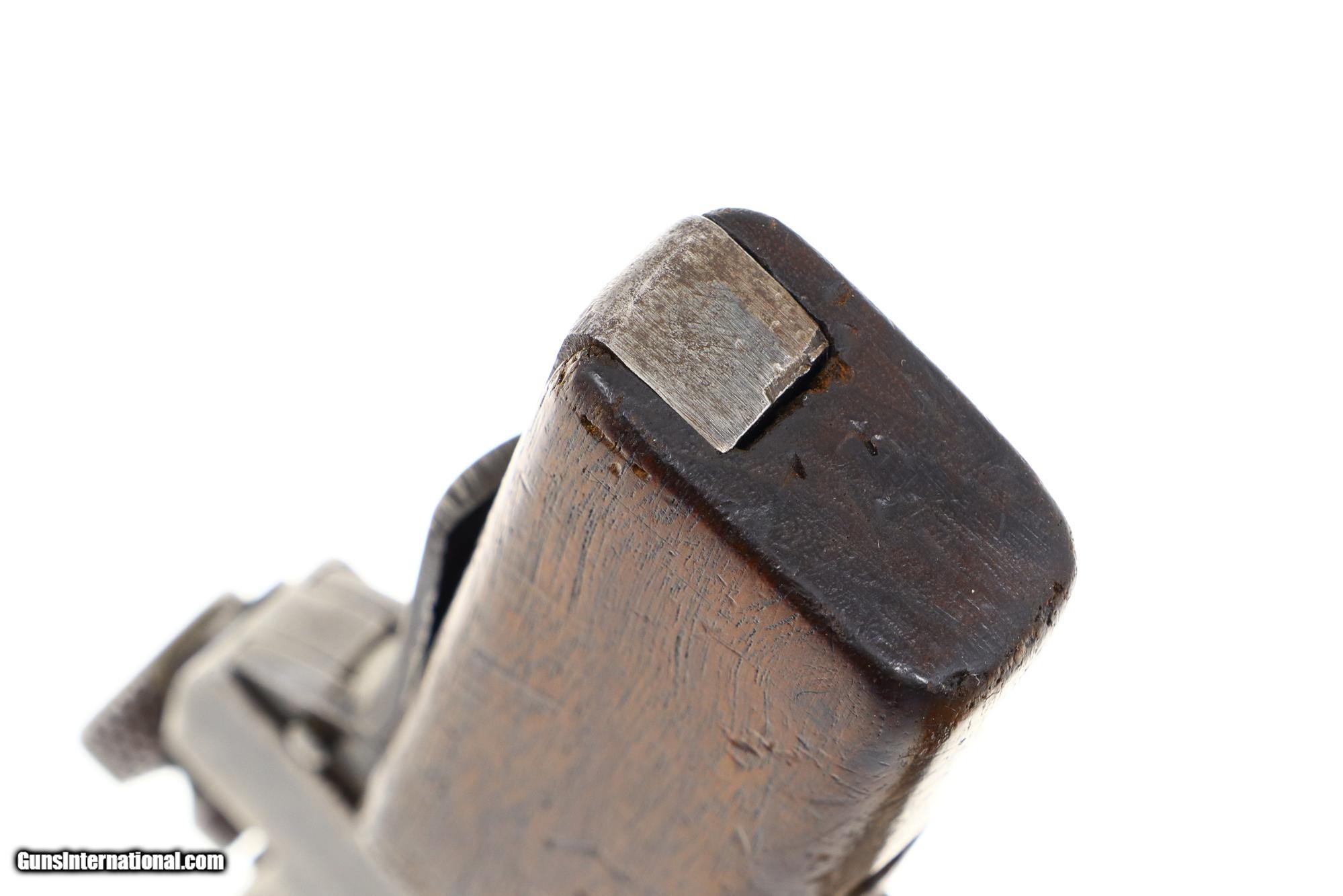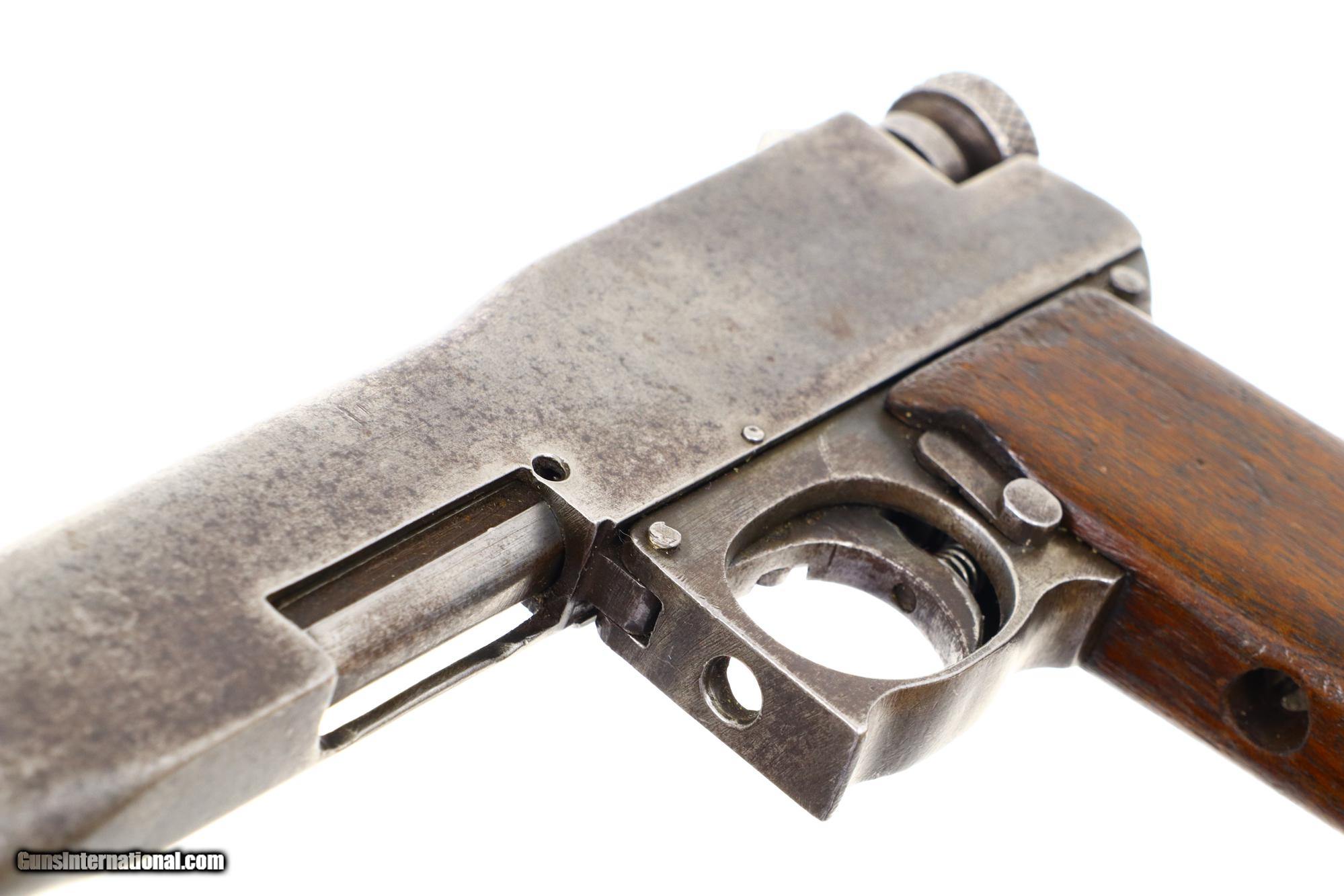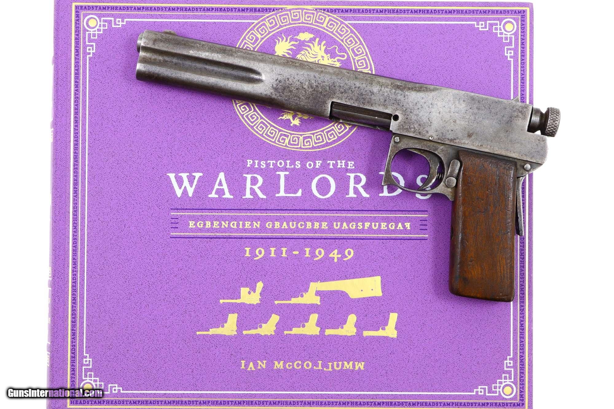 Description: This incredibly large semiautomatic pistol, entirely unmarked, is based on the FN 1900 in having the recoil assembly within a tube overlaying the barrel that would likely have been fitted with a sleeved insert. Functions as a single action blowback with a round knurled cocking nob and an unusually heavy extended bolt. Operates with rotating safety on the left frame and an additional grip safety. Magazine and associated attachment parts are missing. Single wood piece grip fixed in place by a screw in frontstrap. This EXACT pistol pictured in “Pistols of the Warlords” text by Ian McCollum on pages 196-197. Synopsis: Monstrous Chinese Arsenal, FN 1900 Derivative, Documented, 7.63mm, NSN, PCA-163 Condition: Largely a gray gun with little discernible finish. This is an incomplete gun so manual function can not be checked. One of the largest and certainly most unusual Chinese pistols encountered, particularly nice that it has been featured in the most widely distributed reference text covering this genre. Well deserving of more research. NOT TO BE FIRED!! NOT TO BE FIRED!! NOT TO BE FIRED!! ~~Insured shipping fee of $65; most packages shipped using FedEx 2nd Day.~~ SOLD Manufacturer: Chinese Arsenal Serial Number: NSN Caliber Info: 7.63 |