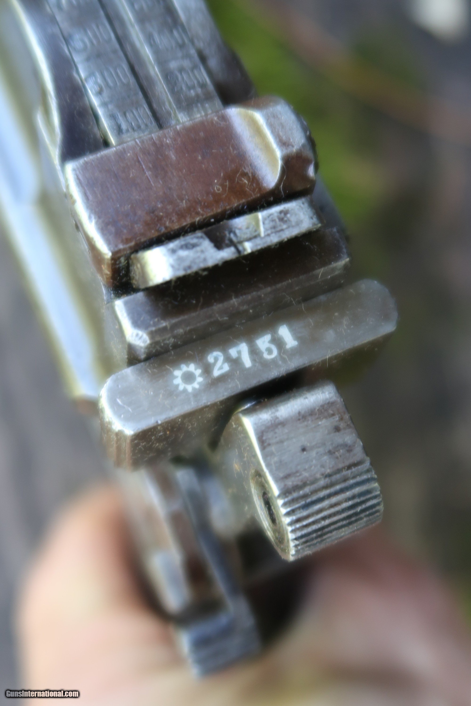 Description: Rare, original production, Chinese Shansei Arsenal manufactured variation of the Mauser C96 Broomhandle in .45 ACP, a massive firearm whose production limited to approximately 8000 pistols. SN: 2751 Cal: .45 ACP. Standard configuration Shansei Type 17, with 5.5 inch barrel having fixed front sight and tangent rear sight graduated from 50-1000. Left panel translates to "Type 17". The right panel references the arsenal and production year in 1928. All visible small parts are matching with lightly applied import marks on the left frame under the grip. The left grip is unnumbered; the right grip is penciled "x561". Lanyard stud but no lanyard ring. Condition: Good-VG with approximately 40% blue, the balance having transitioned to a mellow patina or faded to gray. Comparable condition grips. Bright bore. Perfect manual mechanics. A rare opportunity to own the largest and most charismatic of the Chinese-made Broomhandles, a true Holy Grail for those interested in C96s or Chinese Warlord pistols. Buyer responsible for a flat shipping fee of $155 (Fed Ex 2nd day). SOLD Curio/Relic: Yes Manufacturer: Chinese Mauser Model: C96 |