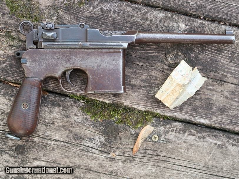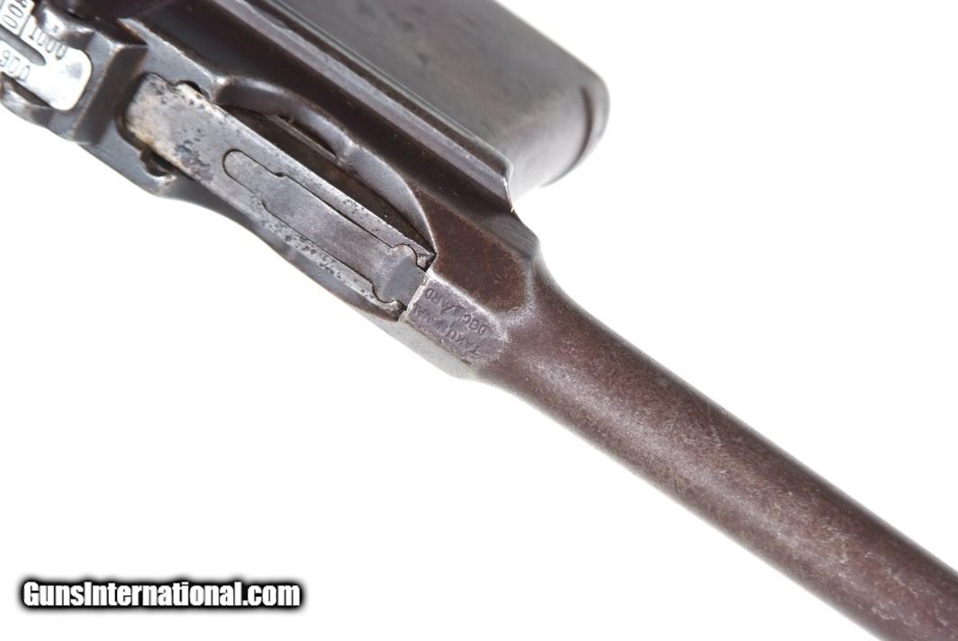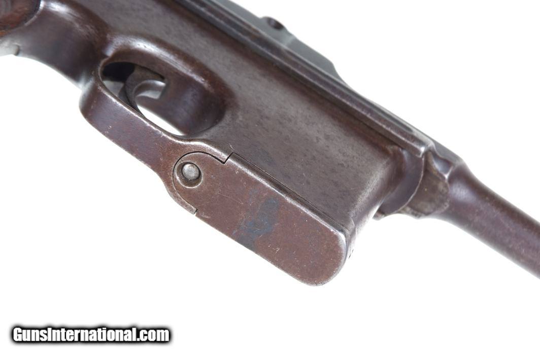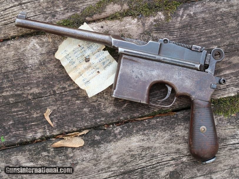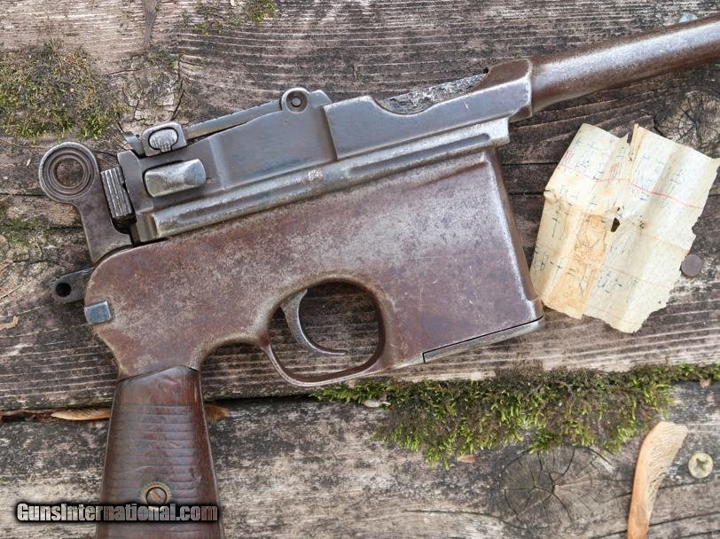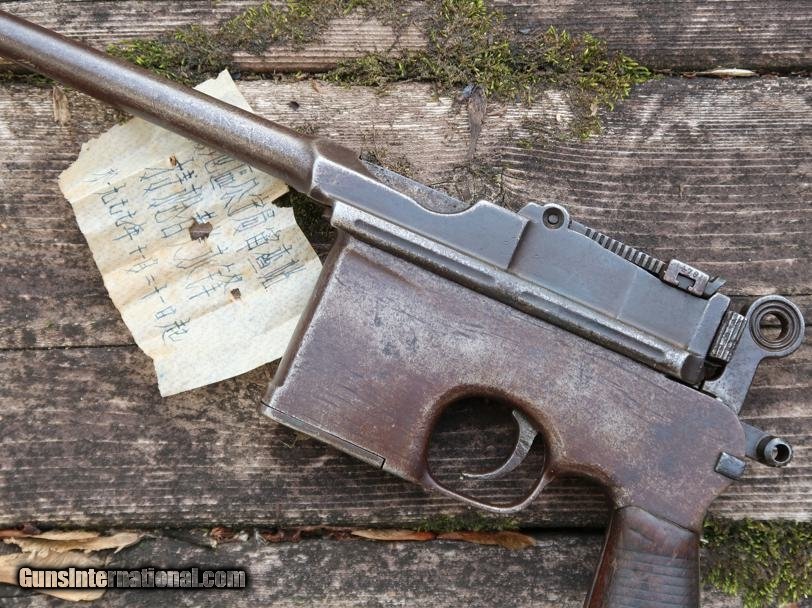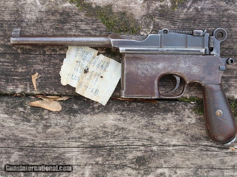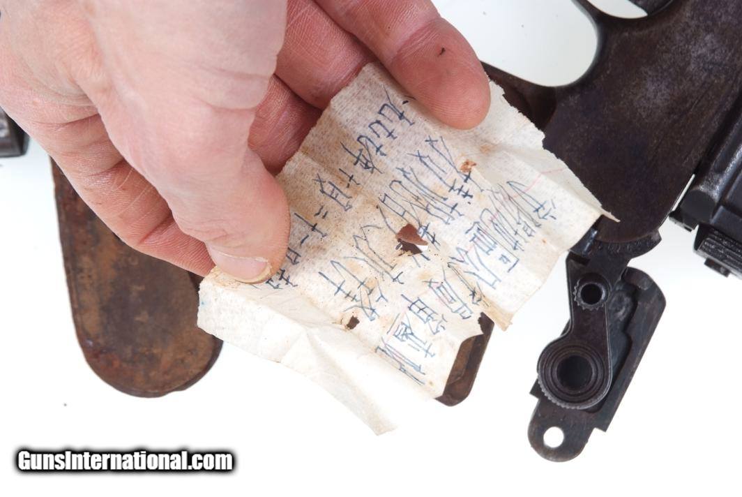 Description: Synopsis: Chinese Taku Naval Dockyard Flatside C96 with Ownership Documentation. Description: Standard configuration Taku Naval Dockyard Flatside with 5.5'' barrel having fixed front sight and slip in 50-1000 graduated rear sight. Chamber marked "TAKU NAVAL DOCKYARD". Short extractor, two lug firing pin, full serial number on back of barrel extension and frame with the last few digits on the back of the hammer, transfer bar, sear, follower, floor-plate, and each of the grips. Unnumbered bolt and and subframe, locking block #8554. Under the grips was a thin piece of onion skin paper with markings as photographed, underscoring ownership to a Chinese Police Officer, the note having been dated Nov 21, 1977. See video for details: ://youtube/watch?v=hzWveM_JAVA Condition: VG with browning of the barrel and frame, a little more blue remaining on the barrel extension. Several components including the bolt, safety, and subframe have been re-dipped and barrel extension lug shows an old repair. Comparable condition original and matching grips. Dark bore with shallow rifling. Perfect manual mechanics. An interesting and largely matching Taku Naval Flatside with an interesting history as conveyed by the accompanying documentation. SOLD Manufacturer: Taku Naval Model: C96 Serial Number: 1478 Caliber Info: 7.63 Condition: G |