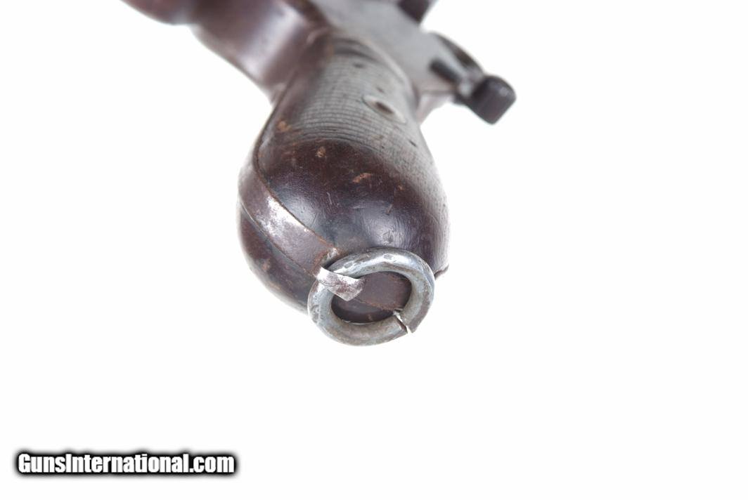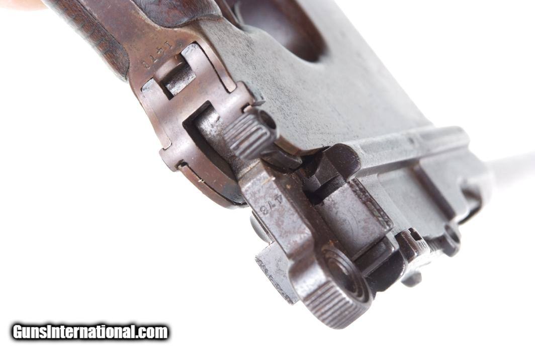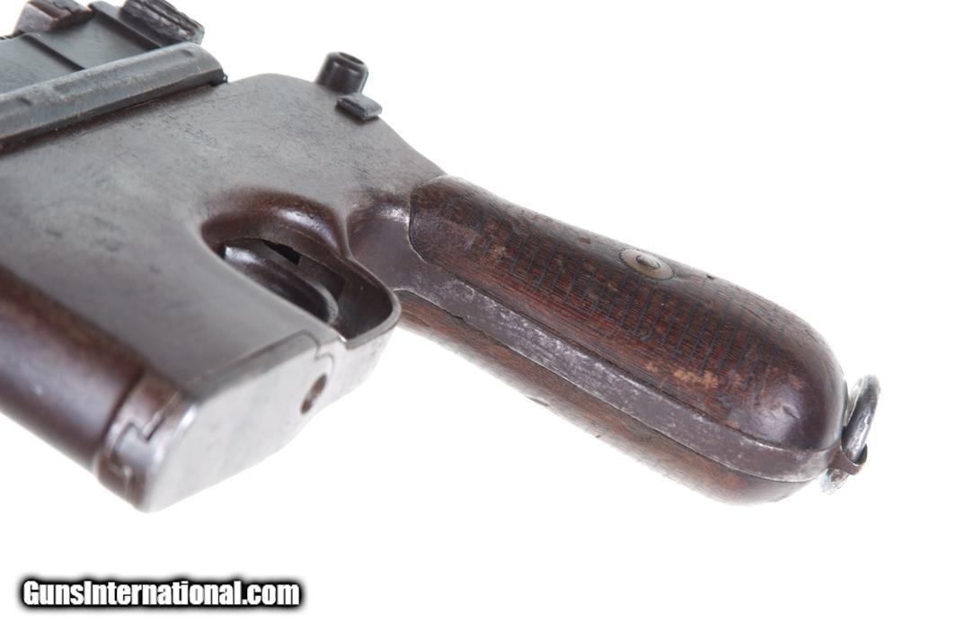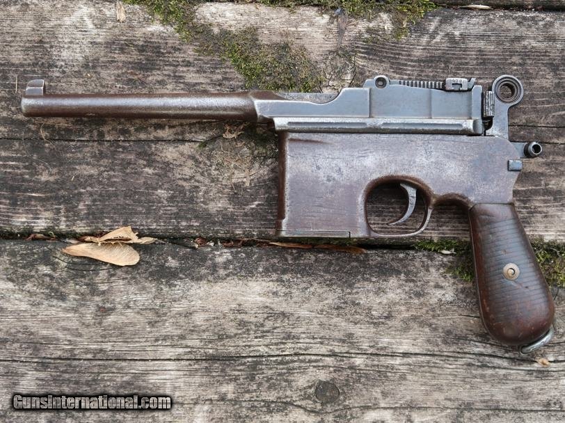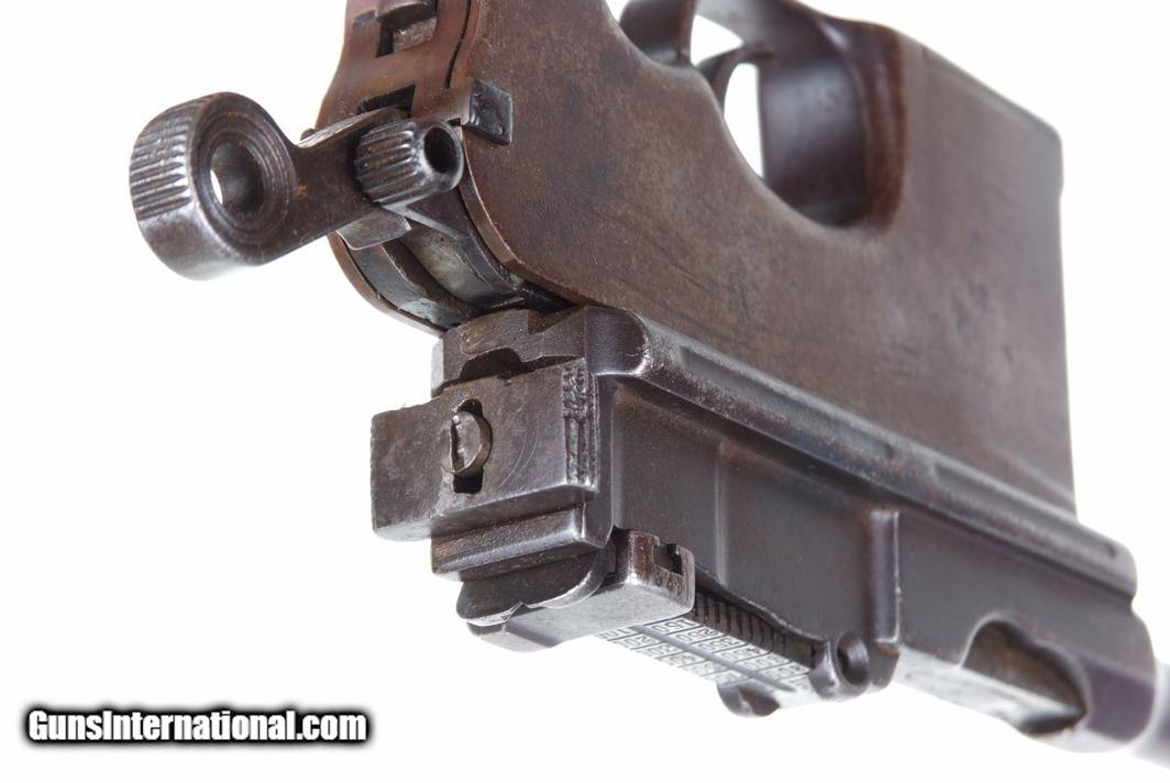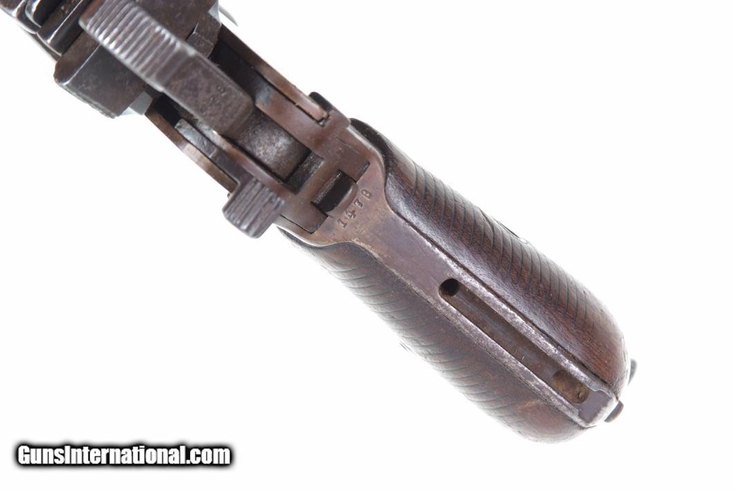 Description: Synopsis: Chinese Taku Naval Dockyard Flatside C96 with Ownership Documentation. Description: Standard configuration Taku Naval Dockyard Flatside with 5.5'' barrel having fixed front sight and slip in 50-1000 graduated rear sight. Chamber marked "TAKU NAVAL DOCKYARD". Short extractor, two lug firing pin, full serial number on back of barrel extension and frame with the last few digits on the back of the hammer, transfer bar, sear, follower, floor-plate, and each of the grips. Unnumbered bolt and and subframe, locking block #8554. Under the grips was a thin piece of onion skin paper with markings as photographed, underscoring ownership to a Chinese Police Officer, the note having been dated Nov 21, 1977. See video for details: ://youtube/watch?v=hzWveM_JAVA Condition: VG with browning of the barrel and frame, a little more blue remaining on the barrel extension. Several components including the bolt, safety, and subframe have been re-dipped and barrel extension lug shows an old repair. Comparable condition original and matching grips. Dark bore with shallow rifling. Perfect manual mechanics. An interesting and largely matching Taku Naval Flatside with an interesting history as conveyed by the accompanying documentation. SOLD Manufacturer: Taku Naval Model: C96 Serial Number: 1478 Caliber Info: 7.63 Condition: G |