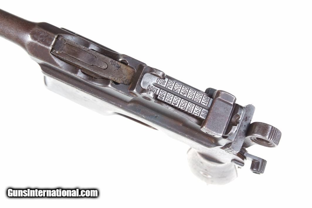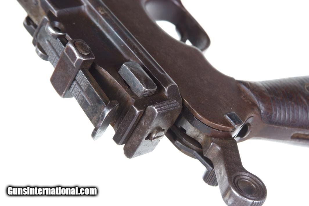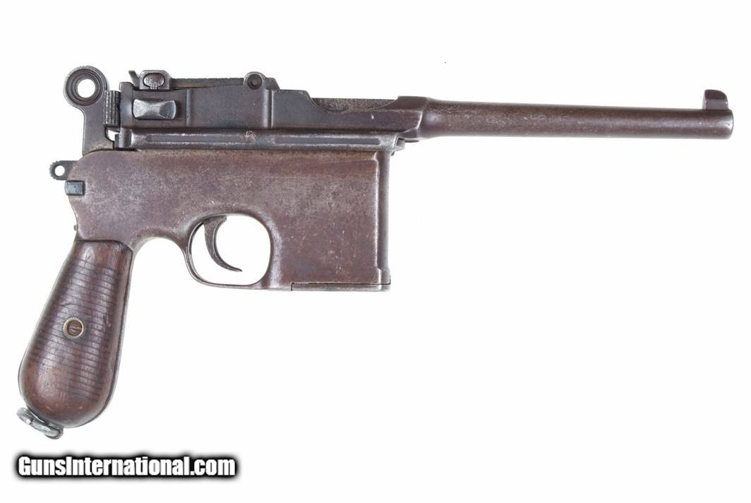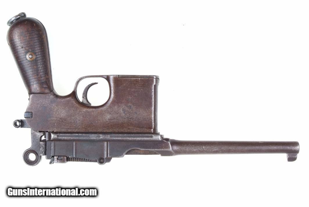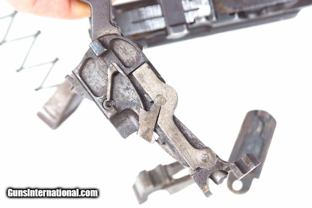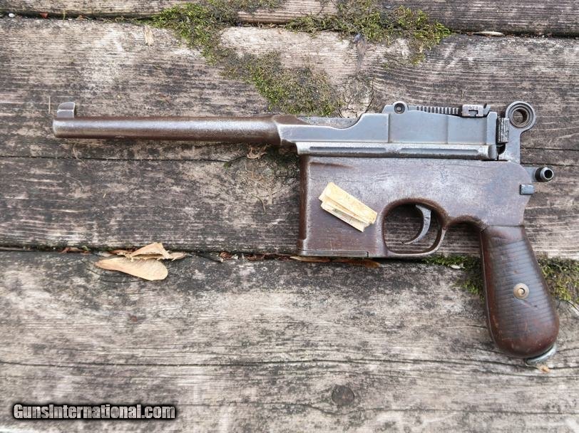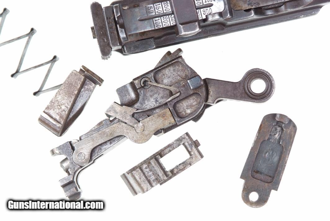 Description: Synopsis: Chinese Taku Naval Dockyard Flatside C96 with Ownership Documentation. Description: Standard configuration Taku Naval Dockyard Flatside with 5.5'' barrel having fixed front sight and slip in 50-1000 graduated rear sight. Chamber marked "TAKU NAVAL DOCKYARD". Short extractor, two lug firing pin, full serial number on back of barrel extension and frame with the last few digits on the back of the hammer, transfer bar, sear, follower, floor-plate, and each of the grips. Unnumbered bolt and and subframe, locking block #8554. Under the grips was a thin piece of onion skin paper with markings as photographed, underscoring ownership to a Chinese Police Officer, the note having been dated Nov 21, 1977. See video for details: ://youtube/watch?v=hzWveM_JAVA Condition: VG with browning of the barrel and frame, a little more blue remaining on the barrel extension. Several components including the bolt, safety, and subframe have been re-dipped and barrel extension lug shows an old repair. Comparable condition original and matching grips. Dark bore with shallow rifling. Perfect manual mechanics. An interesting and largely matching Taku Naval Flatside with an interesting history as conveyed by the accompanying documentation. SOLD Manufacturer: Taku Naval Model: C96 Serial Number: 1478 Caliber Info: 7.63 Condition: G |