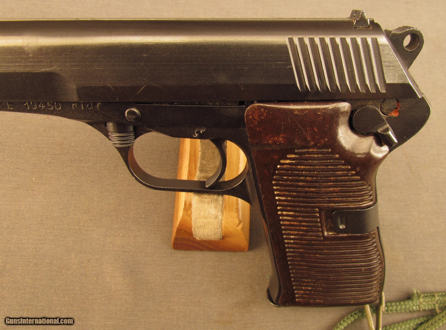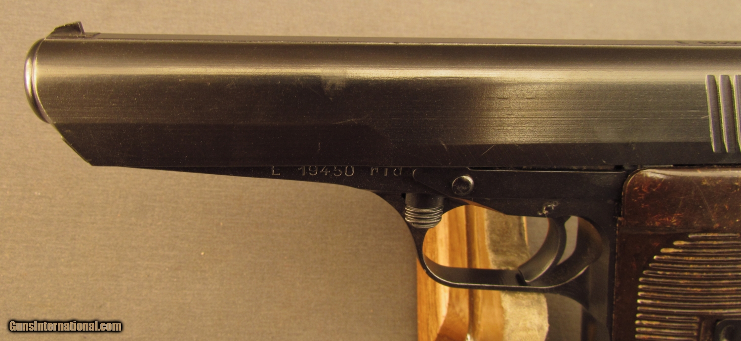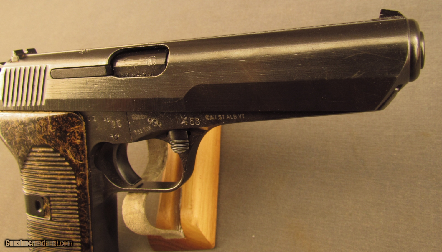 Description: Serial #E19450, 7.62mm Tokarev, 4” barrel with an excellent, bright bore. This is an “rid” coded, 1953 made pistol that has matching numbers on the frame, slide, and barrel and retains 98-99% of the arsenal re-applied blue finish which has only some very mild fading along a few of the high edges and bearing surfaces. There is a C.A.I. import marking on the right side of the frame and the grooved brown resin grips are in excellent condition with only a few very minor scratches and handling marks on either panel (the left panel is slightly more reddish in color than the right). The pistol comes complete with an original 1995 dated, pale leather Czech military holster with a single magazine and the green nylon lanyard. These are well-made Czech pistols, designed to handle a potent cartridge. FFL or C&R SOLD Curio/Relic: Yes Manufacturer: CZ Model: 52 Serial Number: E19450 Caliber Info: 7.62mm Gauge Info: 7.62mm |