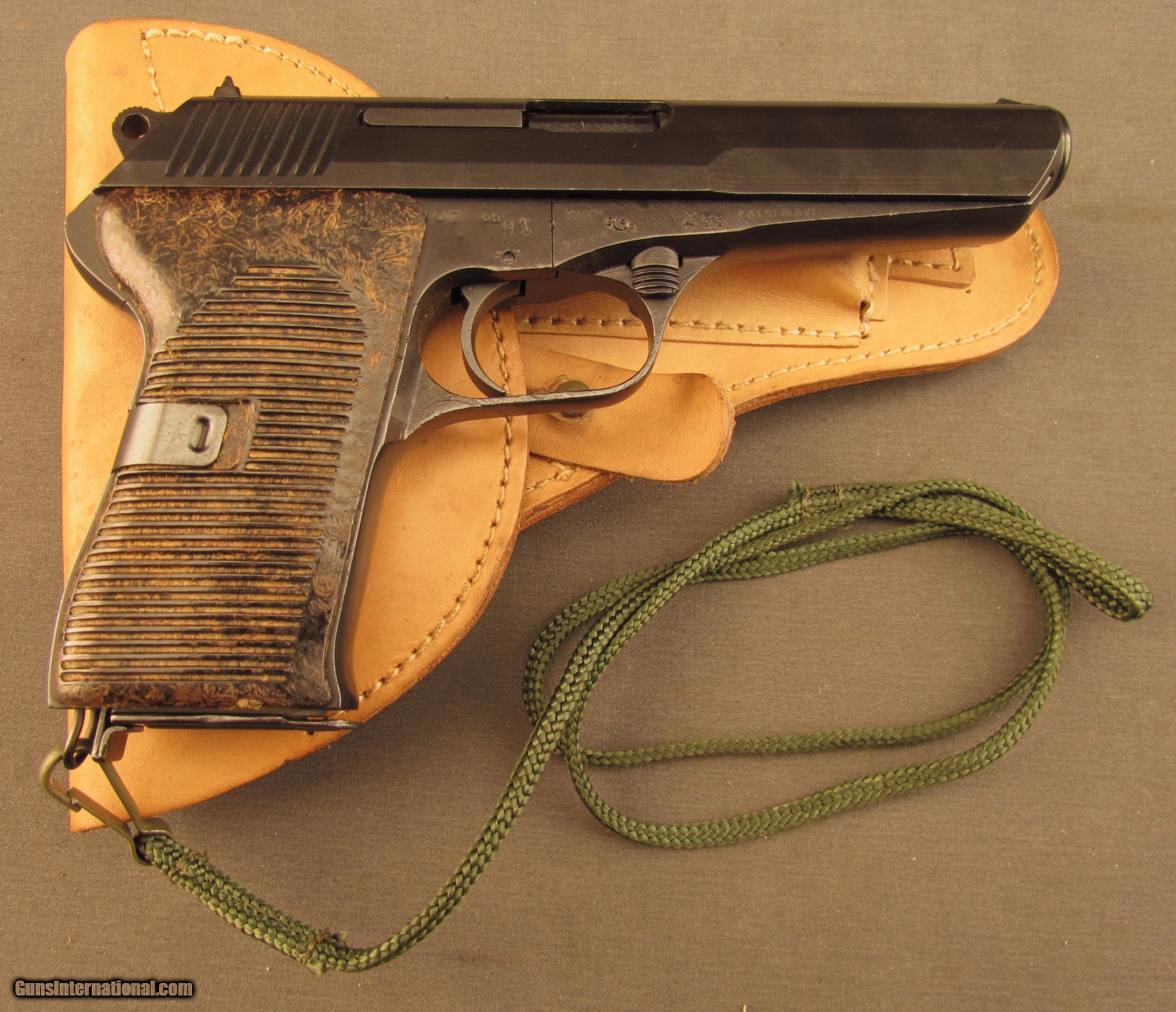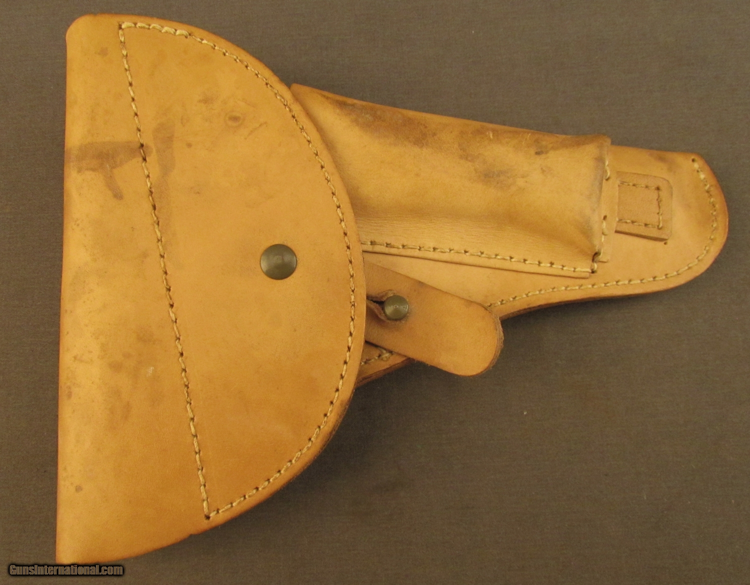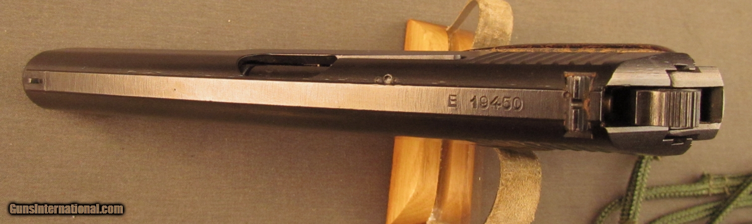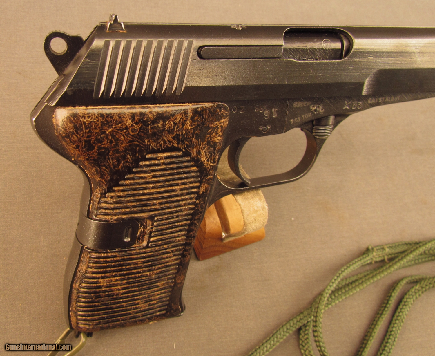 Description: Serial #E19450, 7.62mm Tokarev, 4” barrel with an excellent, bright bore. This is an “rid” coded, 1953 made pistol that has matching numbers on the frame, slide, and barrel and retains 98-99% of the arsenal re-applied blue finish which has only some very mild fading along a few of the high edges and bearing surfaces. There is a C.A.I. import marking on the right side of the frame and the grooved brown resin grips are in excellent condition with only a few very minor scratches and handling marks on either panel (the left panel is slightly more reddish in color than the right). The pistol comes complete with an original 1995 dated, pale leather Czech military holster with a single magazine and the green nylon lanyard. These are well-made Czech pistols, designed to handle a potent cartridge. FFL or C&R SOLD Curio/Relic: Yes Manufacturer: CZ Model: 52 Serial Number: E19450 Caliber Info: 7.62mm Gauge Info: 7.62mm |