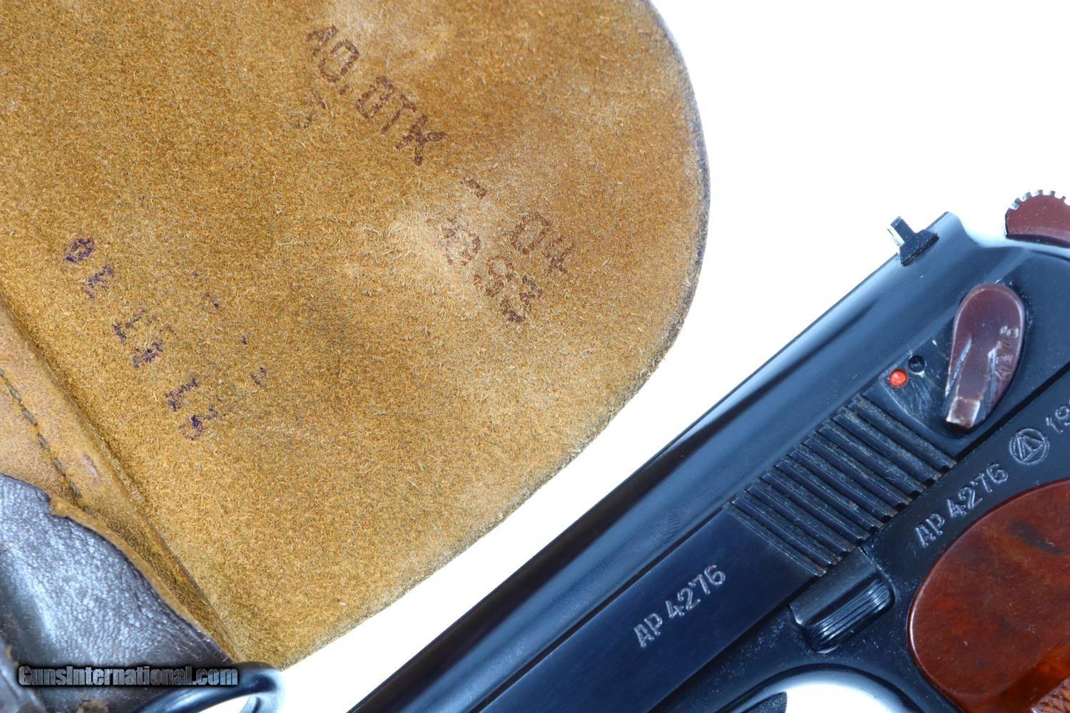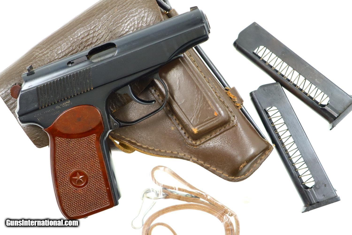 Virtually new, Russian Military Makarov Rig, made 1963, with two factory matching magazines and later dated holster/rod. Pistol has fixed front sight and drift adjustable rear sight. Full serial number on left side of slide, safety, left side of frame, with last 4 digits repeated in front of trigger guard. Two original factory-matching magazines sub numbered "1" and "2". Izhevsk Arsenal marking on left side of frame. Import markings as imaged. Single piece reddish maroon plastic grip with two checkered panels impressed with encircled 5 pointed star. Later Russian holster, with cleaning rod and leather lanyard strap, dated 93.