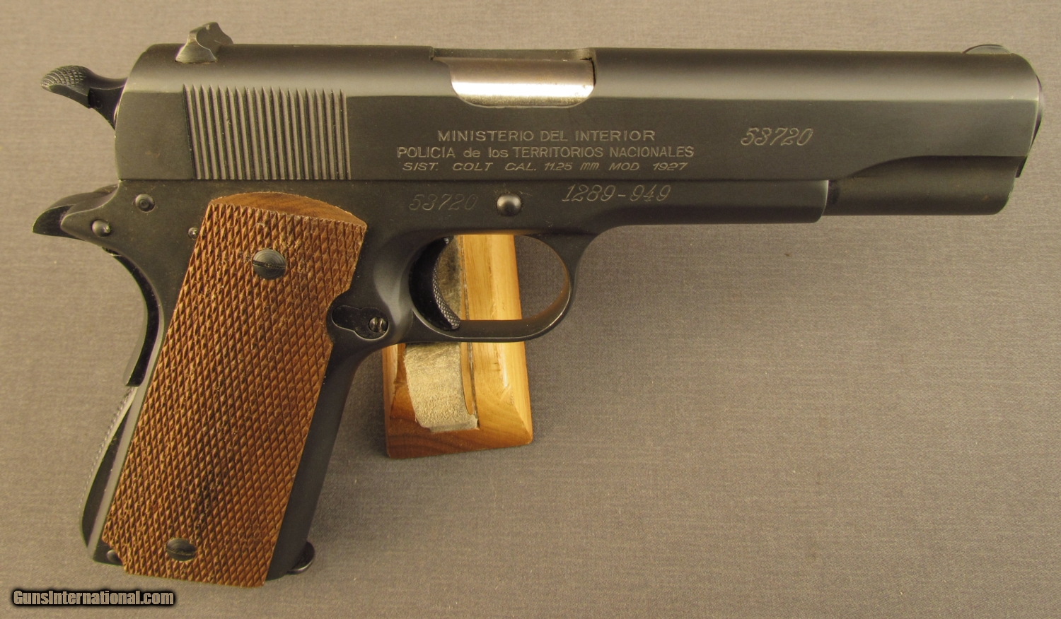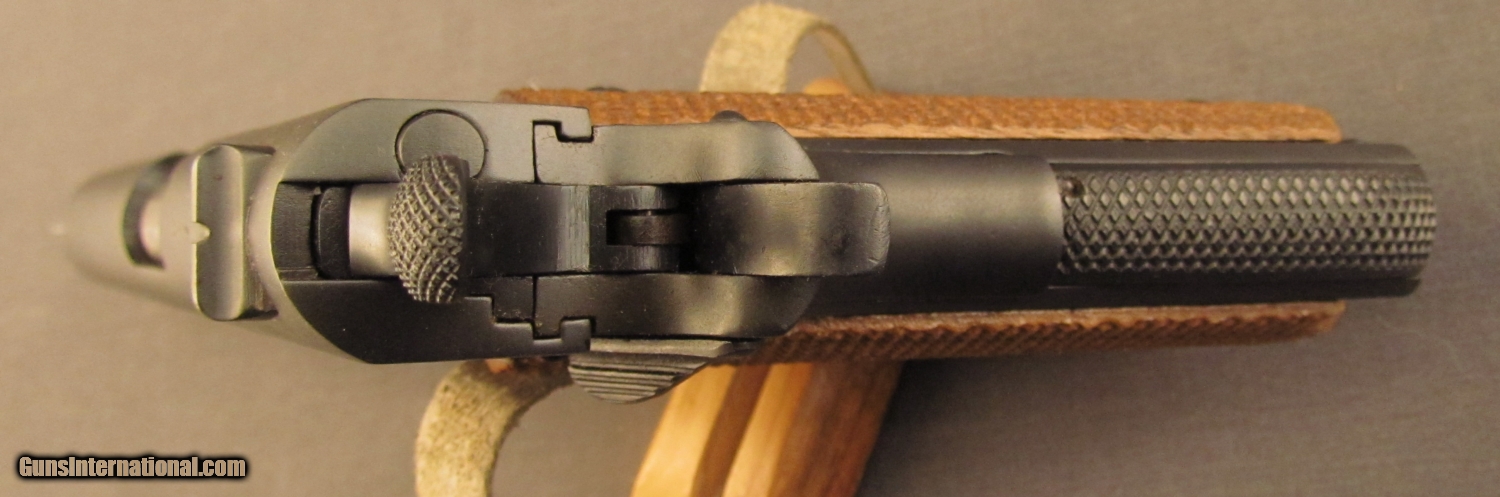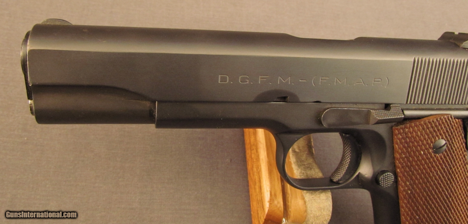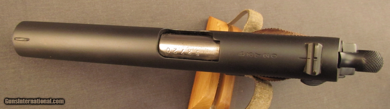 Description: Serial #53720, .45 ACP, 5” barrel with an excellent, bright bore. This is a licensed copy of the venerable U.S. Model 1911A1 pistol and has matching numbers on the frame, slide, and barrel. The metal retains practically all of an extremely well done, re-applied Du-Lite finish that only has a few spots of light surface wear scattered about. A very small and unobtrusive import stamp is present on the left side of the frame, just behind the magazine release. The checkered wooden grips are not original to the gun and are in excellent, little-used condition with virtually no flattening of the points. The pistol is accompanied by an original Model 1927 magazine, numbered to a different gun (101398). These are extremely well-made pistols and this reconditioned example should make a fabulous shooter. FFL or C&R SOLD Curio/Relic: Yes Manufacturer: Argentine Model: 1927 Serial Number: 53720 Caliber Info: .45 ACP Gauge Info: .45 ACP |