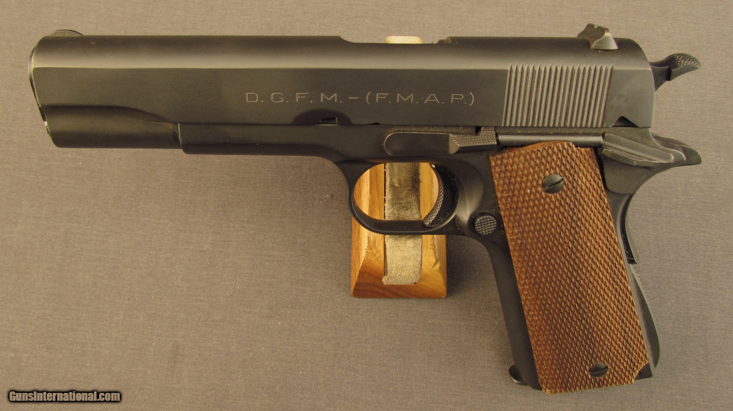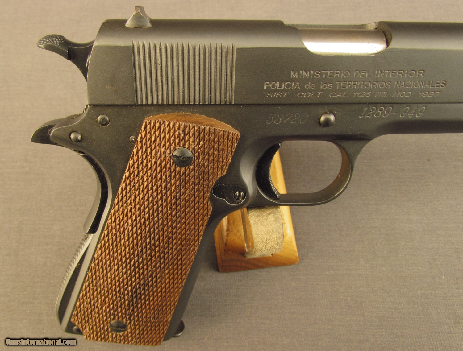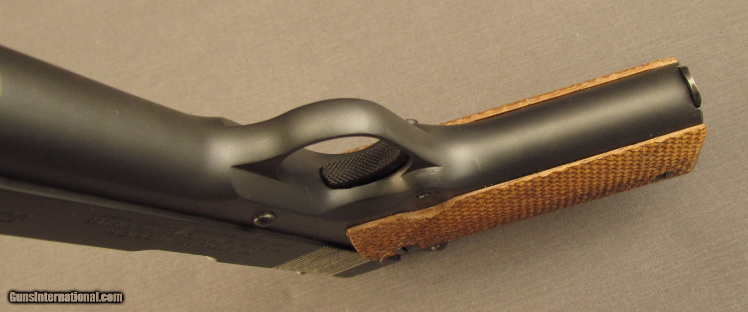 Description: Serial #53720, .45 ACP, 5” barrel with an excellent, bright bore. This is a licensed copy of the venerable U.S. Model 1911A1 pistol and has matching numbers on the frame, slide, and barrel. The metal retains practically all of an extremely well done, re-applied Du-Lite finish that only has a few spots of light surface wear scattered about. A very small and unobtrusive import stamp is present on the left side of the frame, just behind the magazine release. The checkered wooden grips are not original to the gun and are in excellent, little-used condition with virtually no flattening of the points. The pistol is accompanied by an original Model 1927 magazine, numbered to a different gun (101398). These are extremely well-made pistols and this reconditioned example should make a fabulous shooter. FFL or C&R SOLD Curio/Relic: Yes Manufacturer: Argentine Model: 1927 Serial Number: 53720 Caliber Info: .45 ACP Gauge Info: .45 ACP |