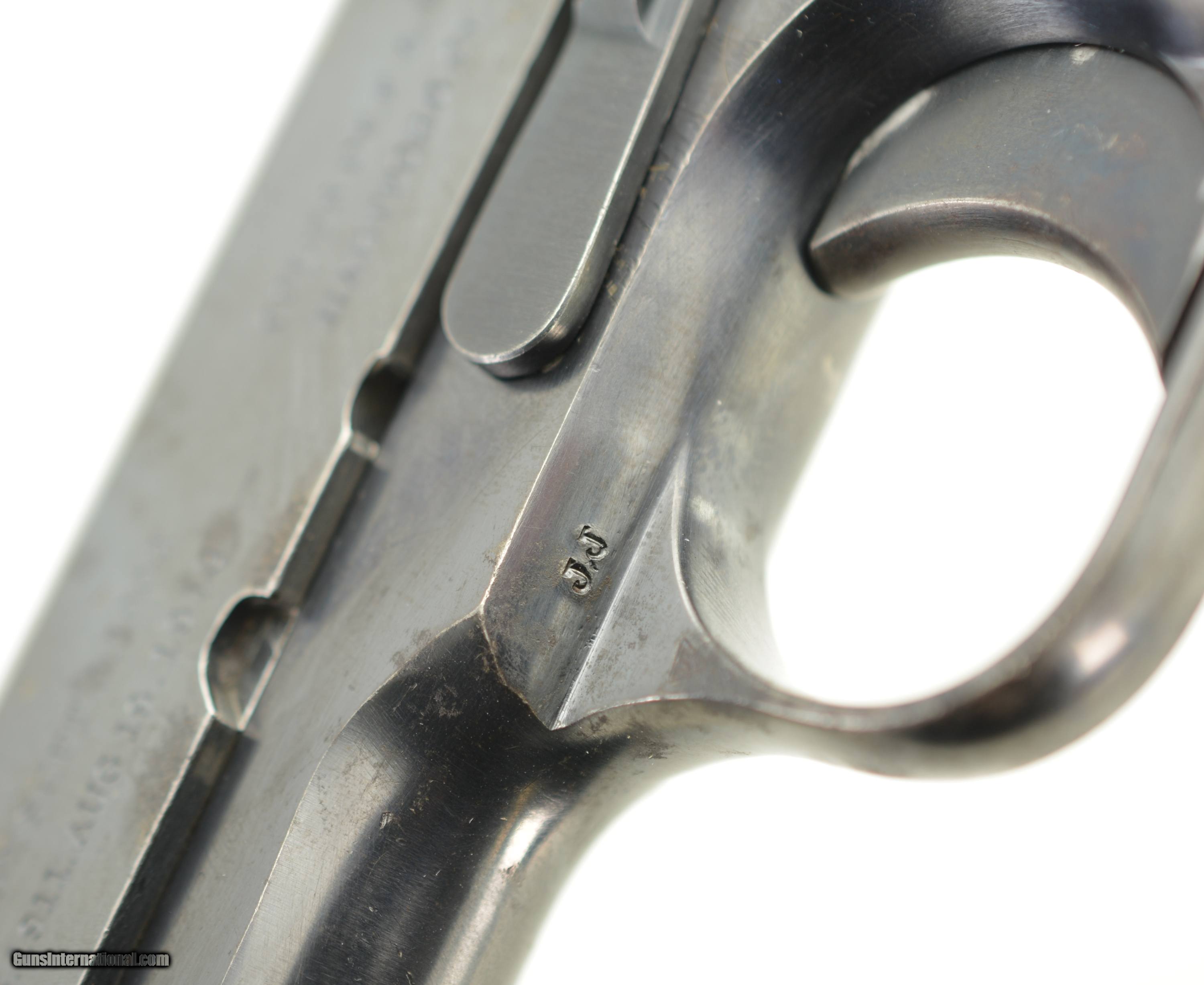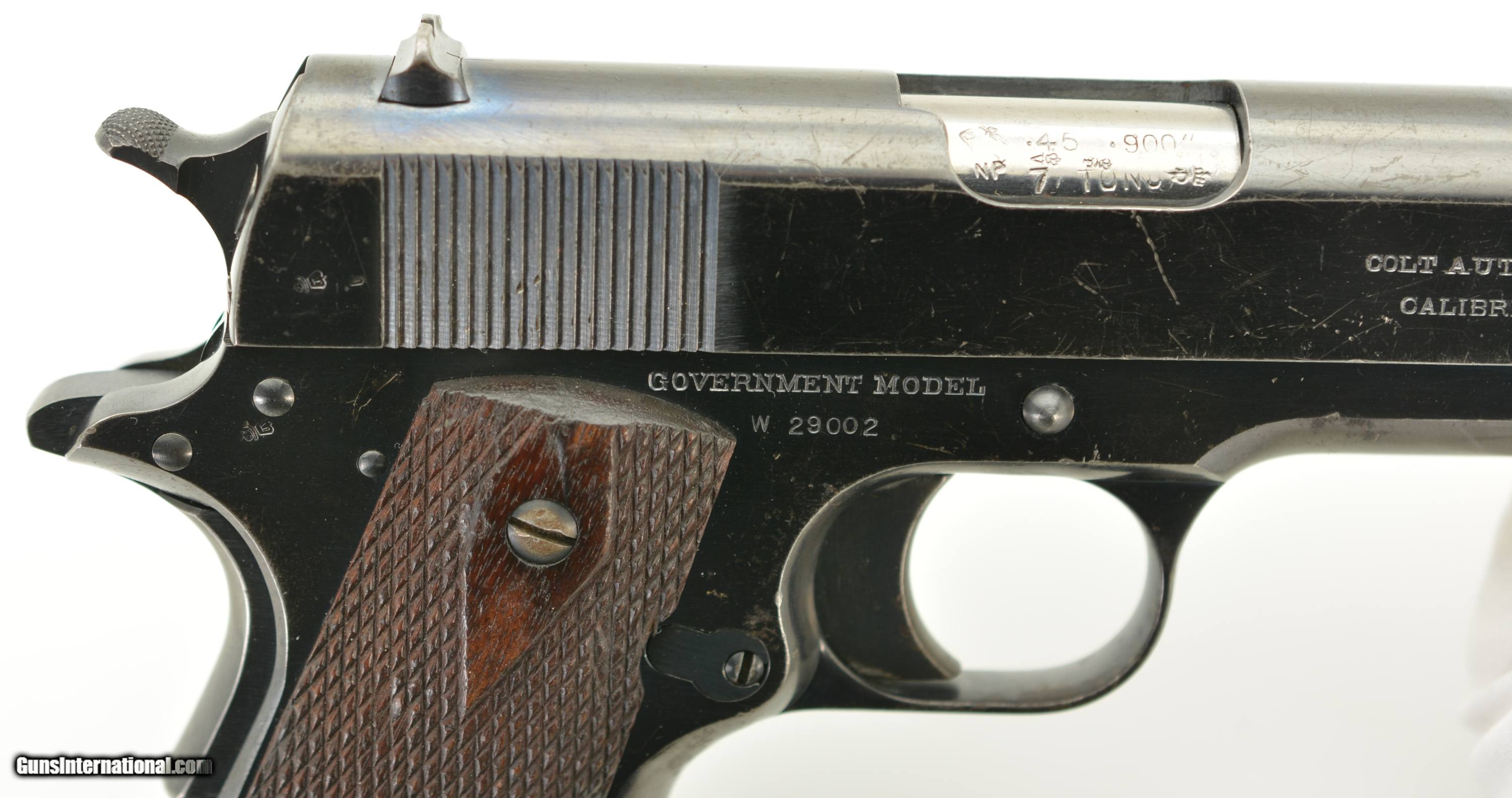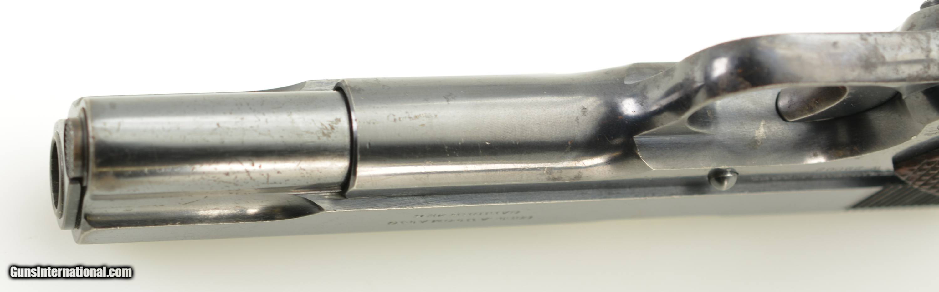 Description: Serial #W29002, .455 Webley Auto, 5" barrel with a fine, bright bore that has some mild freckling within the grooves. This is the second gun, by serial number, in the second block of guns purchased by London Armoury Co. in January of 1916 (serial block W29001 – W29444). LAC purchased the first 600 pistols shipped to Britain for private sale to officers, however no sales records survive. The pistol is remarkably well-preserved, and retains 95% plus of the original high polish blue finish, with silvering along the high and exposed edges, as well as numerous small handling marks and small blemishes on both the frame and slide. The pistol has the distinct "JJ" stamp on the underside of the frame on the left side, along with numerous London proofs, especially on the characteristically polished breech. The checkered, double-diamond grips are in very good shape with moderate flattening of the points, as well as two distinct notches cut into the bottom of the left grip. A single, correct, "CAL .455 / ELEY" marked, lanyard loop magazine is included. This is a fantastic example of a rare, correct .455 Government Model pistol, and is in fine-excellent condition. FFL or C&R SOLD Curio/Relic: Yes Manufacturer: Colt Model: 1911 Serial Number: W29002 Caliber Info: .455 Gauge Info: .455 |