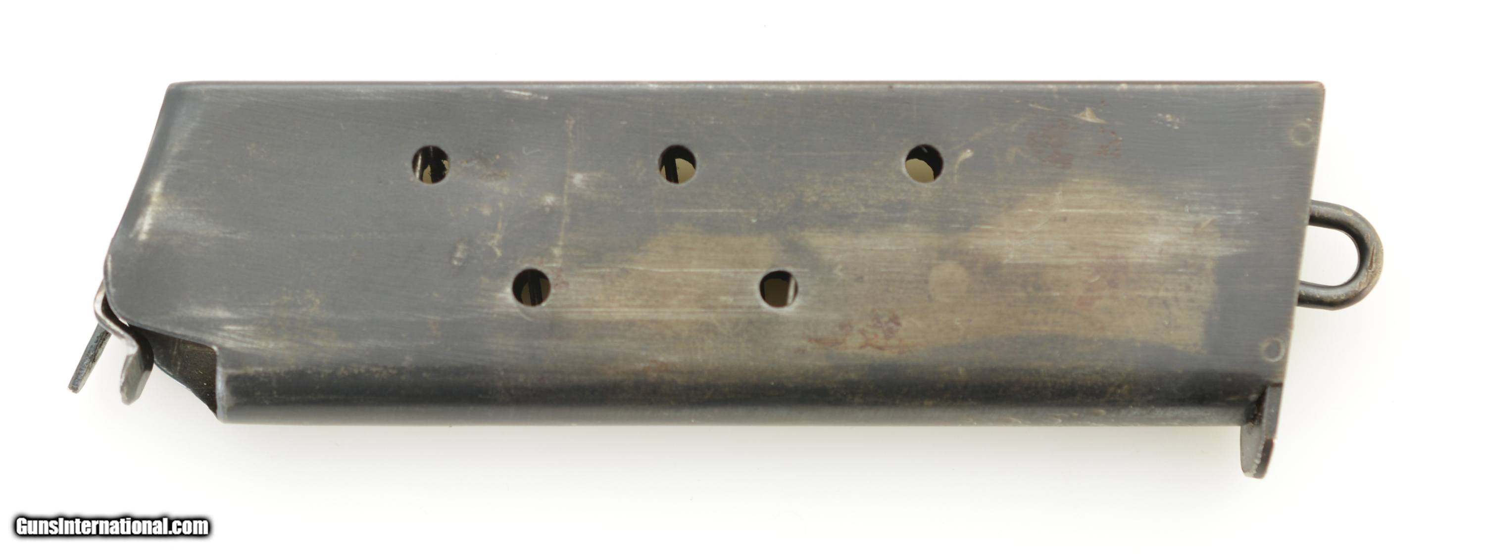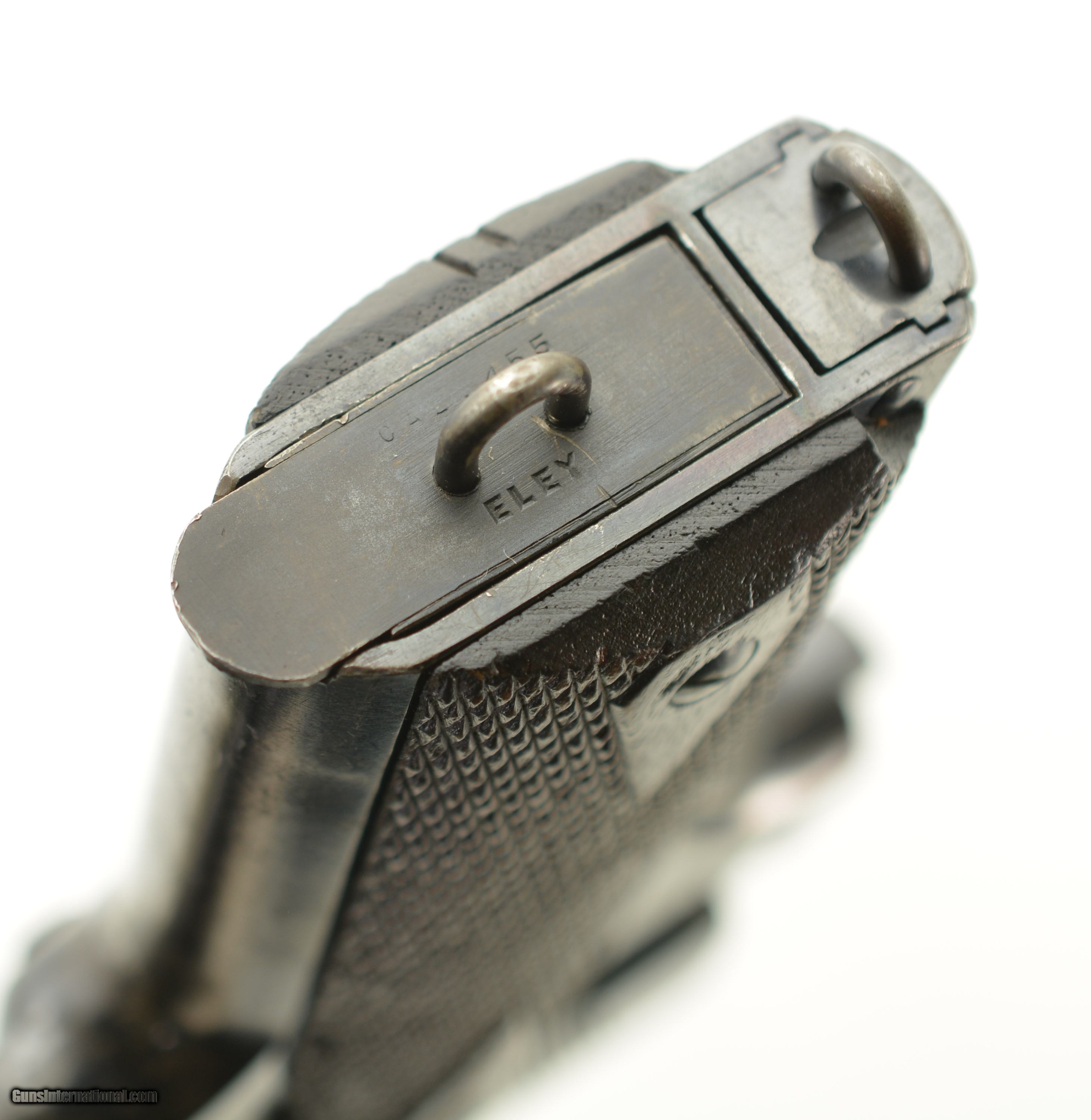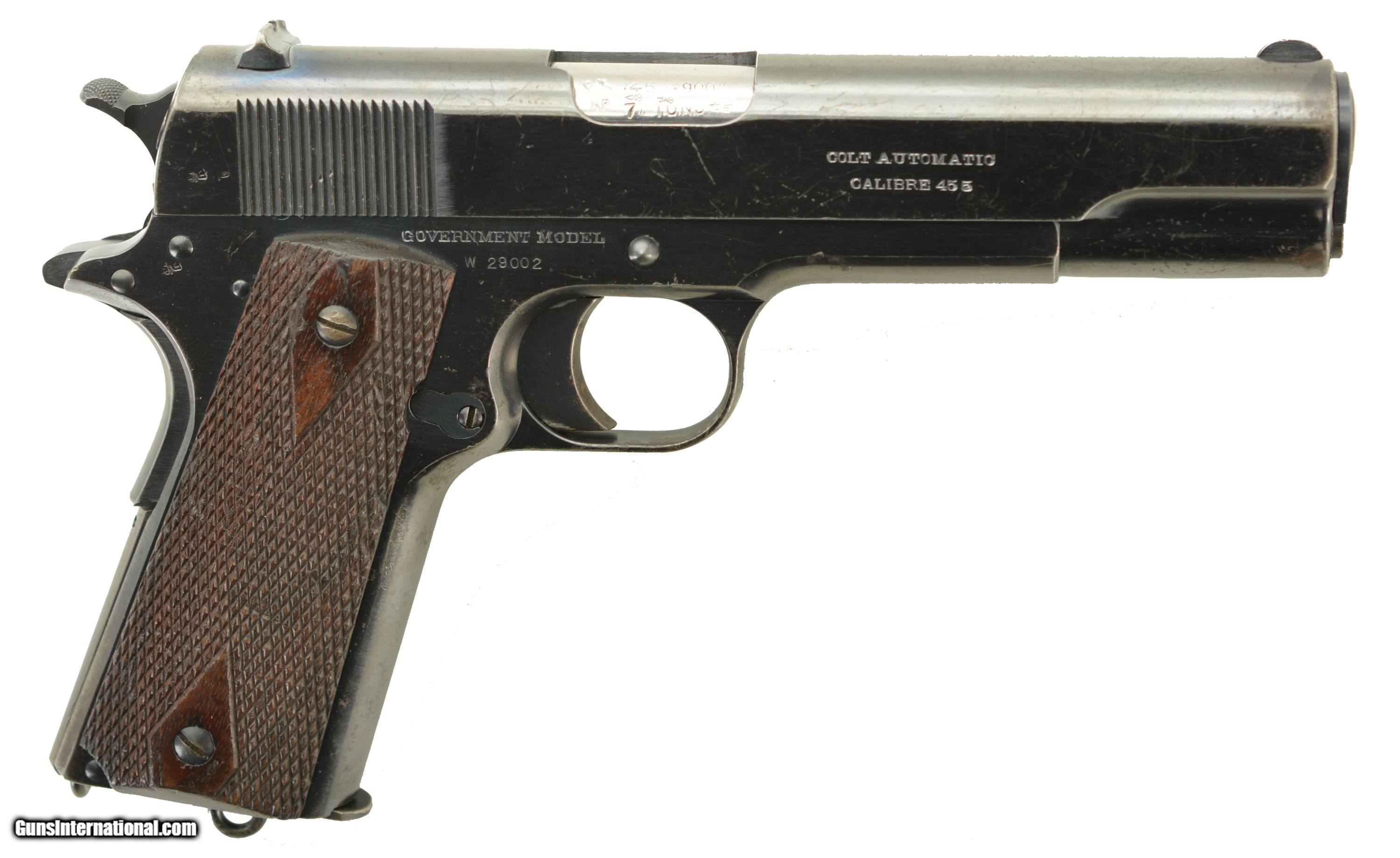 Description: Serial #W29002, .455 Webley Auto, 5" barrel with a fine, bright bore that has some mild freckling within the grooves. This is the second gun, by serial number, in the second block of guns purchased by London Armoury Co. in January of 1916 (serial block W29001 – W29444). LAC purchased the first 600 pistols shipped to Britain for private sale to officers, however no sales records survive. The pistol is remarkably well-preserved, and retains 95% plus of the original high polish blue finish, with silvering along the high and exposed edges, as well as numerous small handling marks and small blemishes on both the frame and slide. The pistol has the distinct "JJ" stamp on the underside of the frame on the left side, along with numerous London proofs, especially on the characteristically polished breech. The checkered, double-diamond grips are in very good shape with moderate flattening of the points, as well as two distinct notches cut into the bottom of the left grip. A single, correct, "CAL .455 / ELEY" marked, lanyard loop magazine is included. This is a fantastic example of a rare, correct .455 Government Model pistol, and is in fine-excellent condition. FFL or C&R SOLD Curio/Relic: Yes Manufacturer: Colt Model: 1911 Serial Number: W29002 Caliber Info: .455 Gauge Info: .455 |