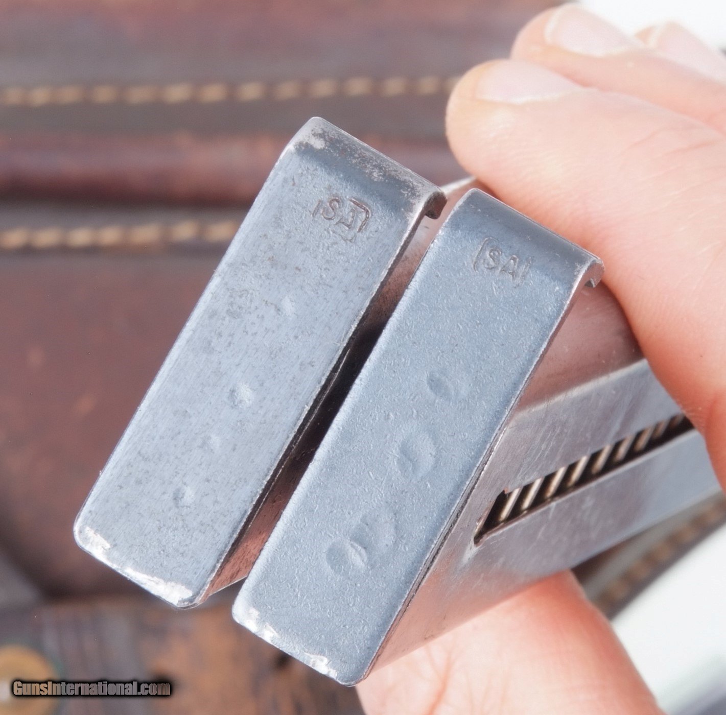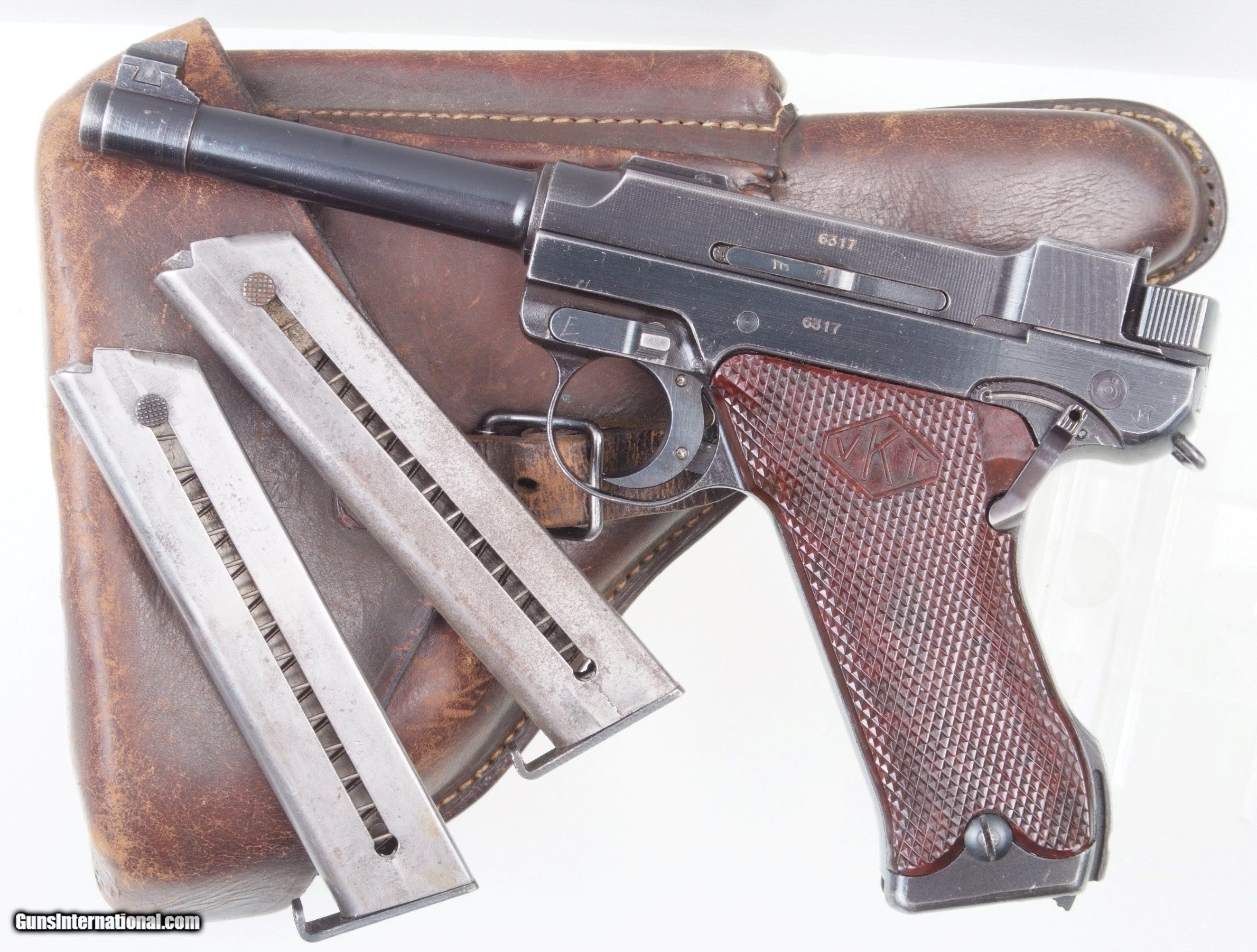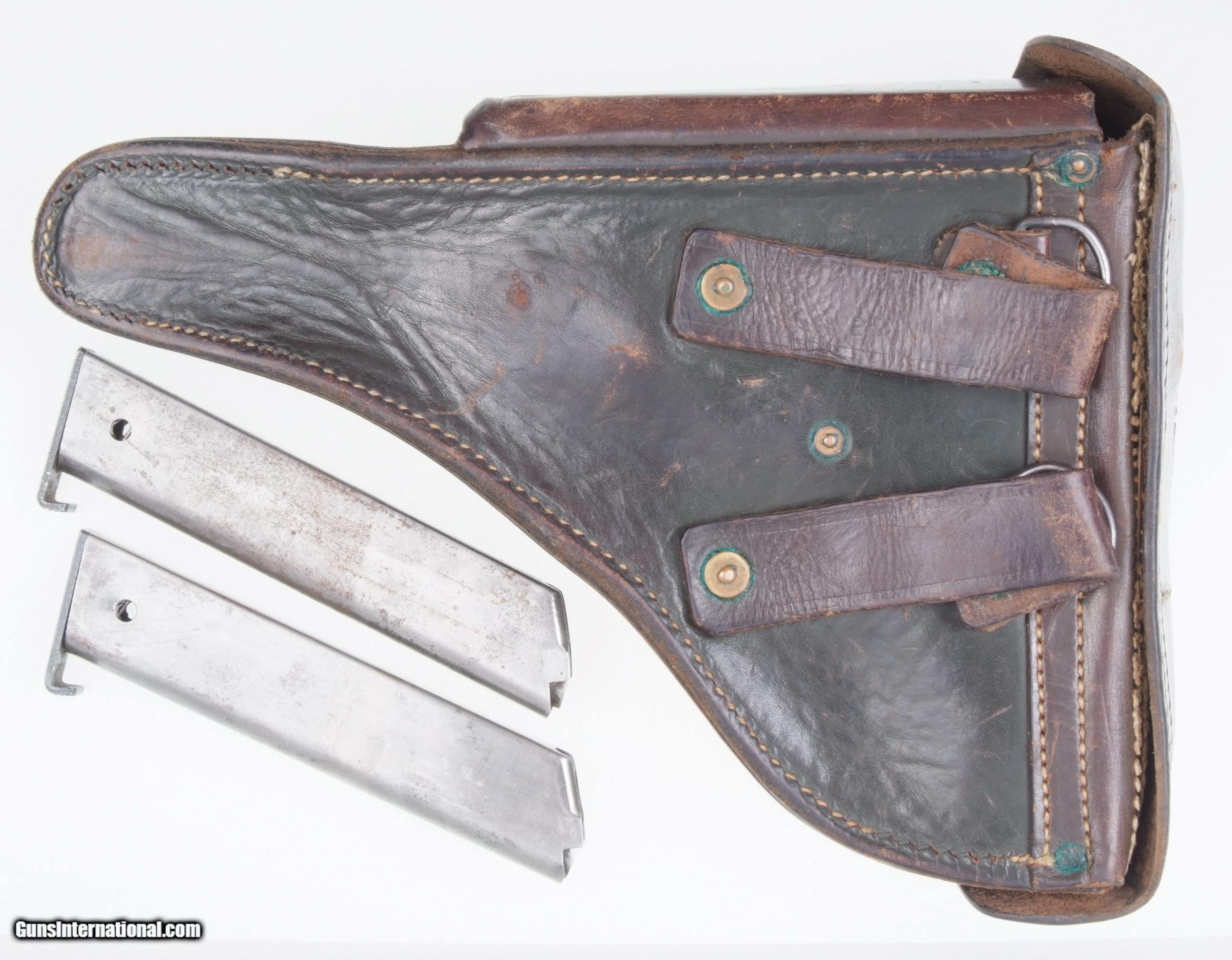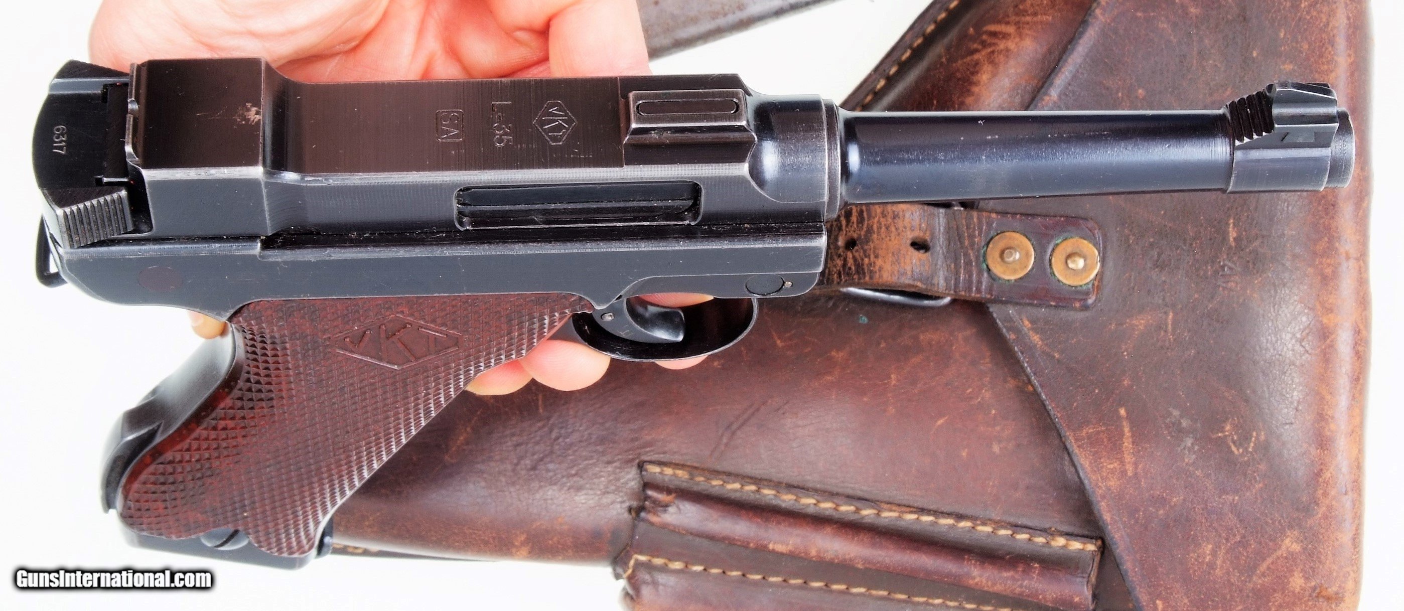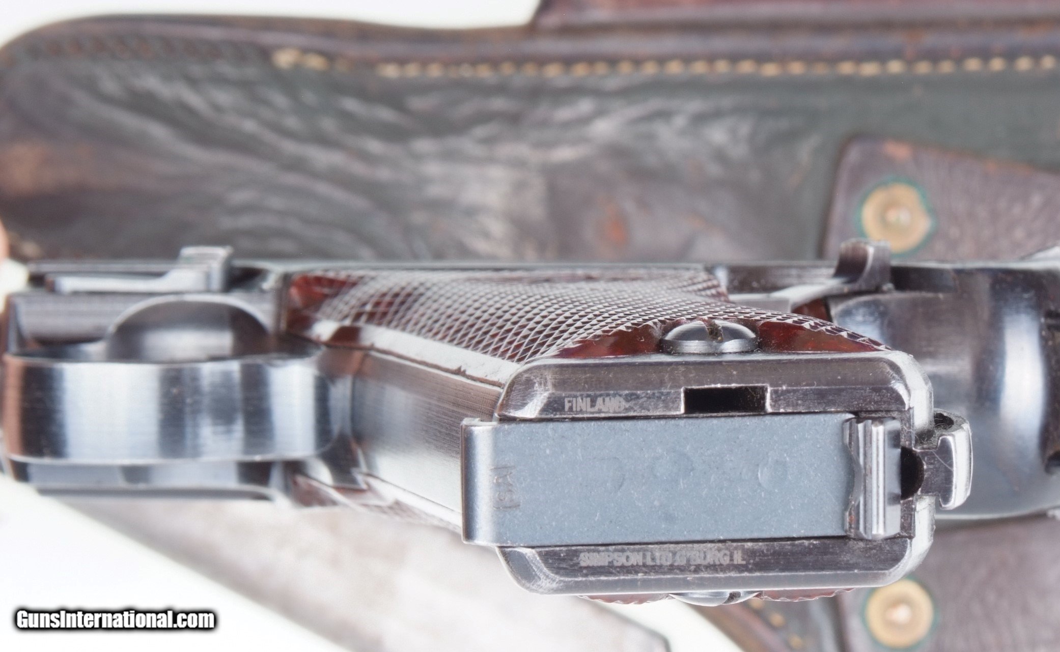 Description: According to the Jaeger Platoon , referencing Series 3 pistols: “Peace of 1944 stopped production of new parts, but building L-35 pistols from existing parts continued to end of 1945. This post Continuation War production numbered about 1000 pistols (serial numbers around 5800 - 6800). Last L-35 pistol delivered to Finnish Armed Forces had serial number 6731.” This standard configuration Series 3 military Lahti has a 4.75” barrel having drift adjustable front sight and fixed rear sight. “VKT” and “L-35” marked on top of slide surmounting boxed “SA”. Full matching serial numbers on left side of barrel extension, left side of frame and on top of bolt. Correct brown mottled plastic grips each molded with the VKT logo and secured with a single screw. Discrete import markings. Finnish Lahti magazines with an in-the-white body and blued floorplate marked with the boxed “SA”. Complete with original, brown, SA marked Finnish Military holster. No takedown tool or cleaning rod. Synopsis: Scarce late variation, Series 3, military L-35 Lahti with holster and spare magazine, one of the last to have been assembled circa 1944-45, with original SA marked magazines. Condition: Very good + original blue with holster wear and grip strap wear as one might expect from moderate but careful use. No discernible pitting. Excellent original grips having no splits or discernible losses. Bright bore with strong rifling. Perfect manual mechanics. Magazine bodies with oxidation as photographed with near excellent blued bases. Good holster with several areas of seam separations (at lid, around takedown tool pouch and at nose of holster) but no restitching. One of the scarcer Finnish military Lahti pistols, especially nice with correct holster and spare magazine. A HISTORIC INVESTMENT! ~~Insured shipping fee of $155; most packages shipped using FedEx 2nd Day.~~ SOLD Manufacturer: Valmet Serial Number: 6317 Caliber Info: 9 mmP |