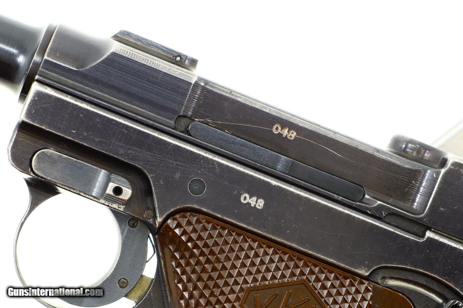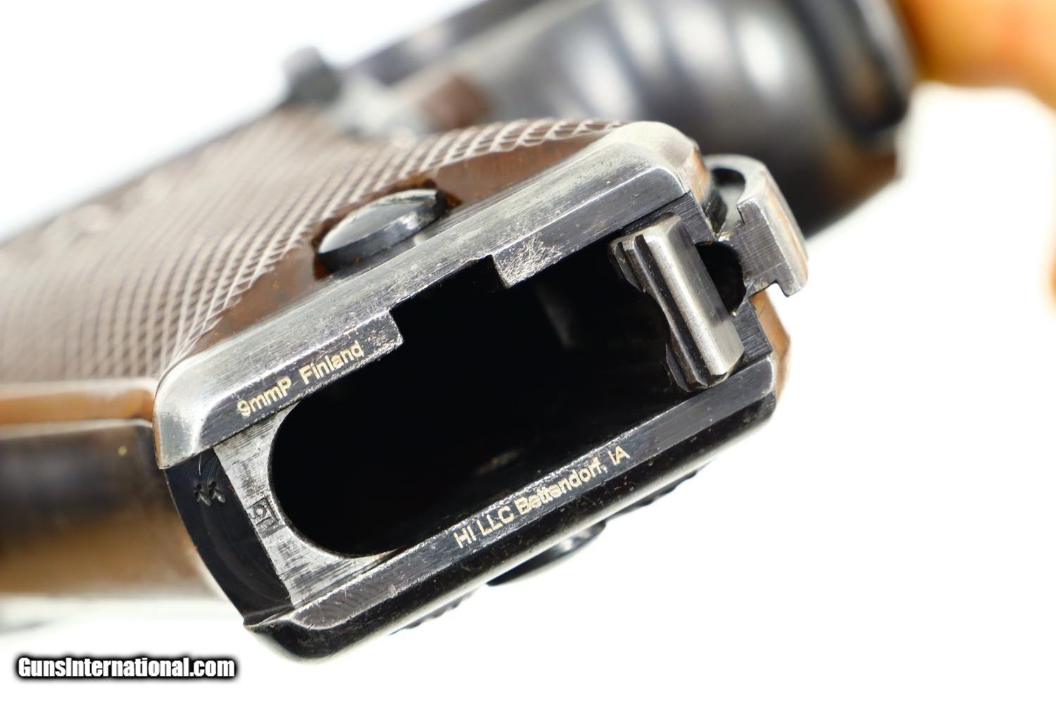 Description: Standard configuration first variation military configuration Lahti with 4.75” barrel having drift adjustable front sight and fixed rear sight. “VKT” and “L-35” marked on top of slide that has the prominent rounded protrusion in front of rear sight. Full matching serial number on left side of slide, left side of frame and on top of bolt. Correct brown mottled plastic grips each molded with the VKT logo and secured with a single screw. Correct magazine with an in-the-white body (no SA marking) and blued floorplate. According to one source, with the exception of 5 pistols later purchased by the military during the Winter War, the rest were used as presentations and gifts. Synopsis: Finnish Lahti, L-35, Military, Commercial/Presentation Series, 048, I-1088 Condition: Original salt blue estimated at 90% with wear in expected areas from moderate use. Bright bore with strong rifling. Perfect manual mechanics. Clearly, the most recognizable Finnish Lahti, especially in the virtually unknown “0” series range with all the earliest features desired by collectors. A HISTORIC INVESTMENT! ~~Insured shipping fee of $155; most packages shipped using FedEx 2nd Day.~~ SOLD Manufacturer: Lahti Serial Number: 48 Caliber Info: 9mmP |