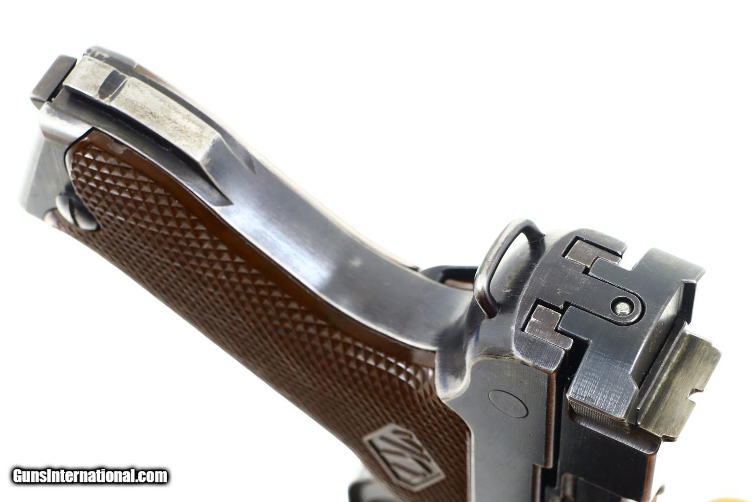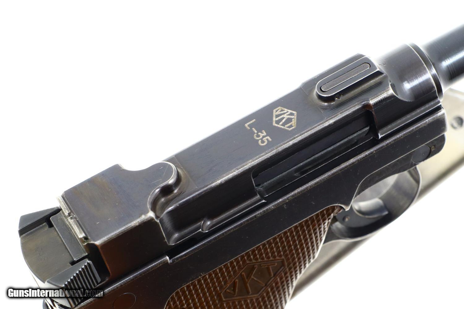Description: Standard configuration first variation military configuration Lahti with 4.75” barrel having drift adjustable front sight and fixed rear sight. “VKT” and “L-35” marked on top of slide that has the prominent rounded protrusion in front of rear sight. Full matching serial number on left side of slide, left side of frame and on top of bolt. Correct brown mottled plastic grips each molded with the VKT logo and secured with a single screw. Correct magazine with an in-the-white body (no SA marking) and blued floorplate. According to one source, with the exception of 5 pistols later purchased by the military during the Winter War, the rest were used as presentations and gifts. Synopsis: Finnish Lahti, L-35, Military, Commercial/Presentation Series, 048, I-1088 Condition: Original salt blue estimated at 90% with wear in expected areas from moderate use. Bright bore with strong rifling. Perfect manual mechanics. Clearly, the most recognizable Finnish Lahti, especially in the virtually unknown “0” series range with all the earliest features desired by collectors. A HISTORIC INVESTMENT! ~~Insured shipping fee of $155; most packages shipped using FedEx 2nd Day.~~ SOLD Curio/Relic: Yes Manufacturer: Lahti Serial Number: 48 Caliber Info: 9mmP |