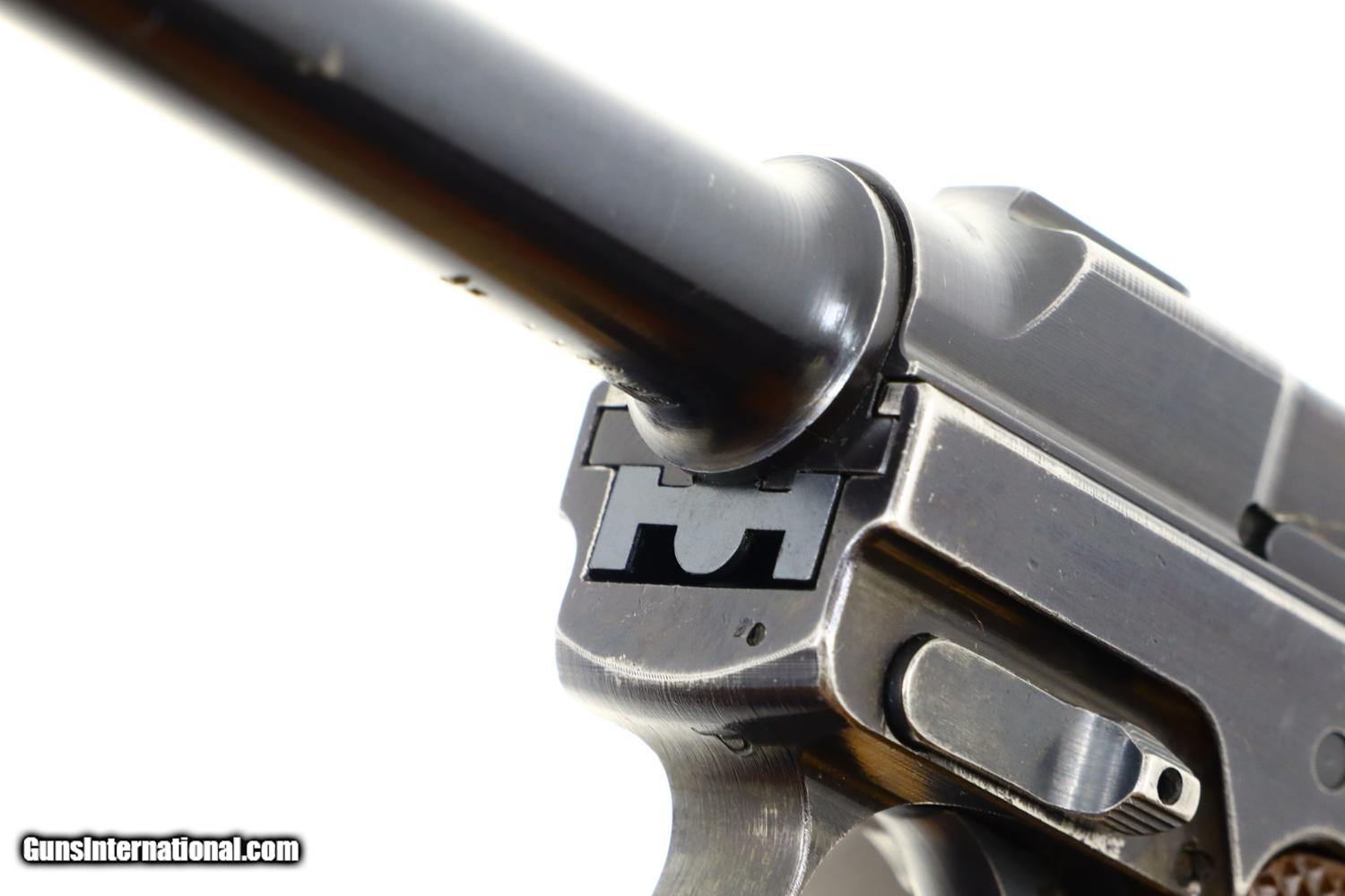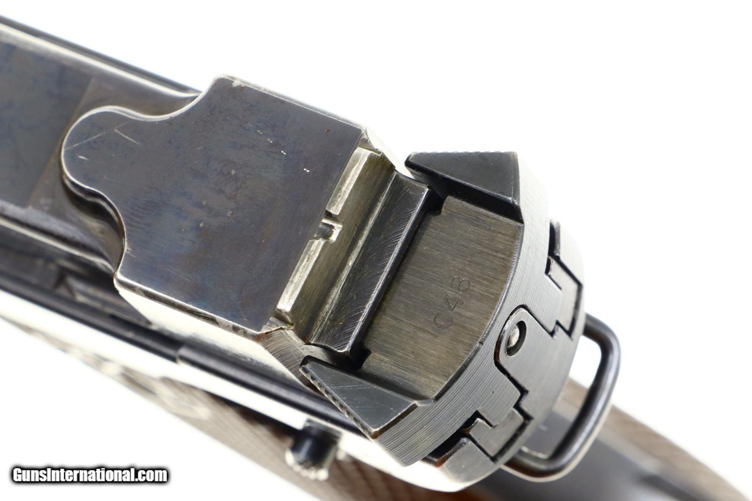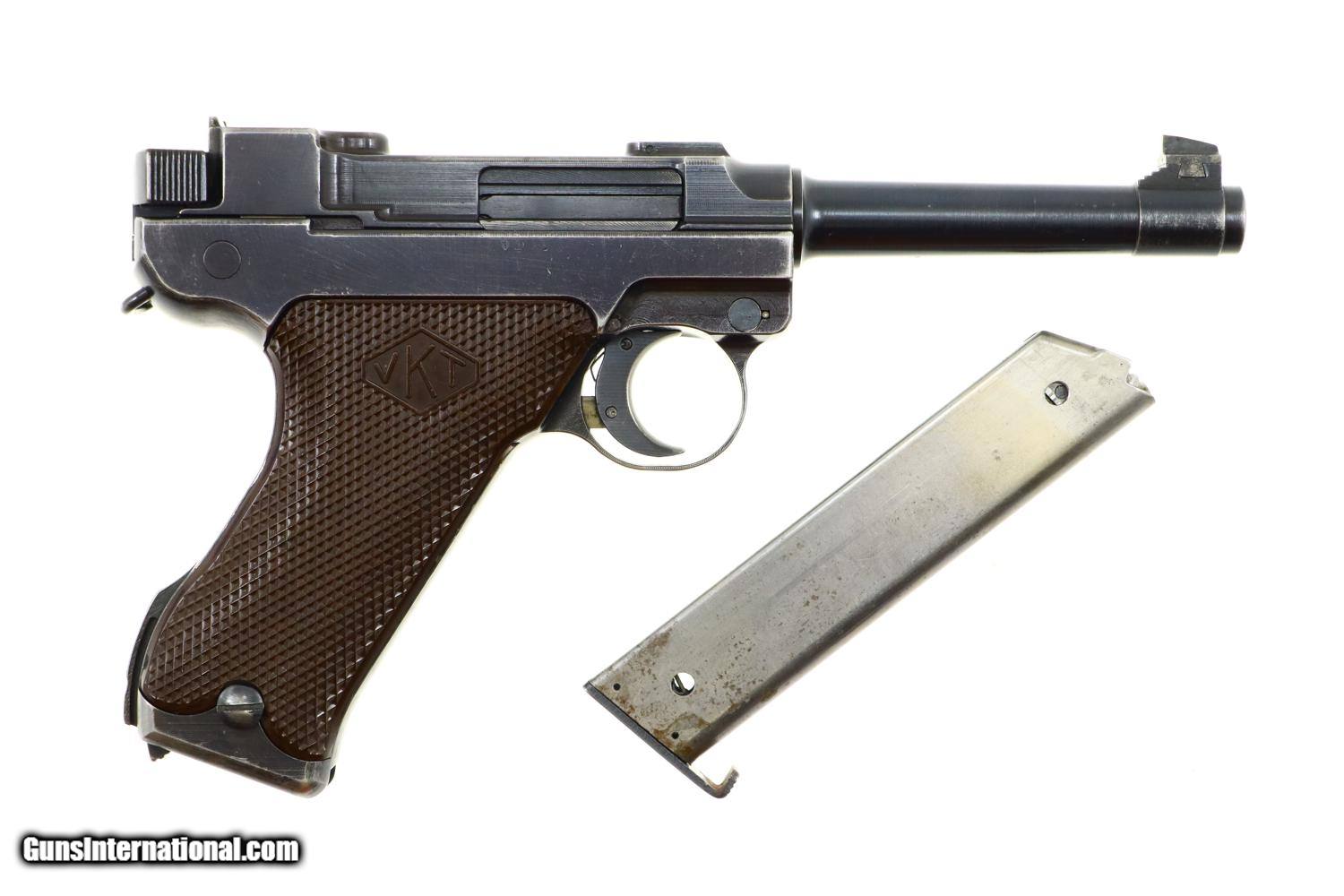 Standard configuration first variation military configuration Lahti with 4.75” barrel having drift adjustable front sight and fixed rear sight. “VKT” and “L-35” marked on top of slide that has the prominent rounded protrusion in front of rear sight. Full matching serial number on left side of slide, left side of frame and on top of bolt. Correct brown mottled plastic grips each molded with the VKT logo and secured with a single screw. Correct magazine with an in-the-white body (no SA marking) and blued floorplate. According to one source, with the exception of 5 pistols later purchased by the military during the Winter War, the rest were used as presentations and gifts.