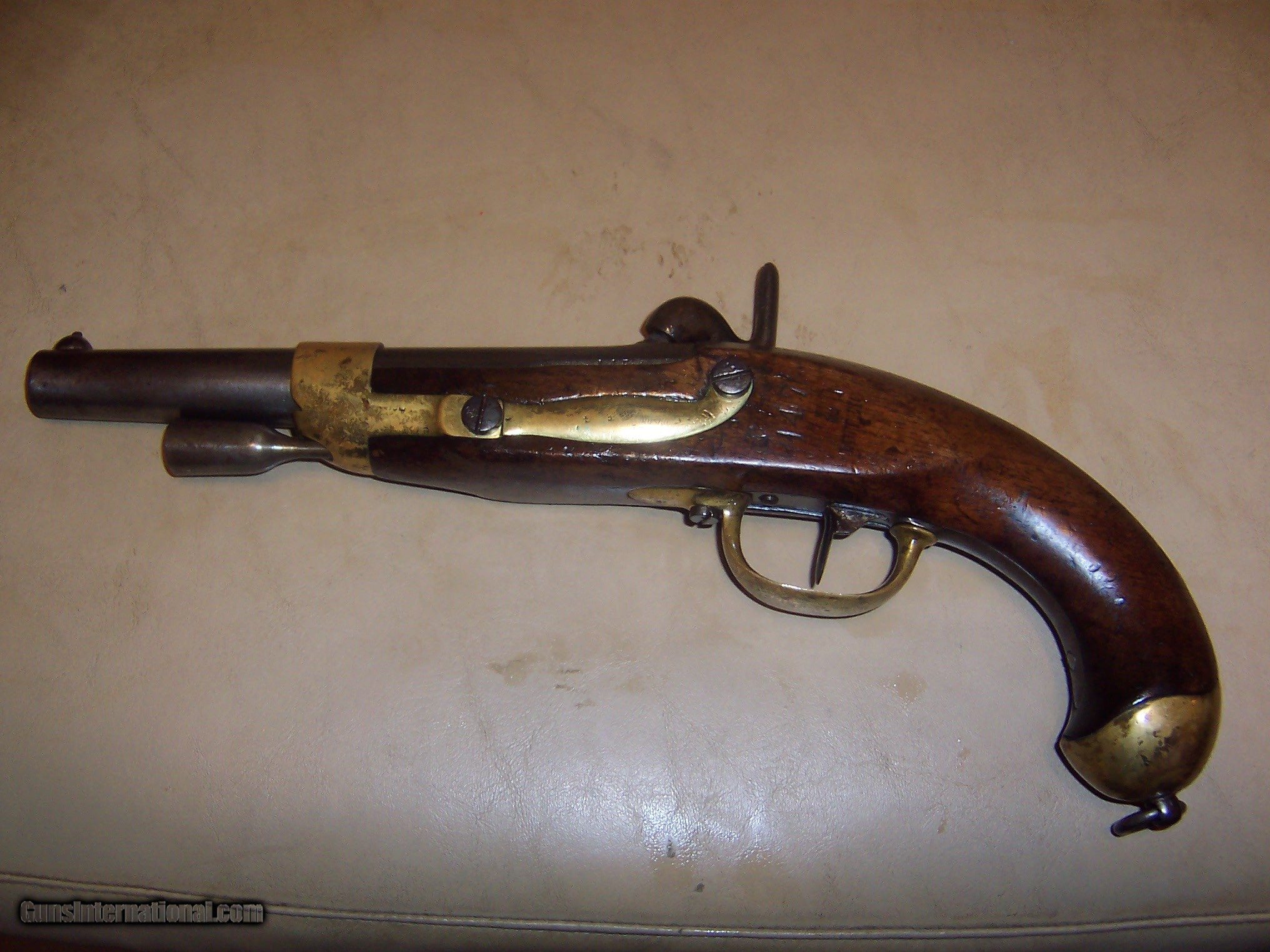 Description: nice solid pisto,l date 1822 on tang and barrel looks like date 1823, stock is solid , normal salt and pepper pitting , 70 caliber, strong ,lock works, ram rod has screw threads on end,, converted from fl SEE THIS, some extra parts inclued, lock works fine, barrel end can be straightened STOCK MISSING PART OF BUTT also some of the other gun in picture for sale SOLD Antique: Yes |