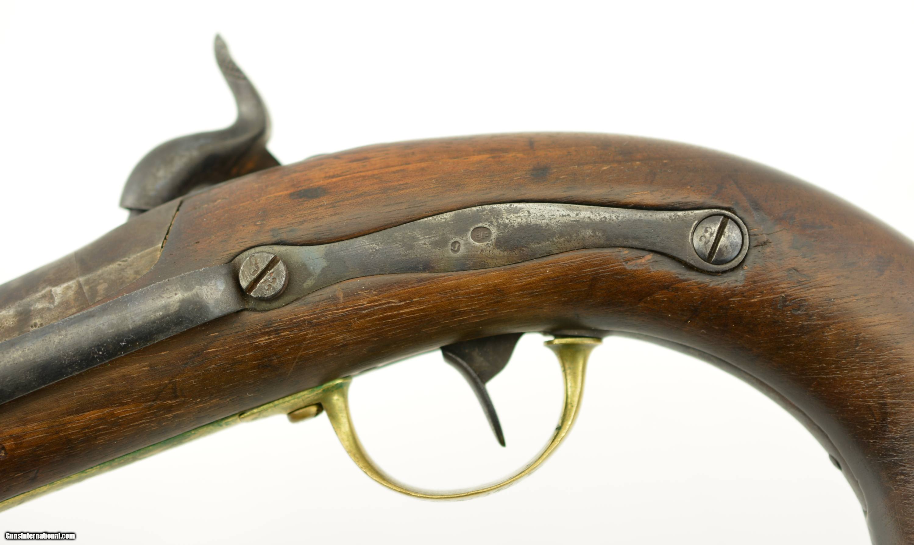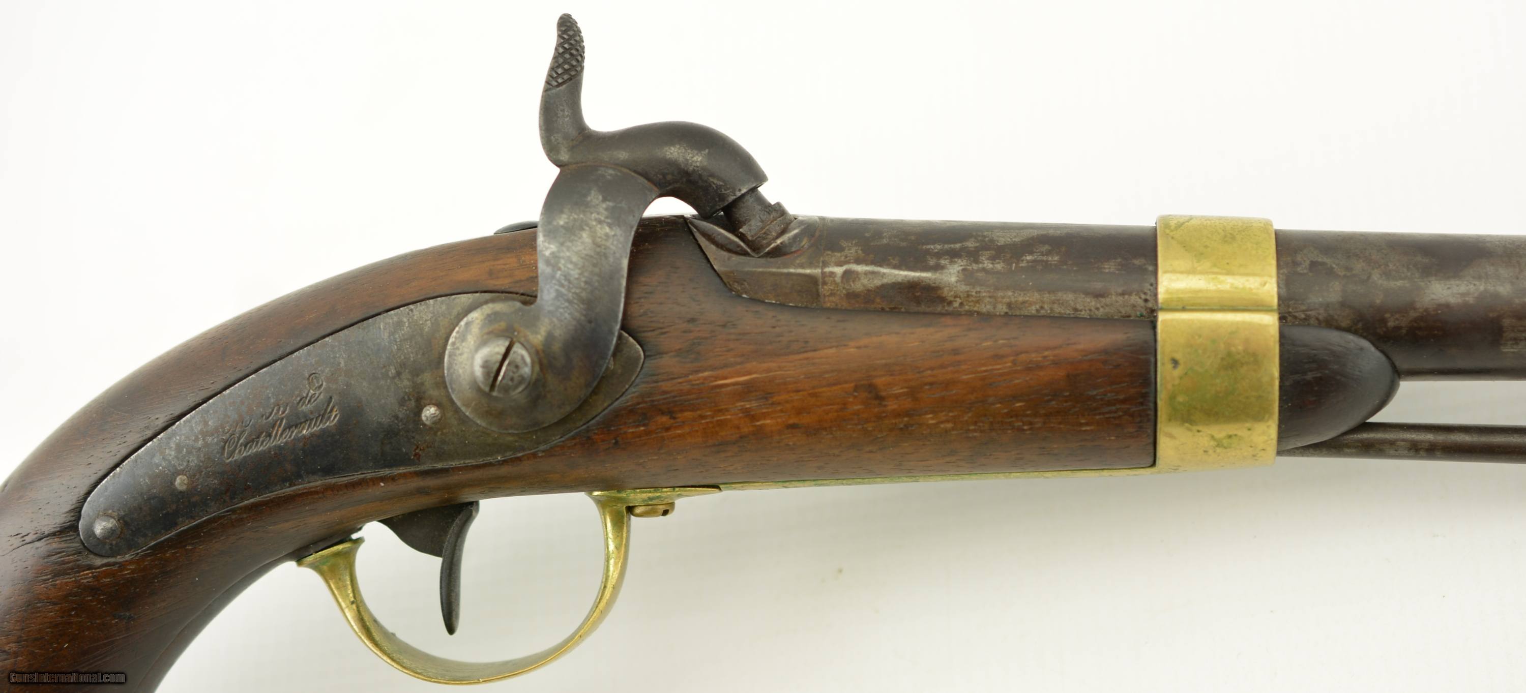 Description: NSN, .61 Caliber, 6 1/4" barrel with a very good, lightly pitted bore. This is an 1837 dated pistol that has mild freckling in the dark, blue-gray patina along the barrel and lock, as well as some streaks of brighter gray at the breech ahead of the nipple and bolster. The brass furniture was cleaned in the past, and has an overall yellow-ochre patina with numerous small handling marks and scratches, as well as a crisp anchor stamp at the toe of the butt. The integral iron belt hook and captive ramrod have a matching, mottled gray-black patina throughout. The walnut stock has small handling marks and blemishes scattered throughout the nicely reapplied finish, and has a few tiny chips missing from the tip of the lockplate, but is otherwise in fine shape. The action is crisp and tight, and the pistol rates fine condition overall. Antique SOLD Antique: Yes Manufacturer: French Model: 1837 Caliber Info: .61 Cal Gauge Info: .61 Cal |