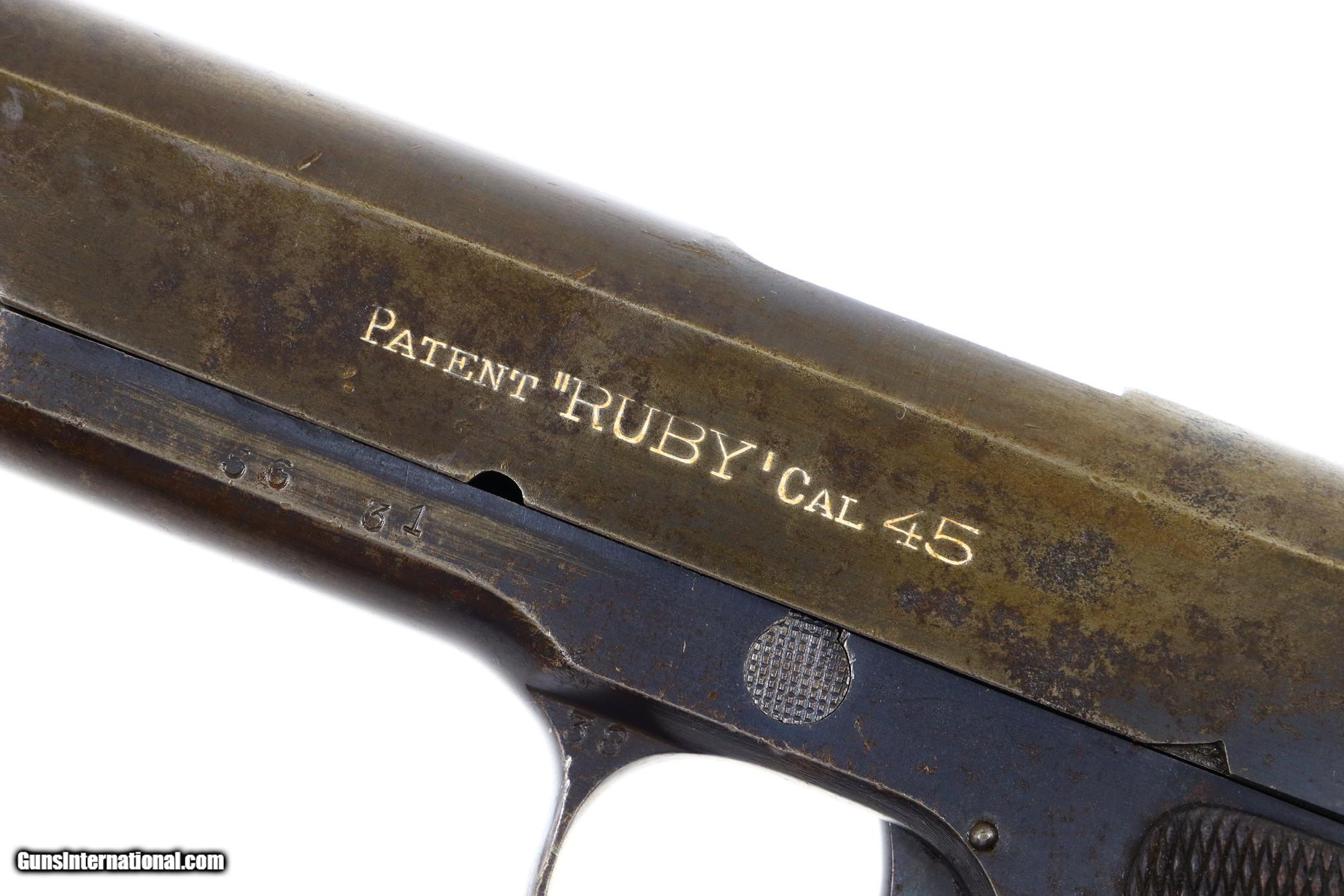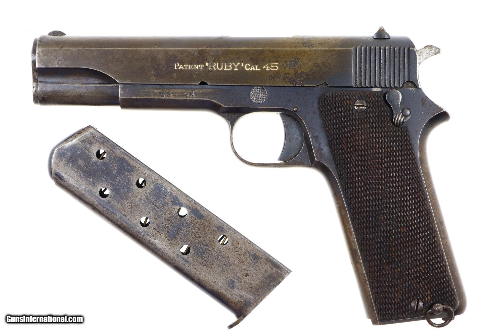 Description: Gabilondo made fewer than 1000 of these guns before switching to a version more closely modeled after the Colt 1911. This very early gun, circa 1924, with the lowest recorded serial number, has a fixed front and a drift adjustable rear sight. Single action, locked breech with a dropping barrel. The left side of the slide marked “PATENT ‘RUBY’ CAL 45”. Belgian type proofs on the right side of the barrel, slide and frame. Disassembly shows all major components matched to assembly number “76”. It is not known what the separated numbers reflect on the left side of the frame. Magazine base is numbered 302. Fitted with finely checkered borderless grips. Bottom magazine release, the magazine having 7 indicator holes and an enclosed floorplate. Lanyard ring present. THIS EXACT PISTOL WAS PICTURED IN THE BOOK “ASTRA FIREARMS AND SELECTED COMPETITORS” by Antaris, pg 36. Synopsis: Rare and innovative Gabilondo y Cia Llama Spanish pistol, marked RUBY, cal. .45ACP, with several features that were later “borrowed” by FN and Radom, including the fixed barrel lug as used in the FN HP; the Radom VIS-35 incorporating the fixed lug AND the captive recoil spring! Condition: Good with considerable fading as photographed. Very crisp markings. Bright bore with sharp rifling. Perfect manual mechanics. An extremely impressive pistol, many of whose milestone features were liberally borrowed by several major manufacturers. ~~Insured shipping fee of $155; most packages shipped using FedEx 2nd Day.~~ SOLD Curio/Relic: Yes Manufacturer: Gabilondo y Cia Serial Number: 131 Caliber Info: .45ACP |