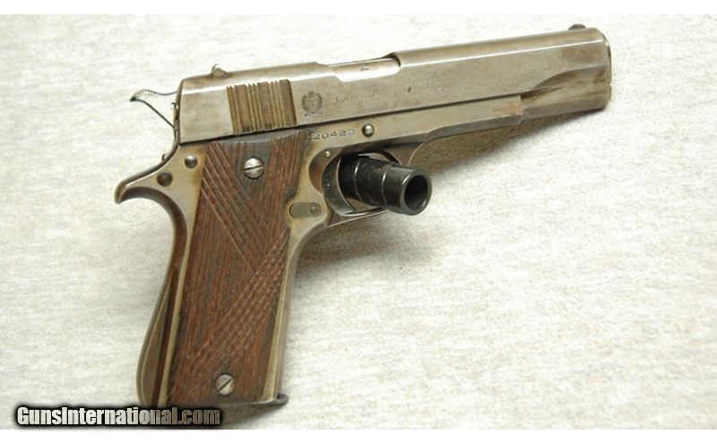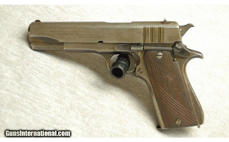 Description: Good condition, significant finish wear, nicks and scratches. Comes with one mag. South American manufacture semi auto pistol, similar to the John Browning designed 1911 semi auto handgun. .45 Auto SOLD Chambers: Semi auto Metal Condition: Good Wood Condition: Grips are good Bore Condition: Bright Barrels: 5' Triggers: Single action Butt Pad: Wood grips Sights: Iron sights Item Location: La Vista, NE |