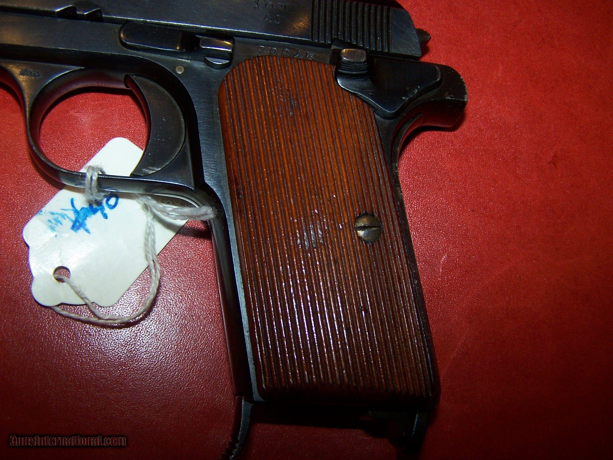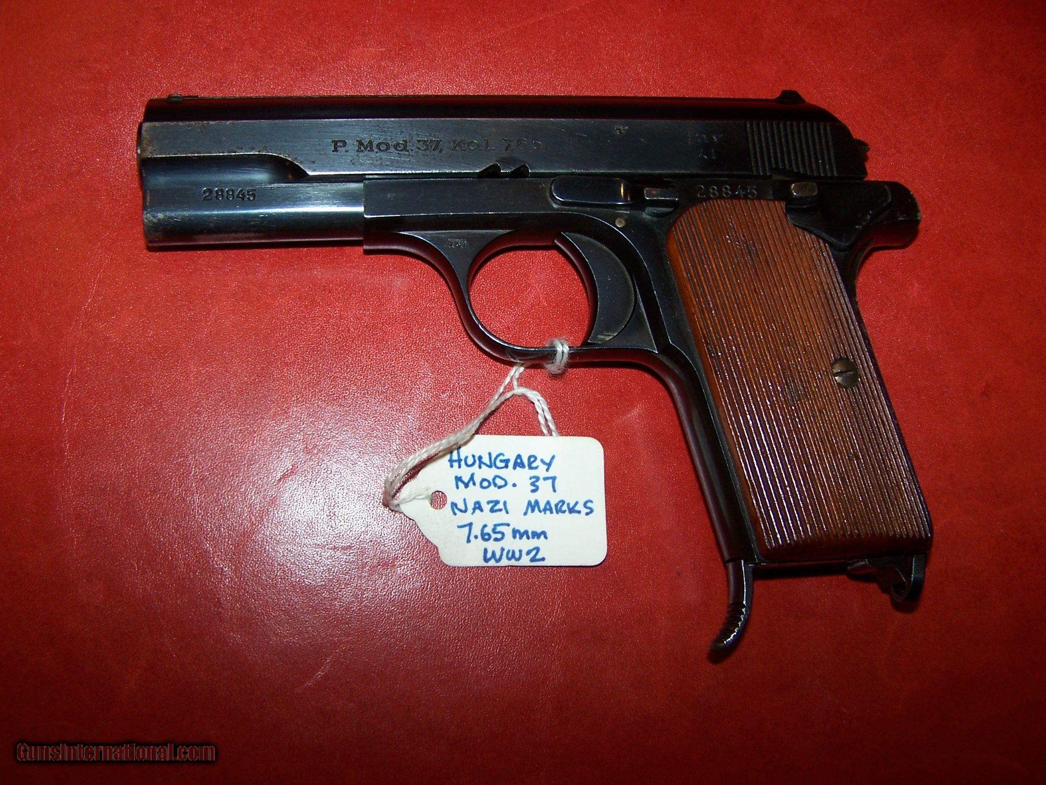 Description: HUNGARIAN FEMARU Model 37 semi-automatic pistol 7.65 mm (.32 ACP), all matching S/N 28845 on barrel, on slide, on frame, AND ON MAGAZINE. Markings: left side of slide: "P. Mod. 37, Kal. 7,65." "jhv / 41" NAZI proofs on barrel, slide, and on frame. Eagle over glode with swastika on slide and barrel, Eagle over "WaA58" on frame. One magazine. Original blued finish at least 95%. Excellent wood grip panels (probably walnut) slight handling marks. Overall an excellent example of a WW2 semi-automatic pistol made in NAZI occupied Hungary. SOLD Curio/Relic: Yes |