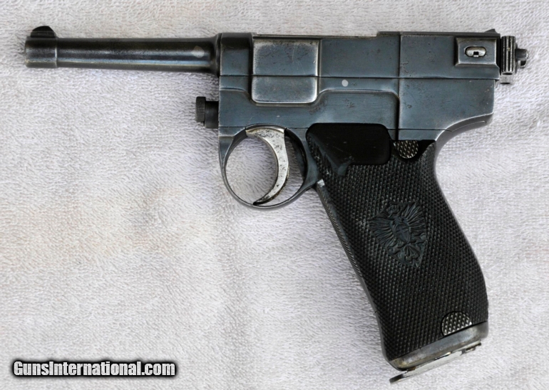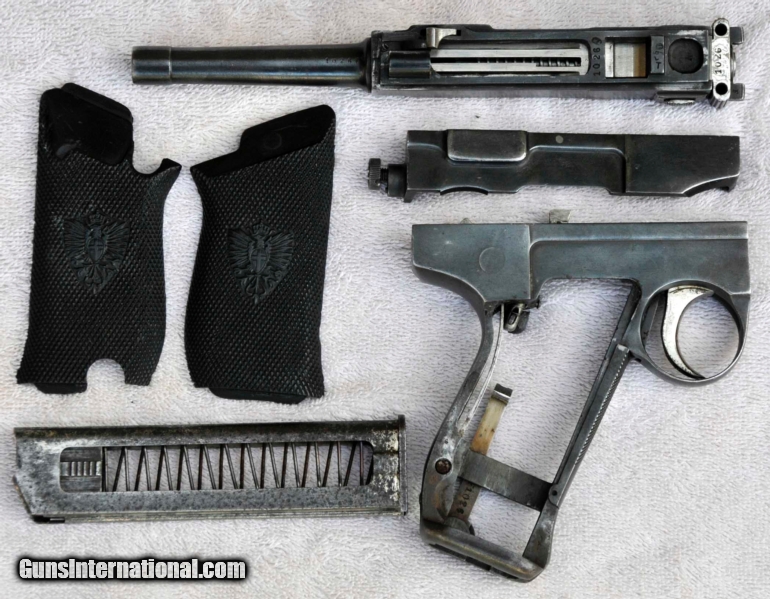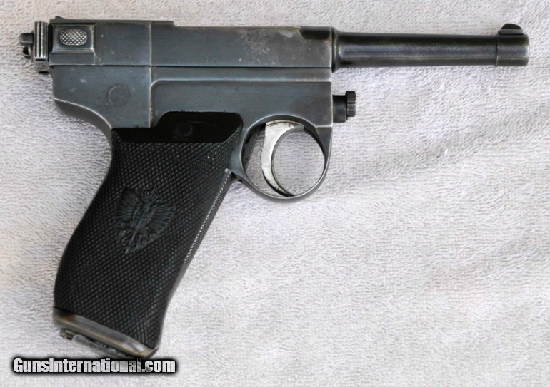 Description: Early Italian military pistol, caliber 9mm Glisenti. Beautifully made but poorly designed. Only about 12,000 pistols were made in very few years. That's why it is rarely seen! All serial numbers (1026F) match throughout. Blue 95% with mostly holster wear. Original 7-round plated magazine very good left side, no finish right side. Bore bright with sharp lands and grooves. Do not fire this pistol with more powerful 9mm Luger ammunition! Correct bakelite grips, mirroring later Model 1912. Buyer pays handling, shipping, insurance. Three day inspection, no firing or disassembly. Returns for any reason, purchase price refunded, less costs, upon receipt of gun in same condition as sold. I am not a dealer, will ship to FFL licensed dealer. Please call 830-257-7978 if you have questions. SOLD |