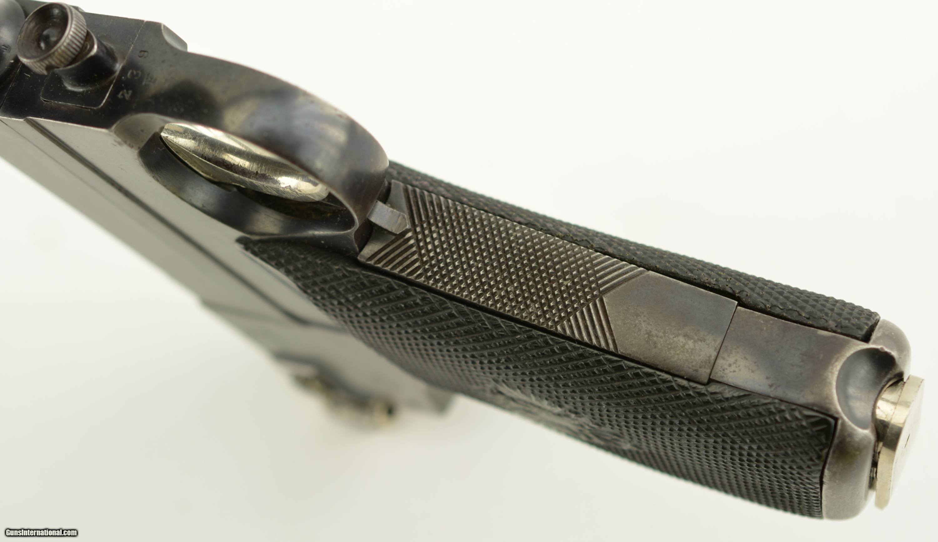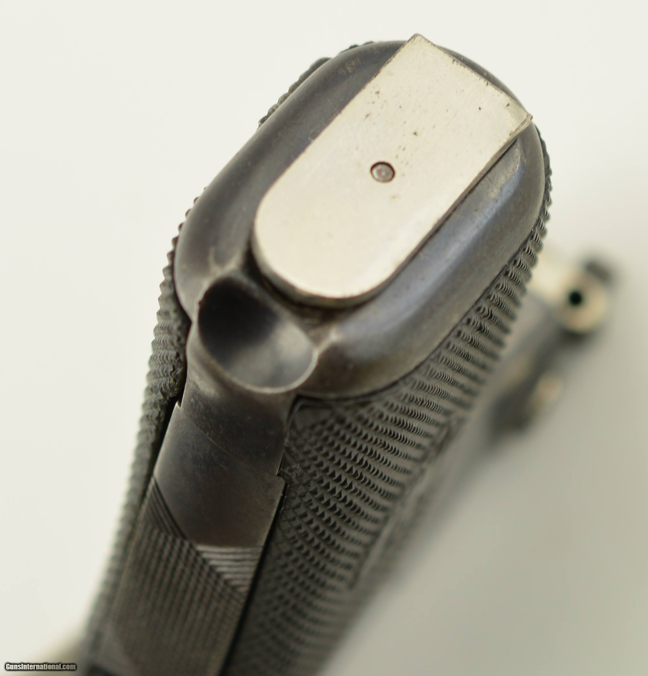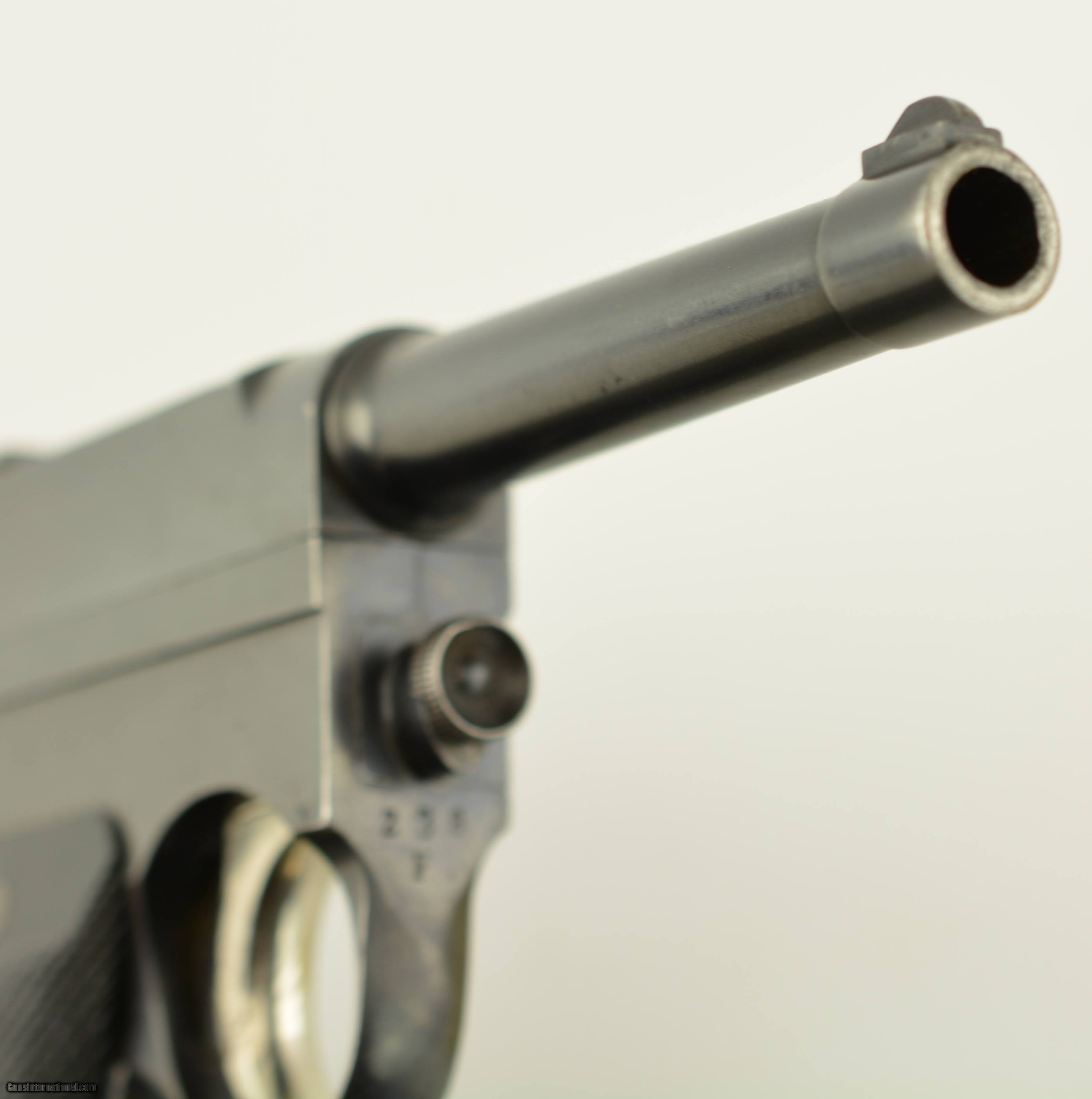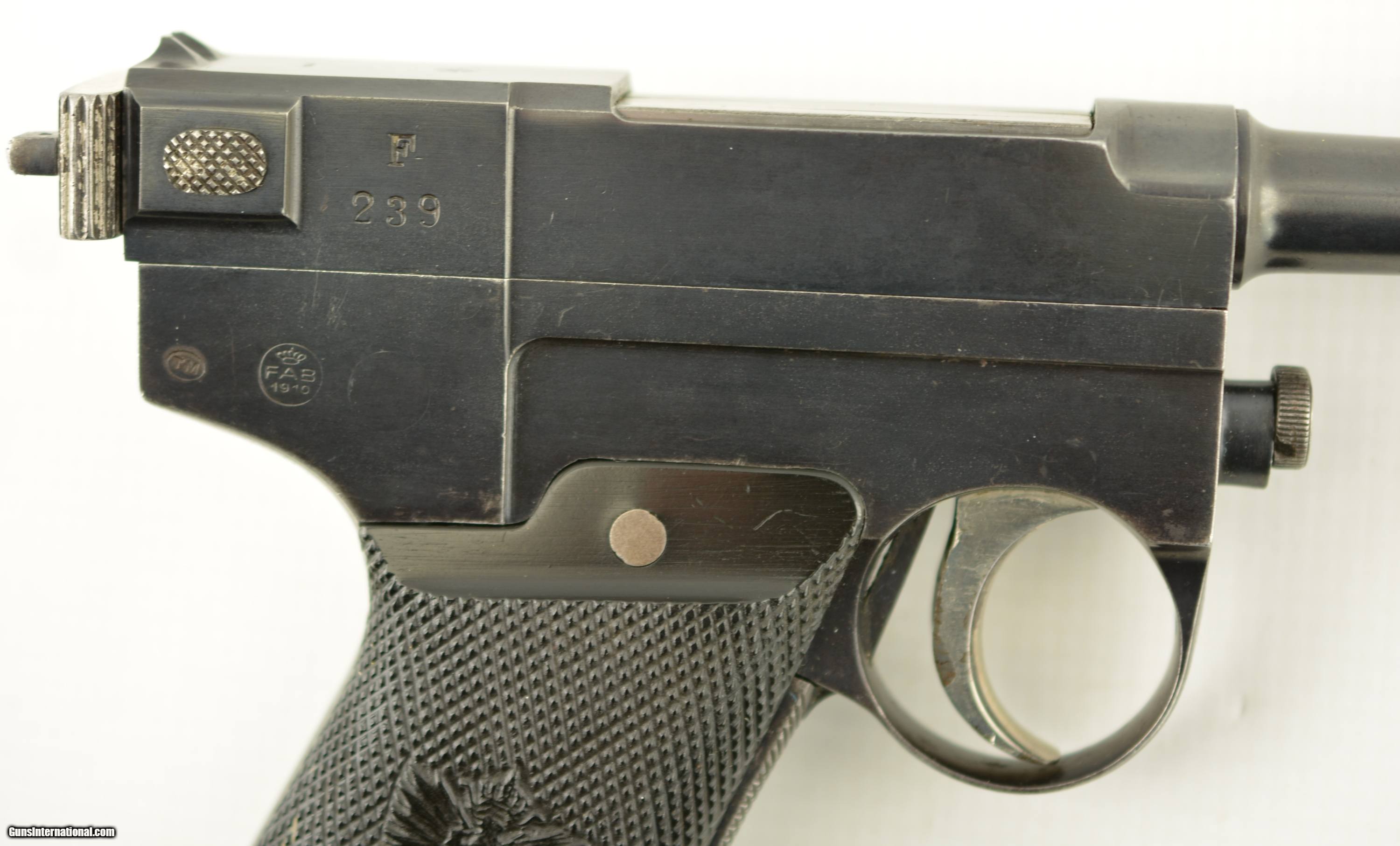 Description: Serial #239F, 9mm Glisenti, 3 3/4" barrel with an excellent, bright bore. This is a FAB marked, Brescia-made pistol that retains 85-90% of the original blue finish that has silvered and faded along the high edges and projections. The bolt, trigger, and magazine retain their bright nickel finish with the checkered, Italian eagle crest grips are intact, and have some flattening of the points along the butt on either side. The pistol comes with a single original magazine and rates fine-excellent condition overall. Please Note: The 9mm Glisenti is almost dimensionally identical to the 9mm Parabellum, but is loaded to much lower pressures. Firing a 9mm Parabellum round in a Model 1910 Glisenti pistol could result in catastrophic failure, and severe injury. FFL or C&R SOLD Curio/Relic: Yes Manufacturer: Italian Model: Glisenti Serial Number: 239F Caliber Info: 9mm Gauge Info: 9mm |