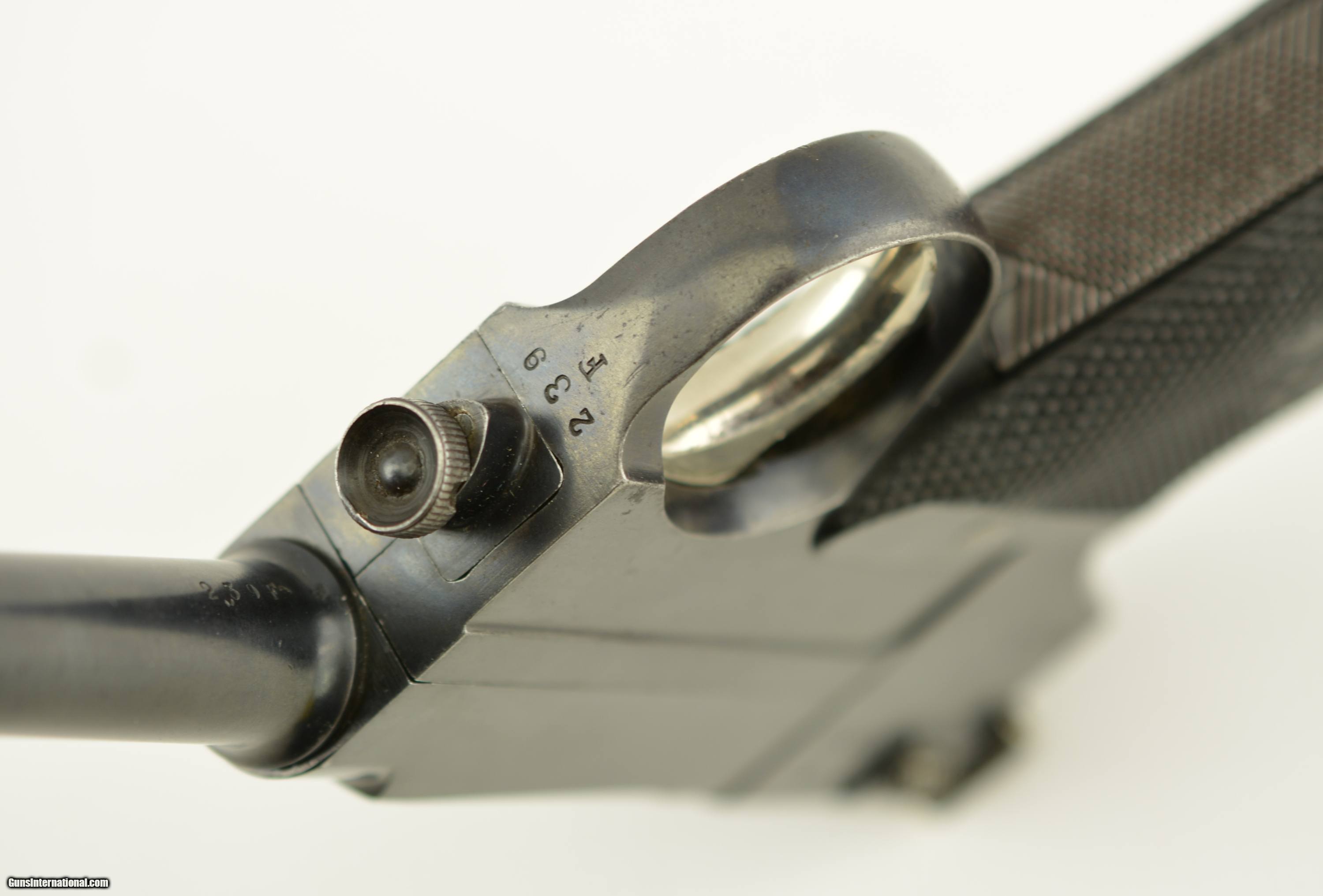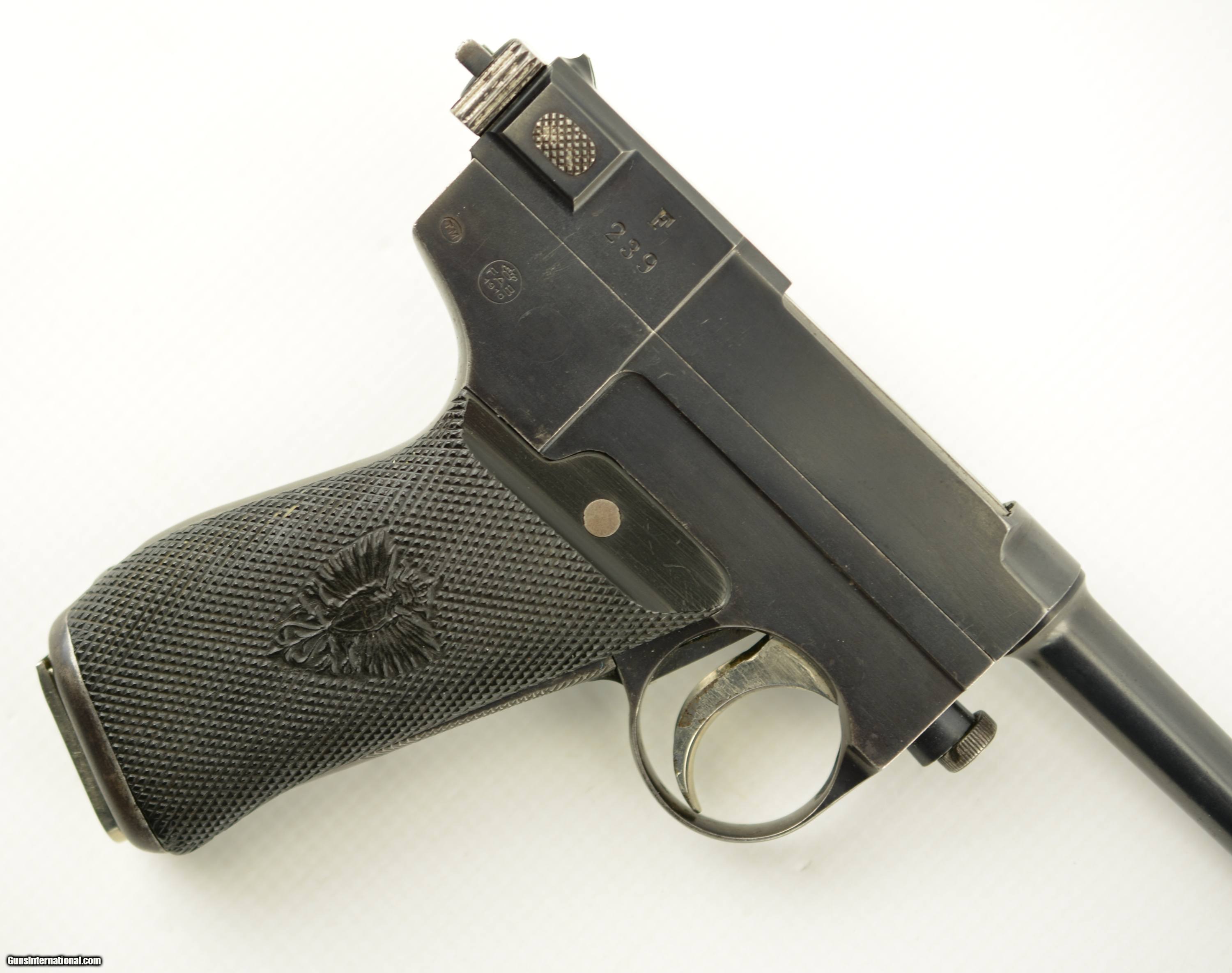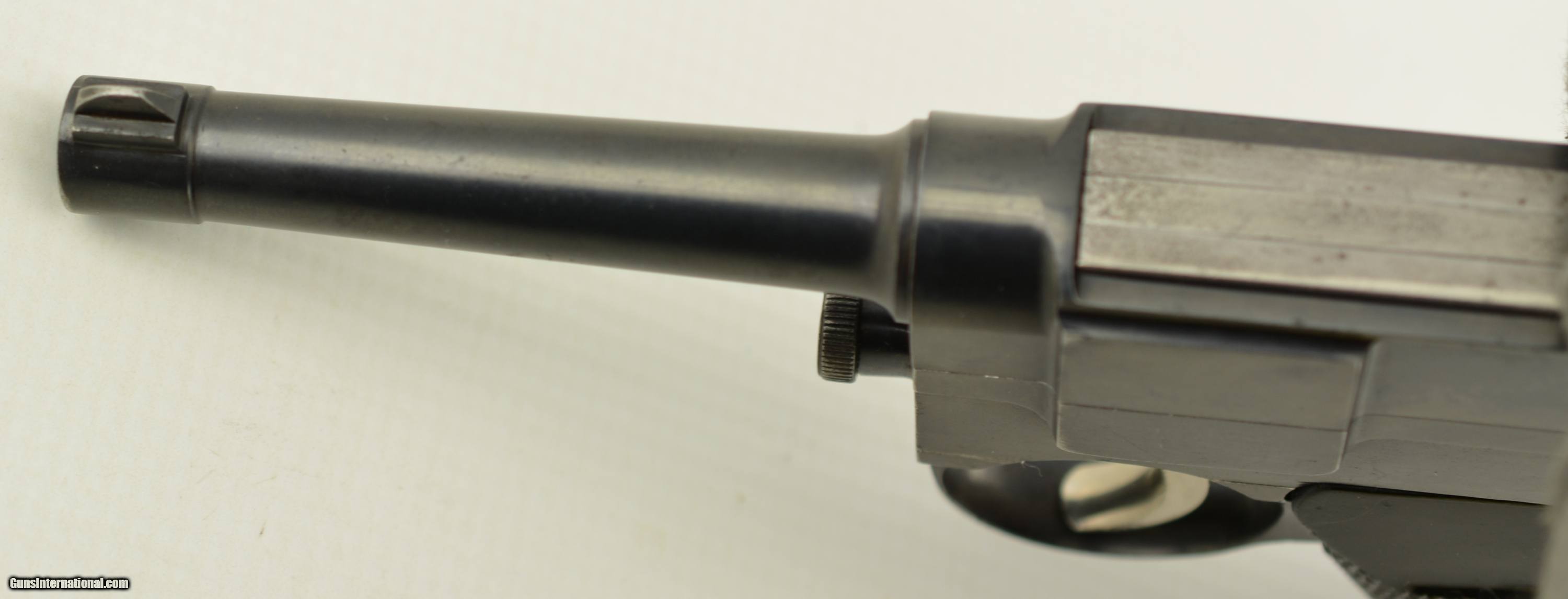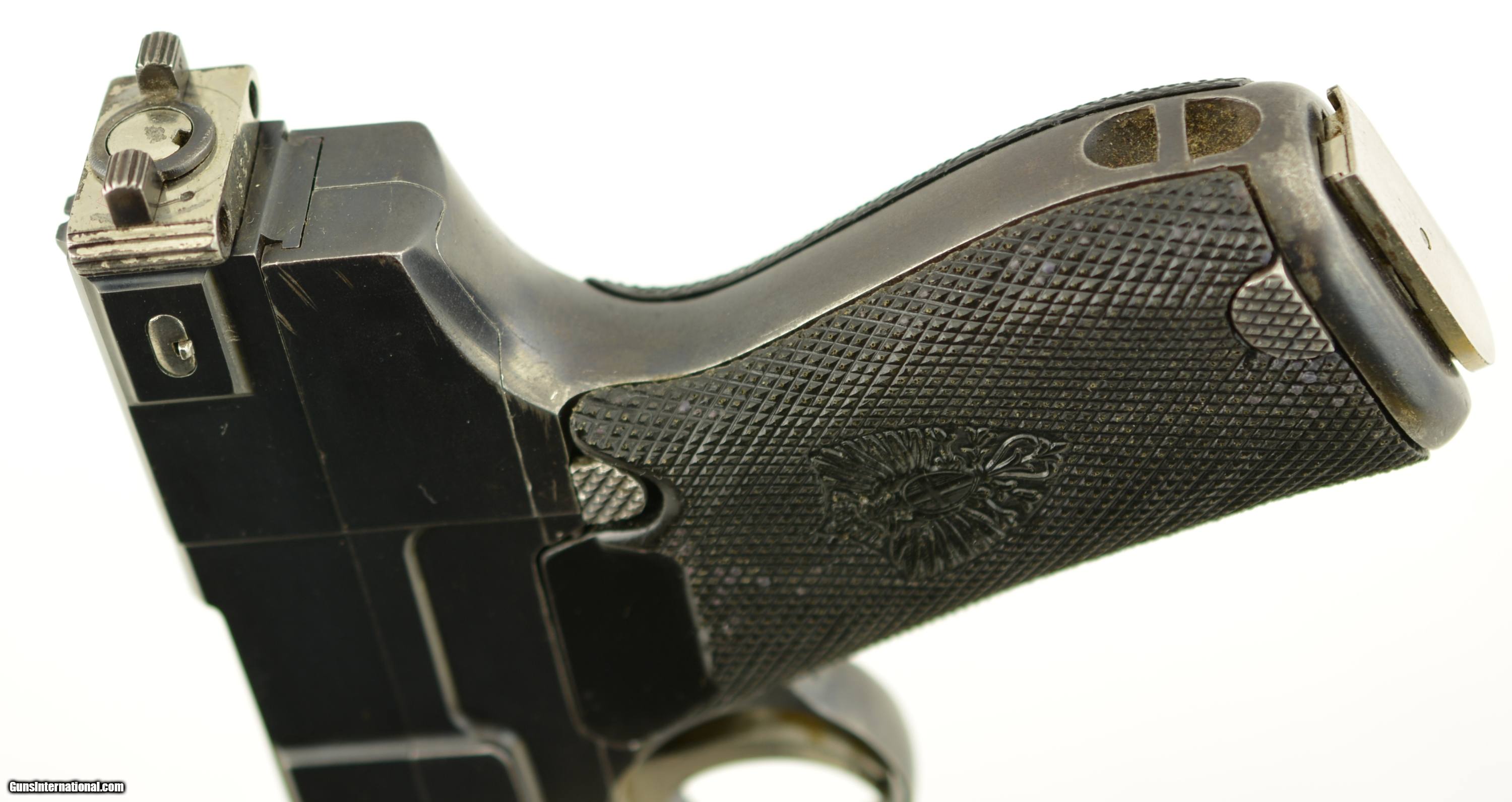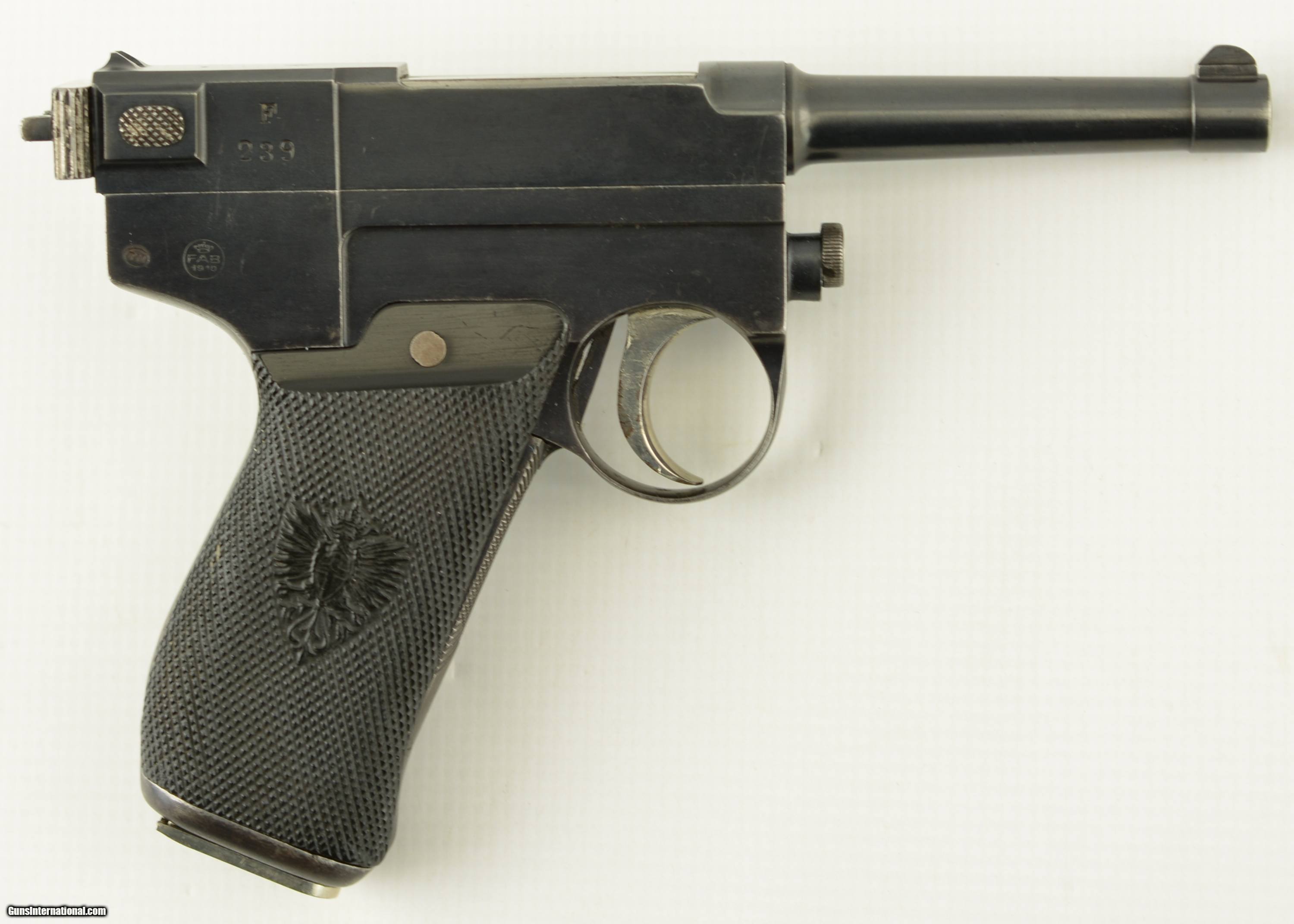 Description: Serial #239F, 9mm Glisenti, 3 3/4" barrel with an excellent, bright bore. This is a FAB marked, Brescia-made pistol that retains 85-90% of the original blue finish that has silvered and faded along the high edges and projections. The bolt, trigger, and magazine retain their bright nickel finish with the checkered, Italian eagle crest grips are intact, and have some flattening of the points along the butt on either side. The pistol comes with a single original magazine and rates fine-excellent condition overall. Please Note: The 9mm Glisenti is almost dimensionally identical to the 9mm Parabellum, but is loaded to much lower pressures. Firing a 9mm Parabellum round in a Model 1910 Glisenti pistol could result in catastrophic failure, and severe injury. FFL or C&R SOLD Curio/Relic: Yes Manufacturer: Italian Model: Glisenti Serial Number: 239F Caliber Info: 9mm Gauge Info: 9mm |