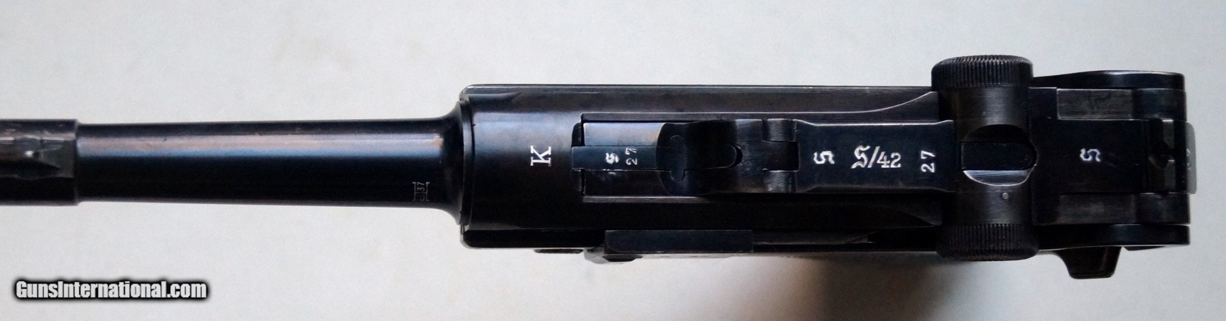Description: THIS IS A K DATE (1934 MAUSER) NAZI MILITARY GERMAN LUGER RIG, 9MM. THE LUGER IS IN VERY GOOD CONDITION. NUMBER MATCHING INSIDE AND OUT, VERY GOOD BORE AND GRIPS. MECHANICALLY CORRECT AND TIGHT. THE RIG CONSISTS OF THE LUGER, 2 NAZI MARKED MAGAZINES (BOTH ARE NUMBERED TO THE GUN), 1 ORIGINAL NAZI 1934 HOLSTER (RARE TO FIND) AND 1 NAZI MARKED LOADING TOOL. A VERY NICE WWII NAZI K DATE GERMAN LUGER RIG. NOTE: THE LUGER WITH THE SERIAL NUMBER 227 PLACES IT IN THE FIRST VARIATION ONLY 1700 WERE MADE. MY SOURCES OF INFORMATION ARE MY OWN KNOWLEDGE AND THE BOOK "THIRD VARIATION LUGERS" PAGE 15 BY JAN C. STILL. SOLD Curio/Relic: Yes |