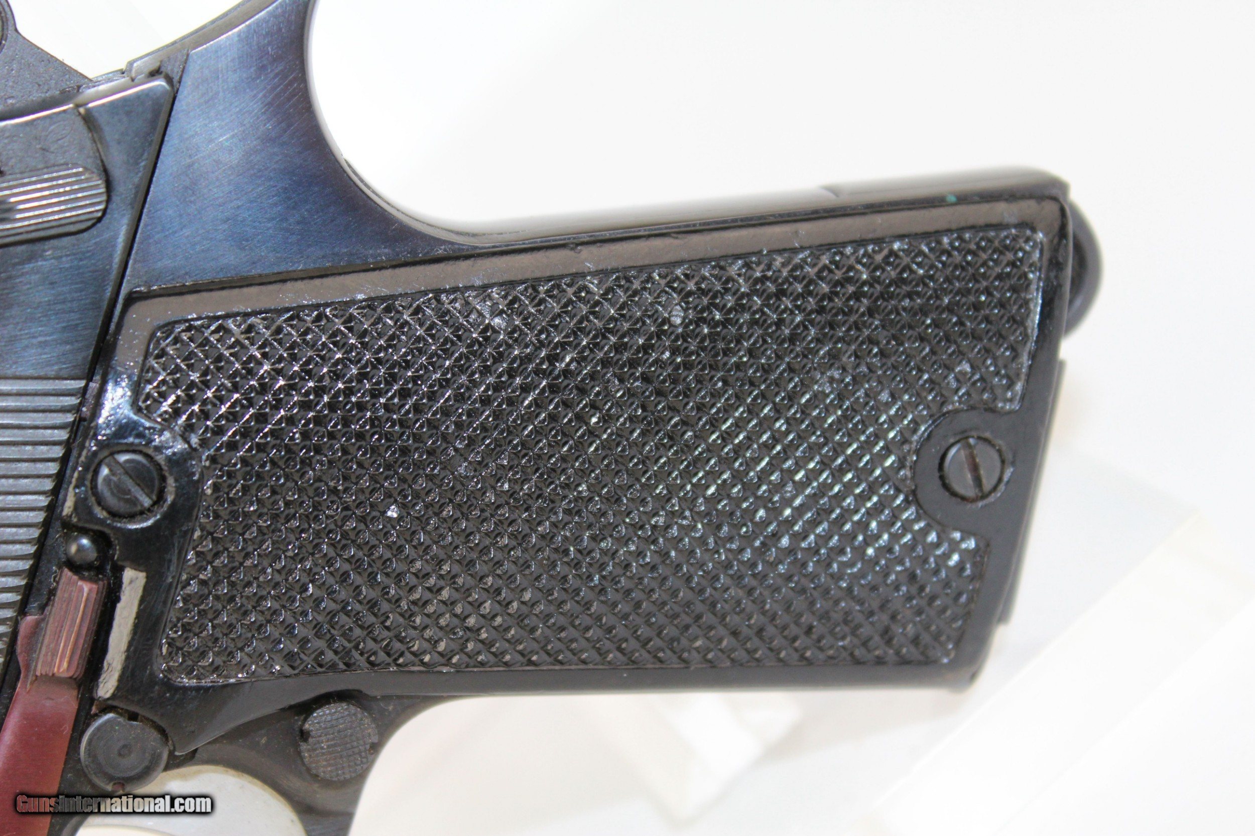 Description: Late-1940s FRENCH Sagem Model 1935S Pistol With Leather Holster Here we present a Sagem Model 1935S Pistol, made circa the late-1940s by the Societe d’Applications Generales d’Electricite et de la Mecanique. There were two versions of this French military pistol, the 1935A and this, the 1935S. Both were designed to compete in the 1935-37 French military trials conducted by the Commission d’Experiences Techniques de Versailles to select a new sidearm. While similar in concept and design due to the specific requirements of the trials committee, they share no parts in common. The Model 1935S lost out but was put into production shortly thereafter due to the inability of the manufacturer to produce the 1935A quickly enough. These were used through the early-1950s. The left side of the frame is marked “SAGEM”. The right side is marked “MODELE 1935 S/CAL. 7.65 L/SAGEM A0.554”. The bottom of the magazine is marked “1935S”. Comes with a brown leather holster that is in good shape. The overall condition is fine. The blue finish is near complete as it has been nicely refinished. The markings are clear and legible. The grips are very good. The bore is clear and bright. The action on this pistol is excellent. This firearm is classified as a Curio & Relic. Barrel is 4-1/4 inches. Caliber: 7.65mm Longue Overall condition as seen in photos. Very Fast. Very Safe. FREE SHIPPING. Will need to be sent to your local FFL or C&R licensee. This firearm is classified as a Curio & Relic. Guaranteed AUTHENTIC & Includes CERTIFICATE OF AUTHENTICITY. ancestryguns $750 #6129 SOLD Curio/Relic: Yes |