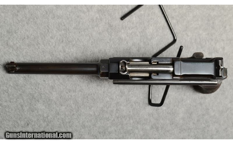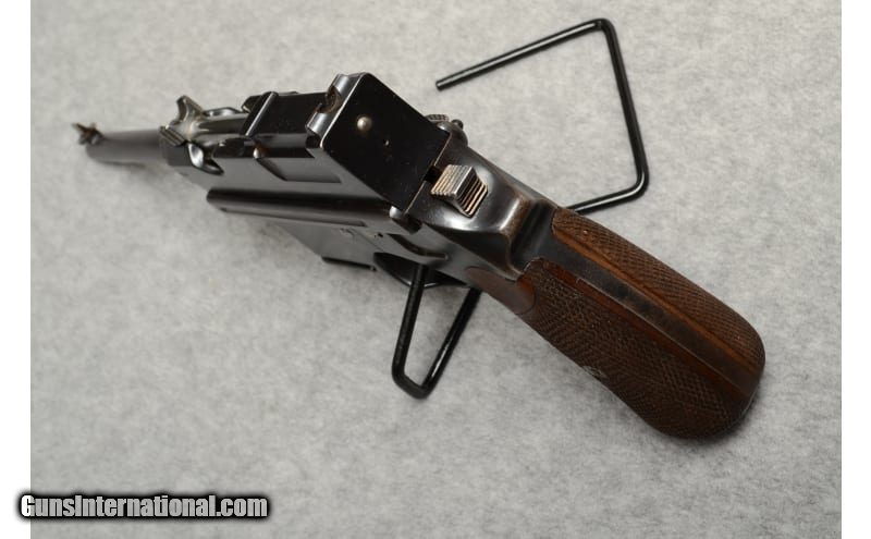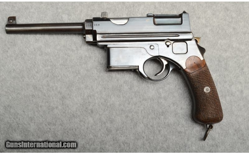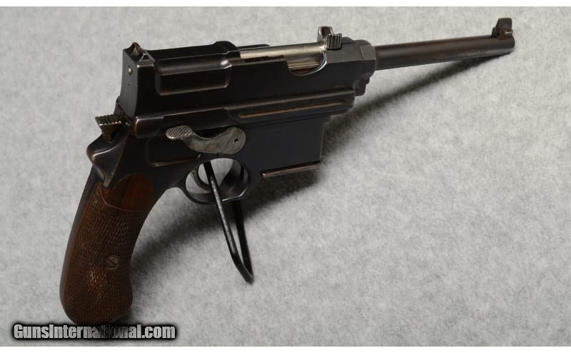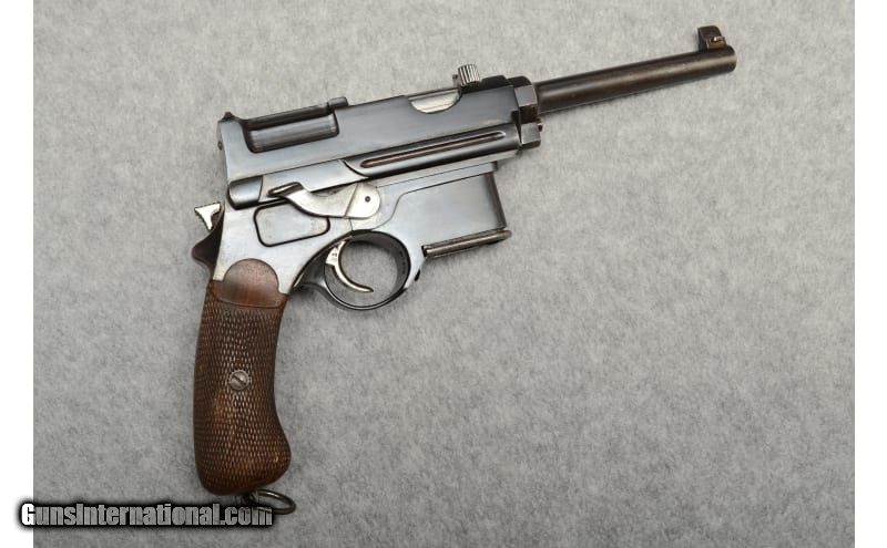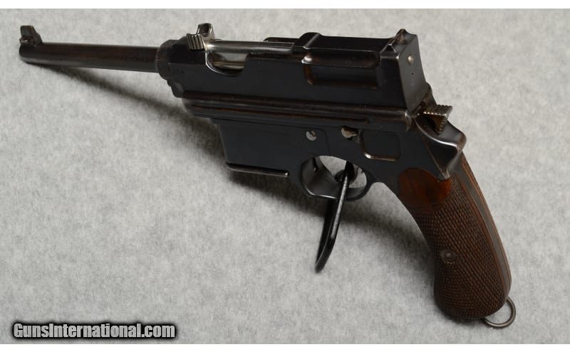Description: This rare Mannlicher Model 1896 or 1897 depending on what historic literature is referenced is in great condition overall retaining 90% of its original bluing, and having just a slight patina or loss of the original wood checkering on the pistol grips. Acquired through a private collector this pistol has a very prestigious history behind its design and manufacture. Originally designed for military use in the 1890s as a simple blowback semi-automatic pistol chambered in 7.63x23mm with both a fixed 7 round magazine and a later designed detachable 6 round magazine, both models capable of accepting a stripper clip via the top access of the reciprocating barrel and slide design. Turned down by the Swiss military, the newer design that incorporated the 6 round box magazine became available on the civilian market chambered in both 7.63x23mm and 7.65x23mm. This particular model from what I can ascertain is chambered in the original iteration 7.63x25mm, and features the 6 round removable magazine, adjustable front dovetail style sight post with fixed rear black u-notch sight, and lanyard sling. The barrel, slide, trigger, and bolt are all stamped with the matching serial number 259, making this pistol highly collectable. The barrel has some slight corrosion and is a bit frosted with the action working properly and smoothly with the metal having just minor handling marks and bluing loss from use. None SOLD Chambers: 7.65x23mm Metal Condition: Great Wood Condition: Very Good Bore Condition: Good Barrels: 4.5 Triggers: Single action Fore End: Steel Butt Pad: Checkered wood grip Weight: 2.5 lbs Sights: Dovetail style adjustable front sight post. Item Location: Columbus, OH |