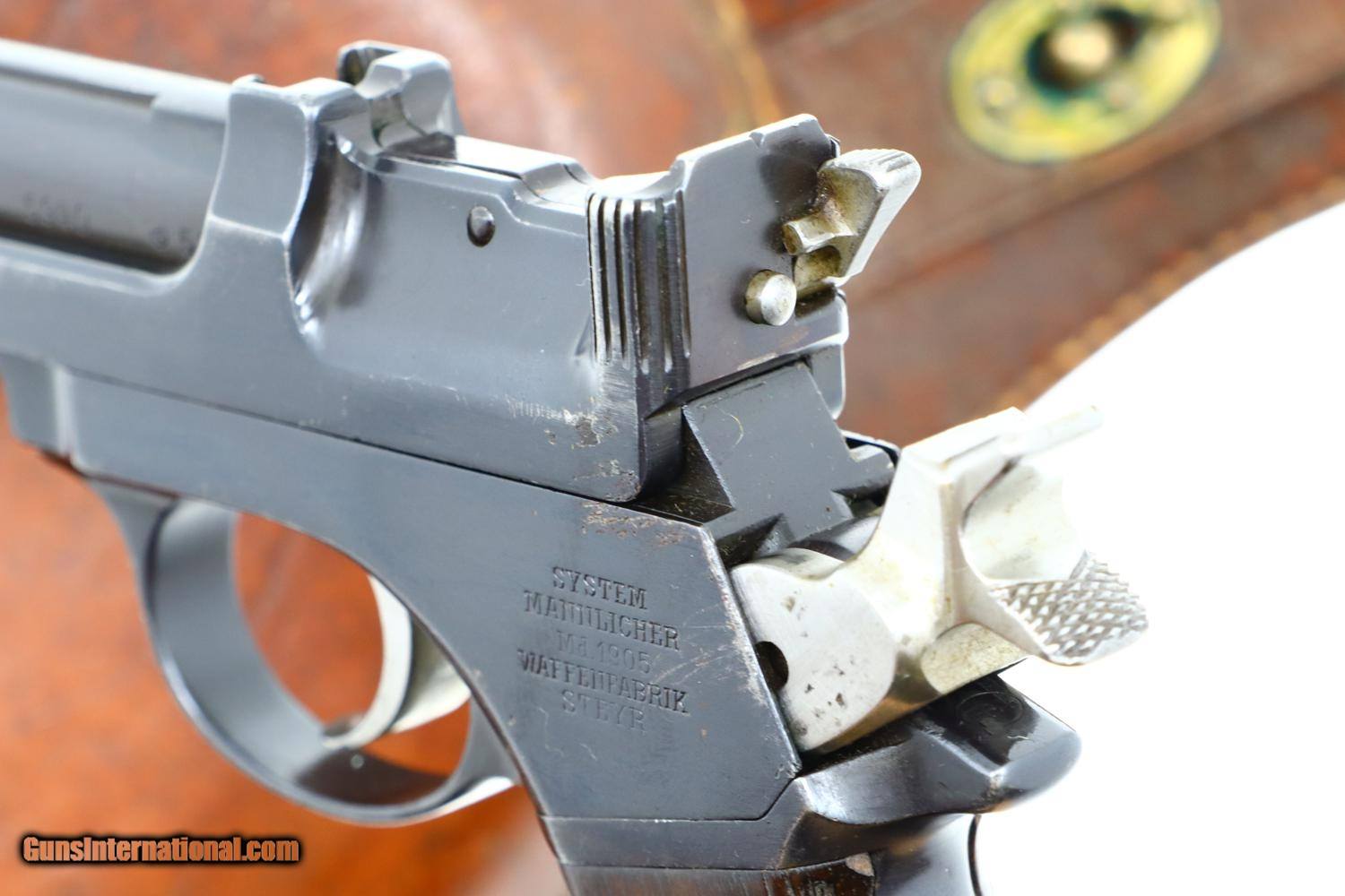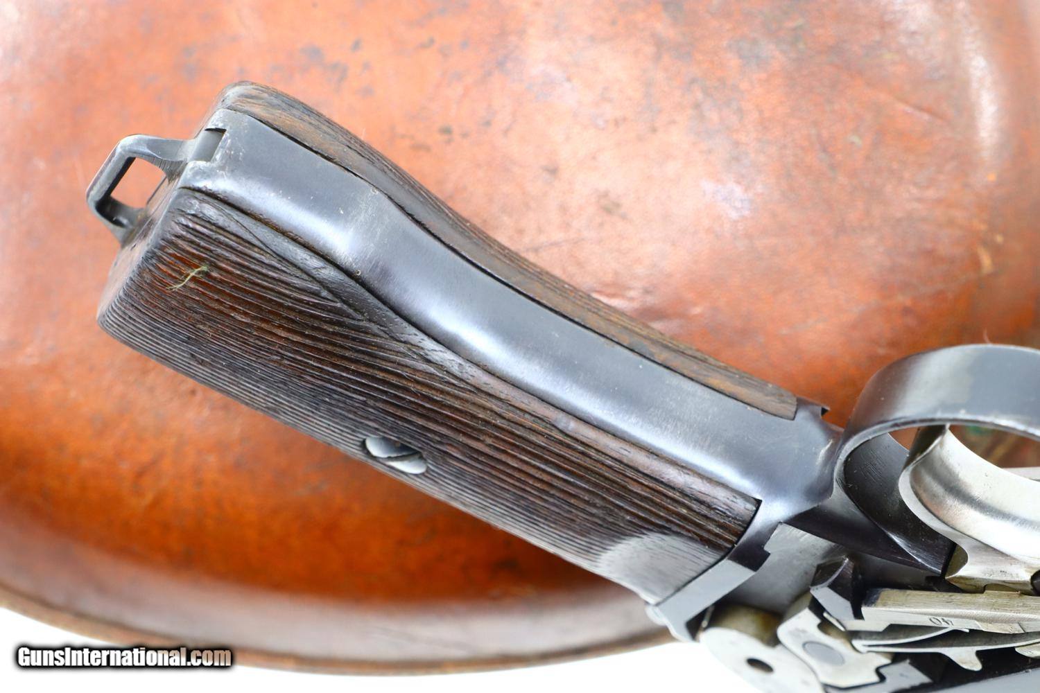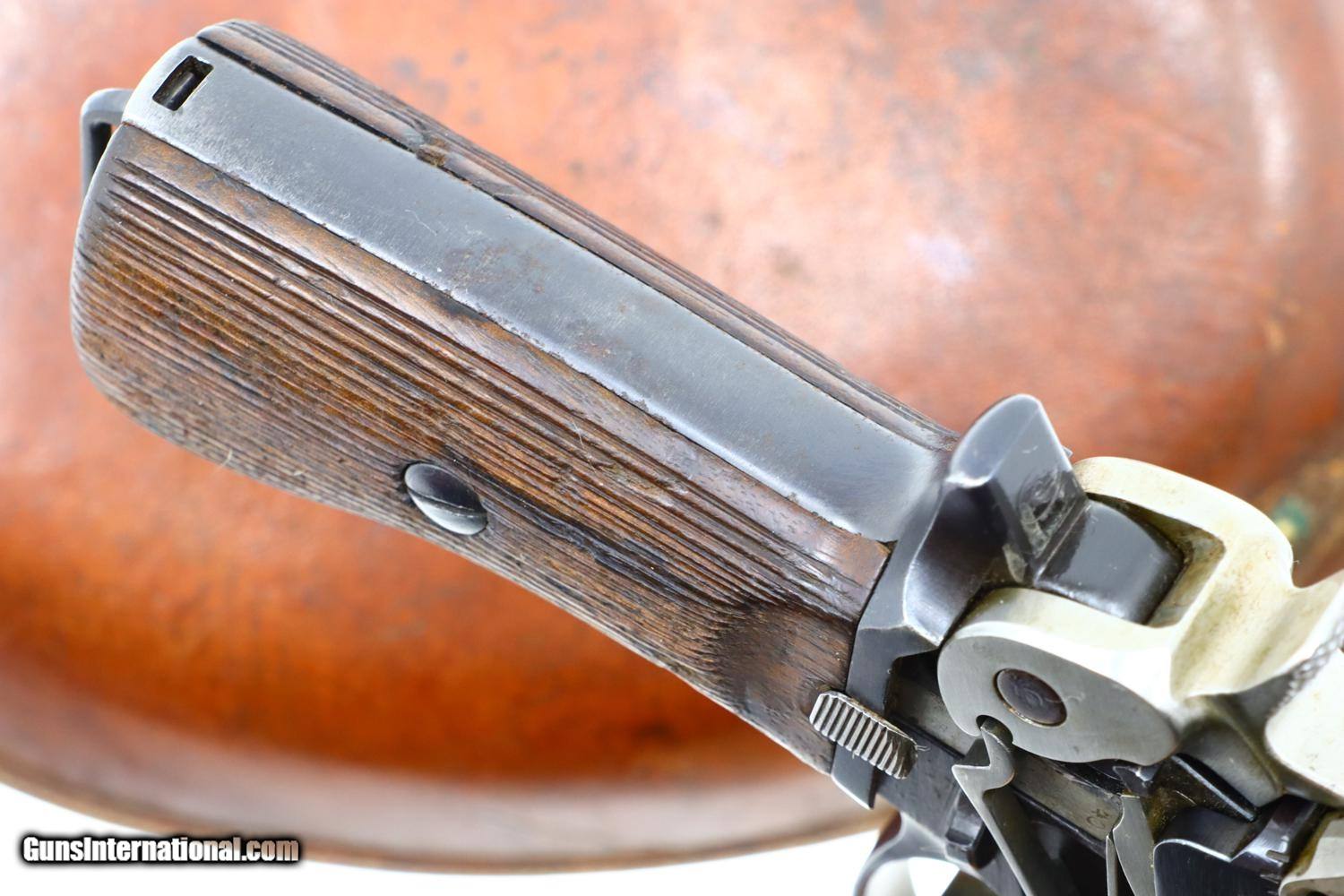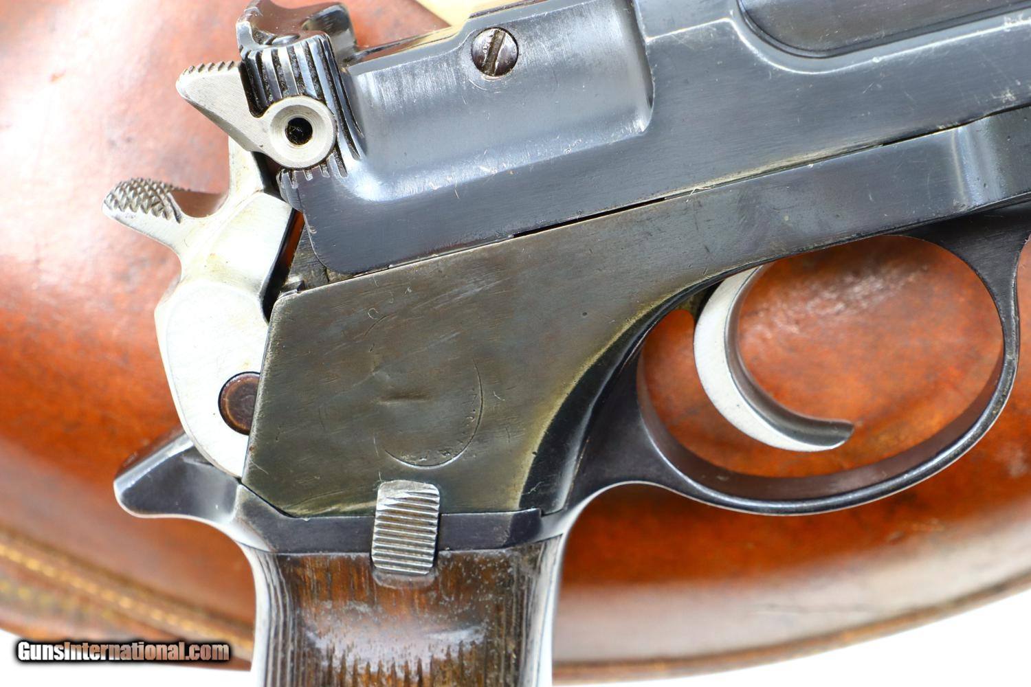 Description: Standard configuration Mannlicher 1905 with 6.25” barrel having drift adjustable front sight and fixed rear sight. Five line address reflecting model and manufacturer by Steyr on left side of slide plate. Full serial number on left side of barrel, chamber, and forward extension of sideplate, the last few digits repeated on several internal parts. Encircled “RA” on top of tang. Argentine crest removed from right side of sideplate. Fitted with vertically serrated grips. Complete with original Argentine holster, initials “AF” scribed below belt loop. Synopsis: Unusual Mannlicher 1905 Pistol, caliber 7.63 Mannlicher, made by Steyr in Austria, this example having been made for the Argentine military, crest removed upon deaccessioning, all matching with holster. Condition: VG as reworked/redipped upon deaccessioning with holster wear and fading as photographed. Bright bore with sharp rifling. Perfect manual mechanics. Comparable condition holster with mildewing. ~~Insured shipping fee of $55; most packages shipped using FedEx 2nd Day.~~ SOLD Curio/Relic: Yes Manufacturer: Mannlicher Serial Number: 5940 Caliber Info: 7.63mm |