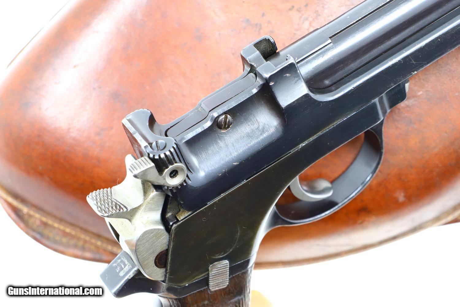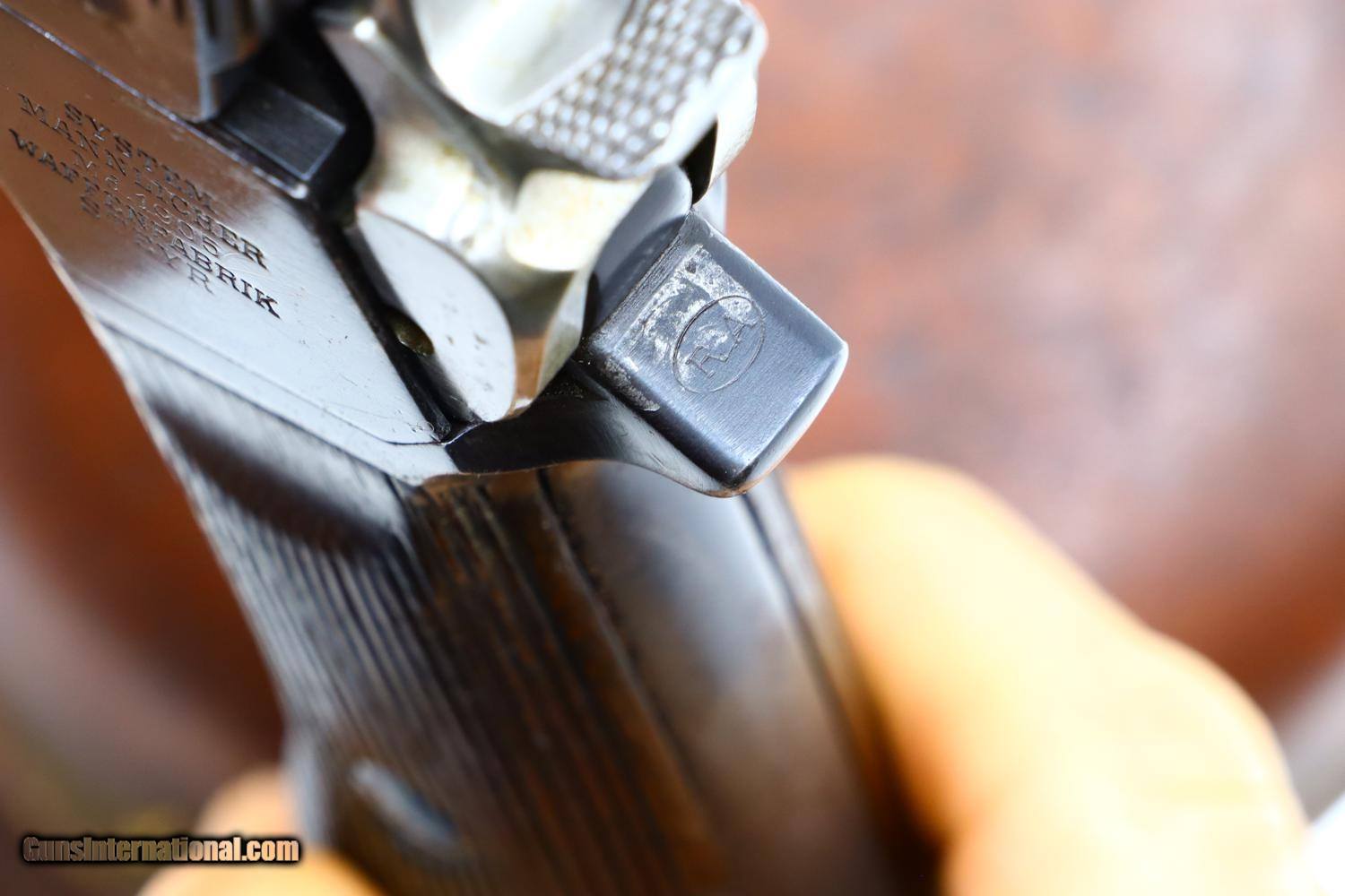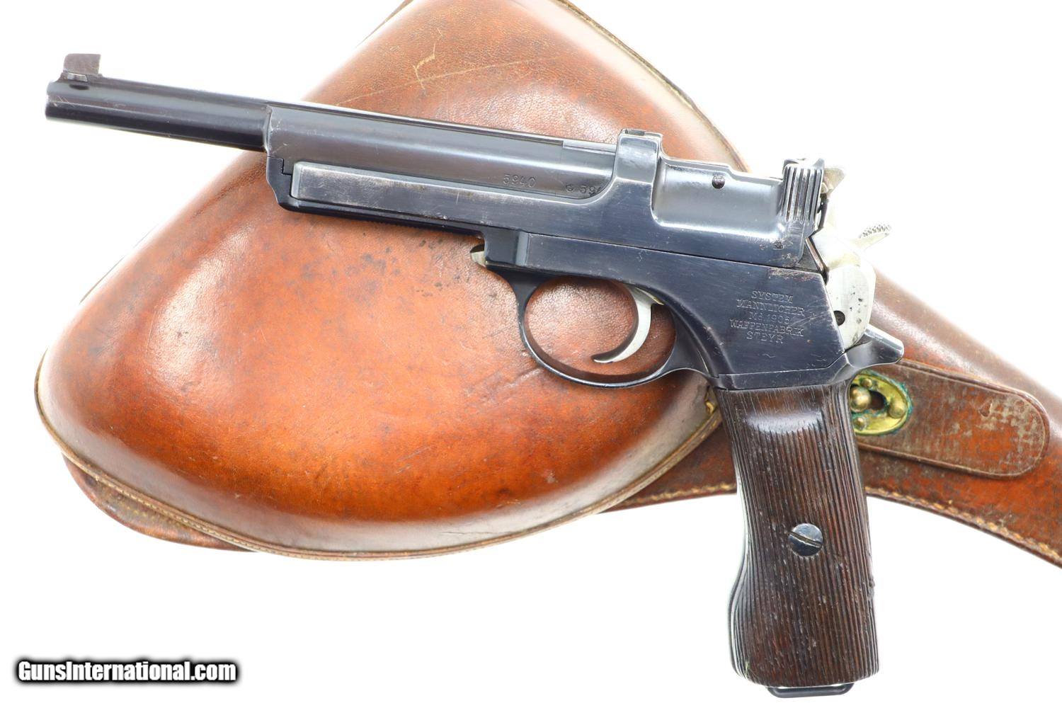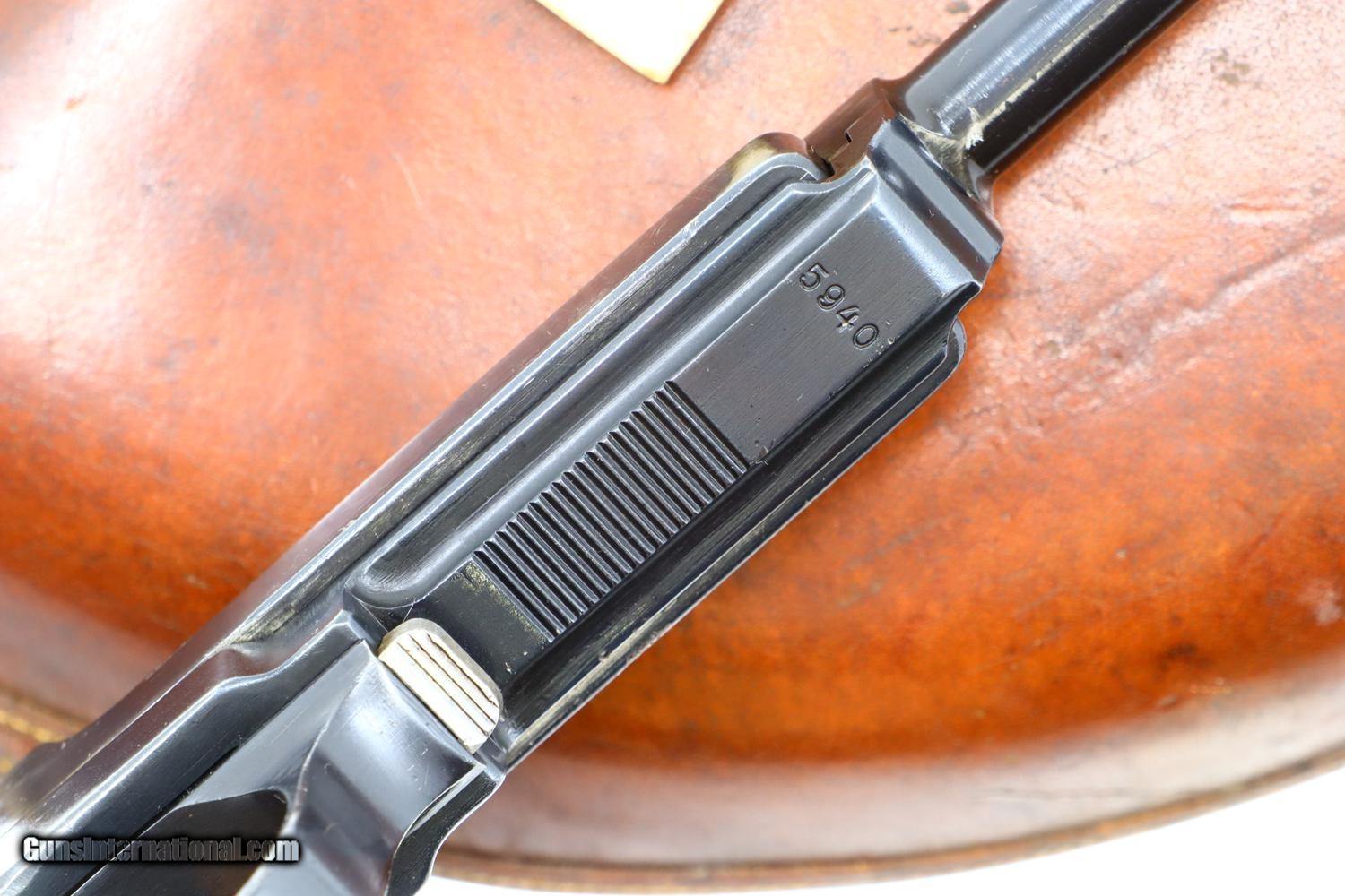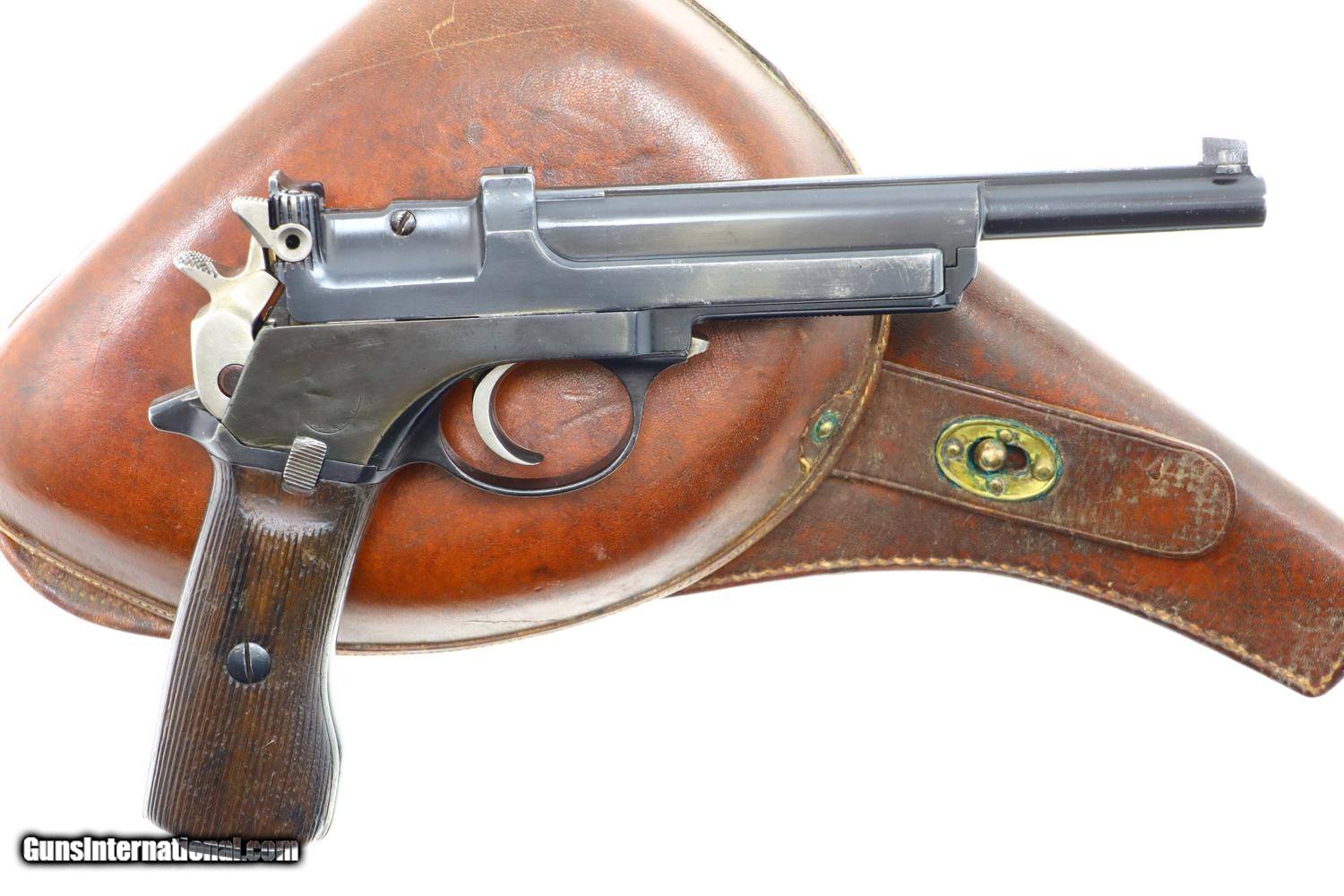 Description: Standard configuration Mannlicher 1905 with 6.25” barrel having drift adjustable front sight and fixed rear sight. Five line address reflecting model and manufacturer by Steyr on left side of slide plate. Full serial number on left side of barrel, chamber, and forward extension of sideplate, the last few digits repeated on several internal parts. Encircled “RA” on top of tang. Argentine crest removed from right side of sideplate. Fitted with vertically serrated grips. Complete with original Argentine holster, initials “AF” scribed below belt loop. Synopsis: Unusual Mannlicher 1905 Pistol, caliber 7.63 Mannlicher, made by Steyr in Austria, this example having been made for the Argentine military, crest removed upon deaccessioning, all matching with holster. Condition: VG as reworked/redipped upon deaccessioning with holster wear and fading as photographed. Bright bore with sharp rifling. Perfect manual mechanics. Comparable condition holster with mildewing. ~~Insured shipping fee of $55; most packages shipped using FedEx 2nd Day.~~ SOLD Curio/Relic: Yes Manufacturer: Mannlicher Serial Number: 5940 Caliber Info: 7.63mm |