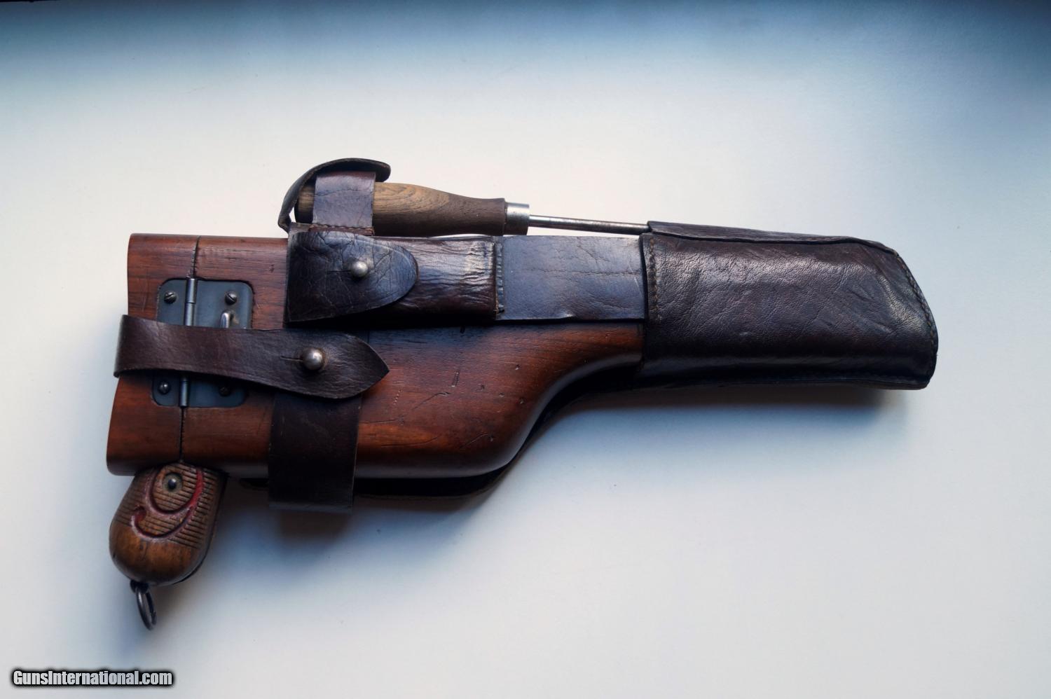 Description: THIS IS A MAUSER BROOMHANDLE RED 9 (ADJUSTABLE SIGHT) RIG, 9MM. THE PISTOL IS IN VERY GOOD CONDITIO, ALL ORIGINAL, NUMBER MATCHING, VERY GOOD BORE AND GRIPS (GRIPS ARE NUMBERED TO THE GUN. MECHANICALLY CORRECT AND TIGHT. THE RIG CONSISTS OF THE GUN, 1 HOLSTER, 1 WOODEN STOCK NUMBERED TO THE GUN , 1 LOADING TOOL, 1 LOADING SPRING AND 1 STRIPPER CLIP W/ AMMO. ALL COMPONETS ARE ORIGINAL. THIS IS A VERY NICE BROOMHANDLE RED 9 RIG. NOTE: ORIGINALI AMMO IS FOR DISPLAY AND NOT TO BE USED. SOLD Curio/Relic: Yes |