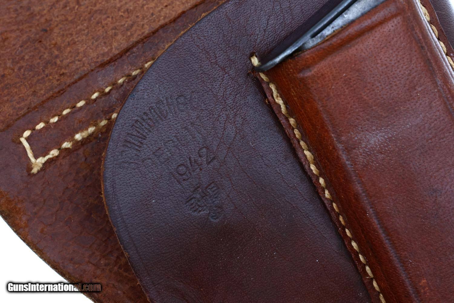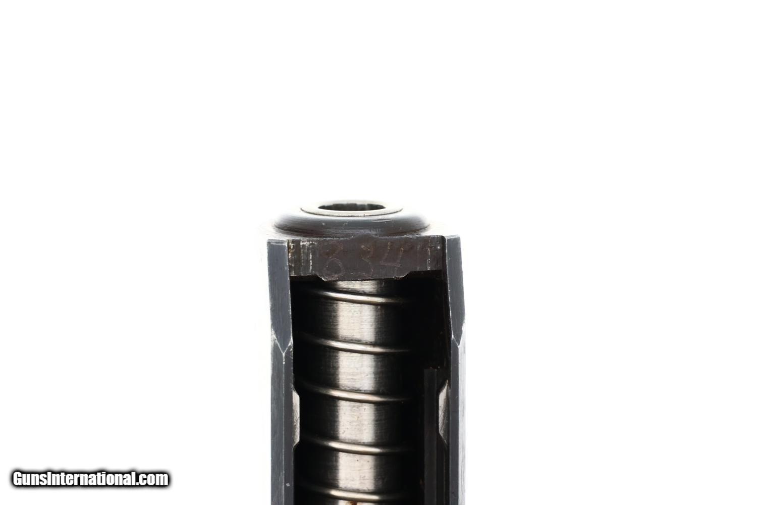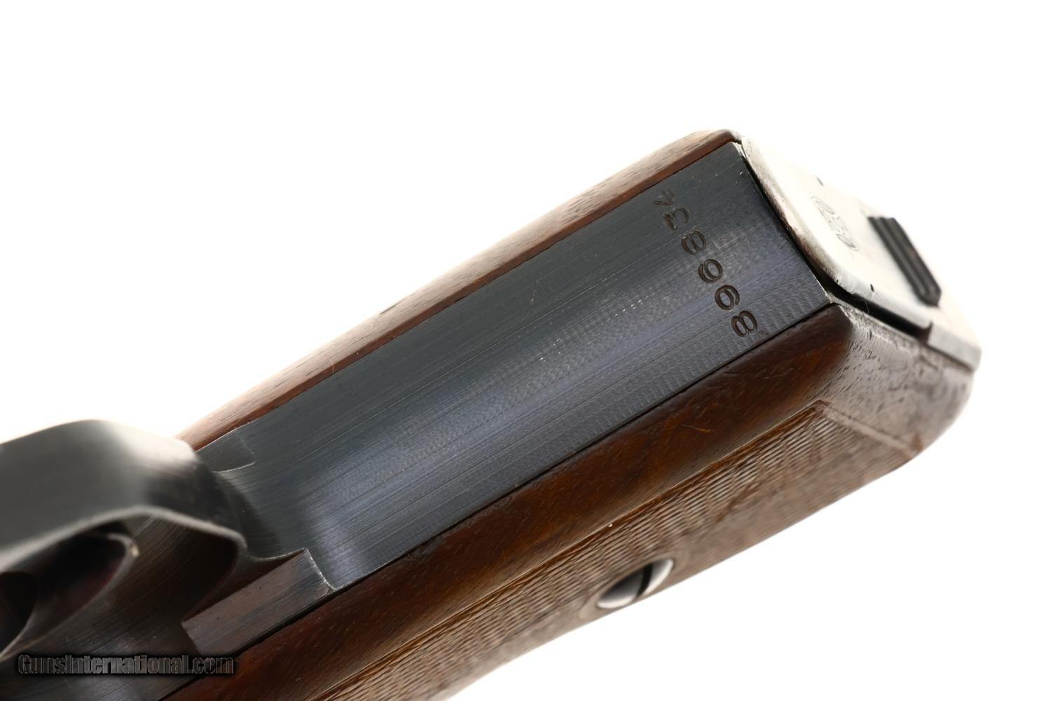 Standard German military Mauser HSc semi-automatic pistol issued to the German Police chambered in 7.65mm (.32 ACP) with 3.4? barrel and SA/DA mechanism. This wartime production example features the typical blued finish over noticeable factory machine marks. Smooth sighting channel on slide, and no lanyard recess on base of frame. Left side of slide marked with Mauser logo followed by “Mauser-Werke A.G. Oberndorf a.N.” with “Mod. HSc” and “Kal. 7.65mm”, while the Eagle L Police acceptance mark is on the trigger guard web. Full serial number “896834” appears on bottom of the frontstrap. Disassembly shows a matching barrel (stamped) and slide (electropenciled). Wood grips with pressed checkering. Two original magazines with in-the-white body having rounded toe and 7 indicators holes on each side. Mauser banner floorplate on primary mag only; the other floorplate is unmarked. Complete with original leather German police holster dated 1942.