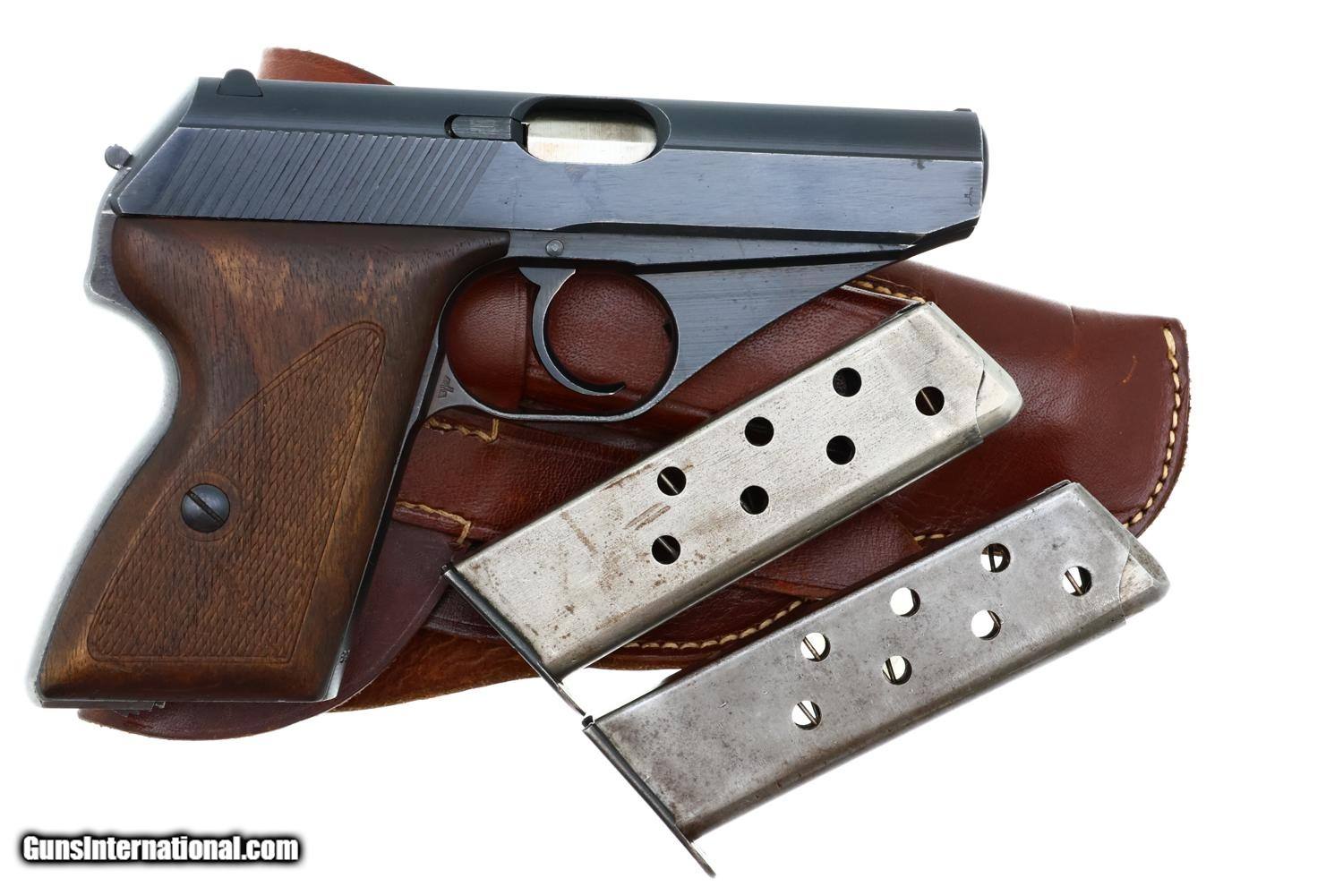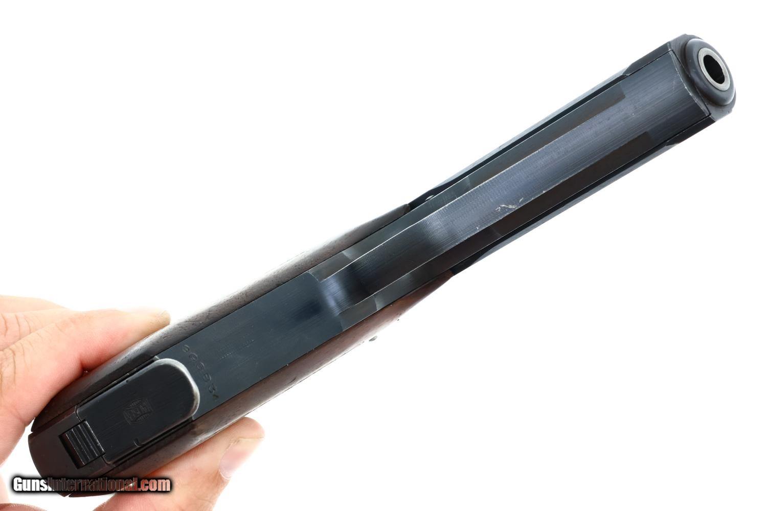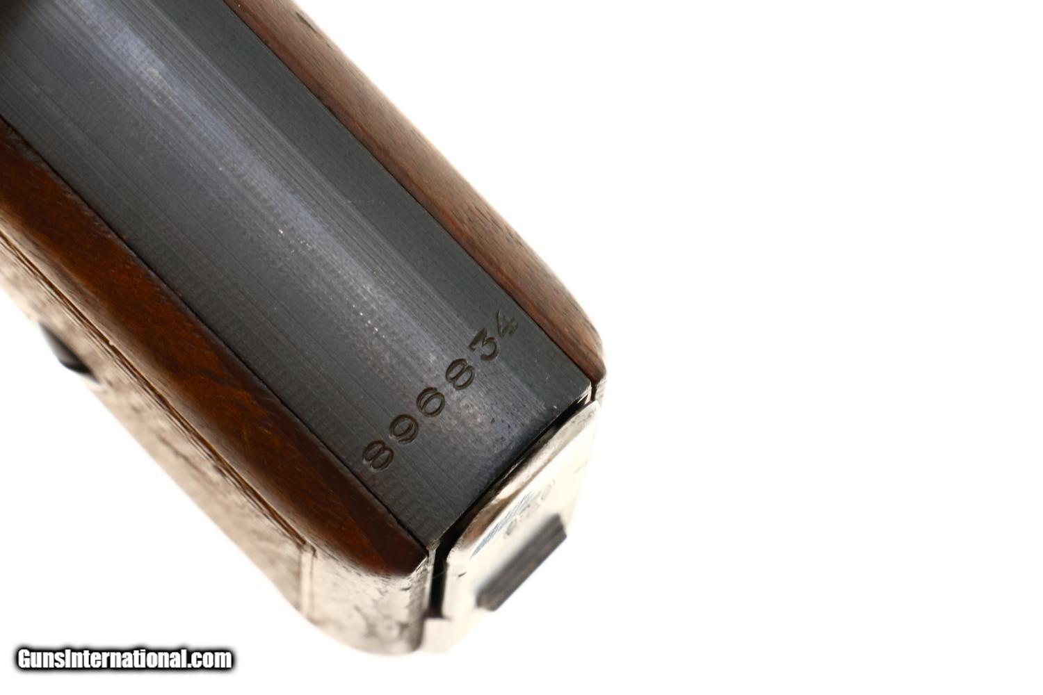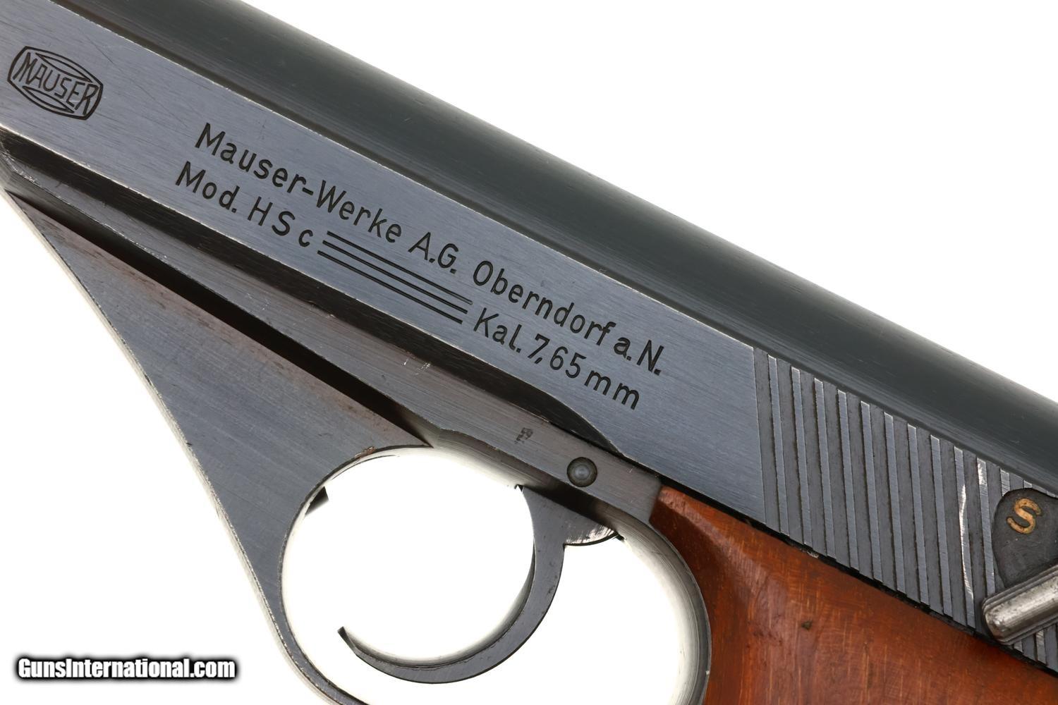 Standard German military Mauser HSc semi-automatic pistol issued to the German Police chambered in 7.65mm (.32 ACP) with 3.4? barrel and SA/DA mechanism. This wartime production example features the typical blued finish over noticeable factory machine marks. Smooth sighting channel on slide, and no lanyard recess on base of frame. Left side of slide marked with Mauser logo followed by “Mauser-Werke A.G. Oberndorf a.N.” with “Mod. HSc” and “Kal. 7.65mm”, while the Eagle L Police acceptance mark is on the trigger guard web. Full serial number “896834” appears on bottom of the frontstrap. Disassembly shows a matching barrel (stamped) and slide (electropenciled). Wood grips with pressed checkering. Two original magazines with in-the-white body having rounded toe and 7 indicators holes on each side. Mauser banner floorplate on primary mag only; the other floorplate is unmarked. Complete with original leather German police holster dated 1942.