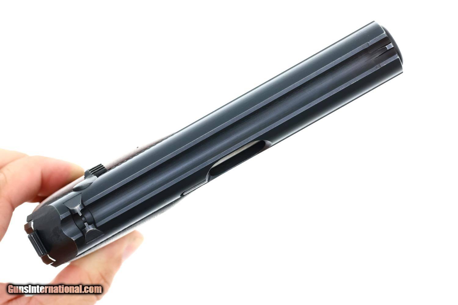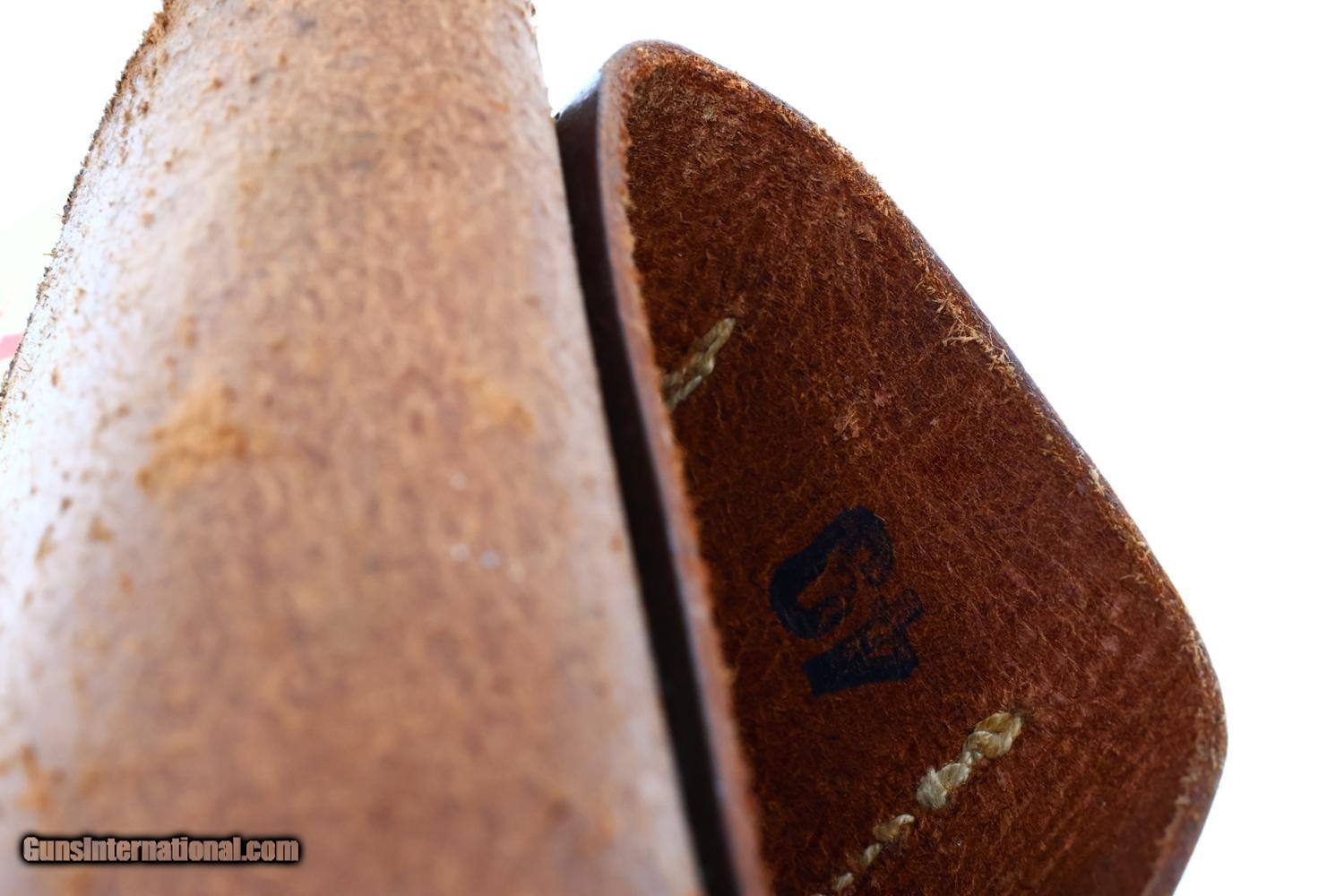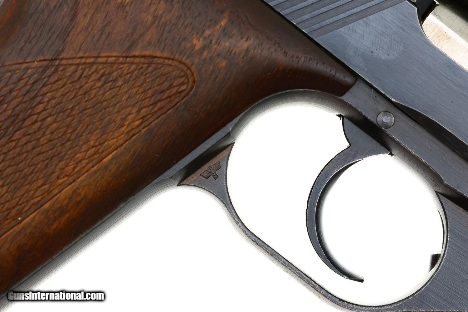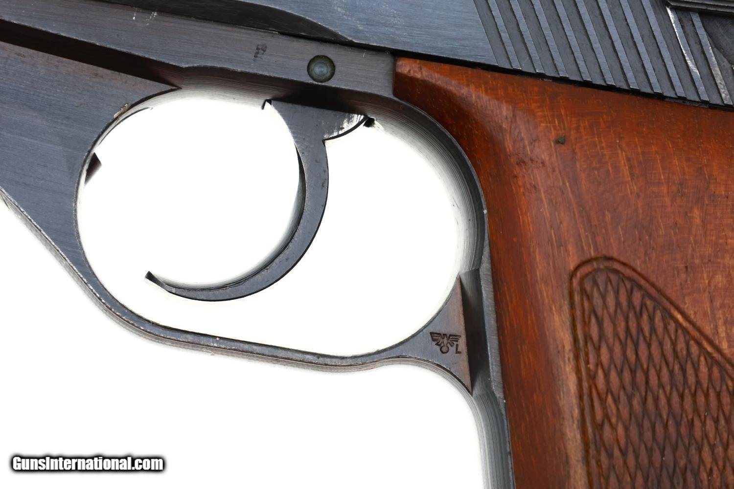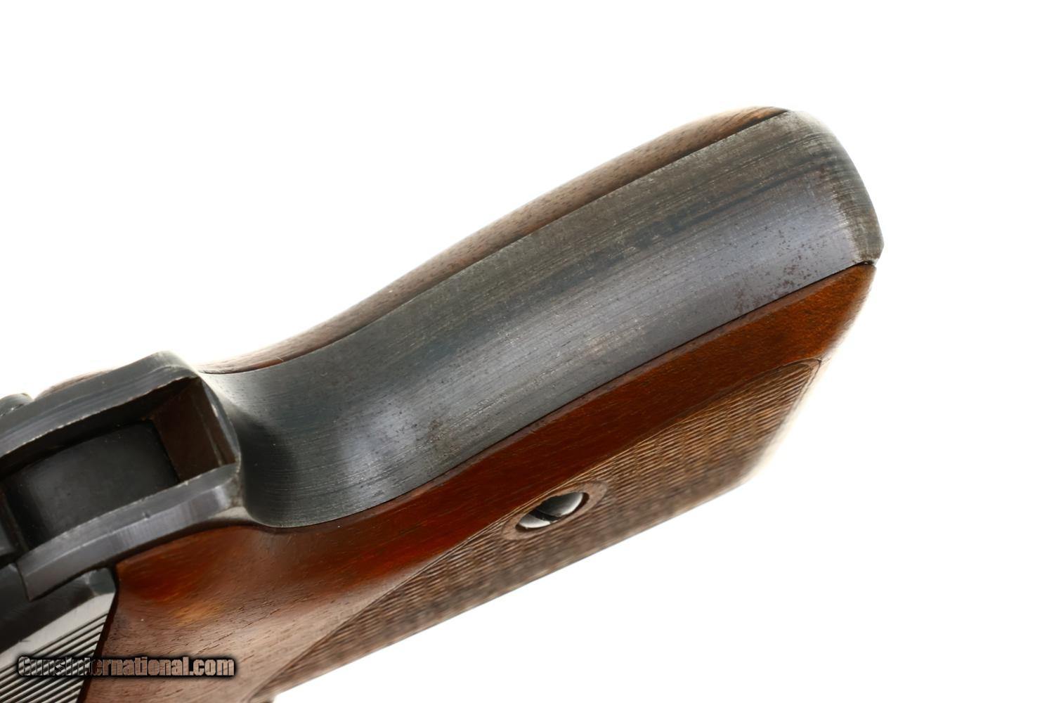 Description: Synopsis: This Mauser HSc is a WWII-era German semi-automatic pistol chambered in 7.65mm (.32 ACP), marked with the Eagle L Police acceptance stamp, complete with an original 1942 dated leather holster and two magazines, in near excellent condition. Description: Standard German military Mauser HSc semi-automatic pistol issued to the German Police chambered in 7.65mm (.32 ACP) with 3.4? barrel and SA/DA mechanism. This wartime production example features the typical blued finish over noticeable factory machine marks. Smooth sighting channel on slide, and no lanyard recess on base of frame. Left side of slide marked with Mauser logo followed by “Mauser-Werke A.G. Oberndorf a.N.” with “Mod. HSc” and “Kal. 7.65mm”, while the Eagle L Police acceptance mark is on the trigger guard web. Full serial number “896834” appears on bottom of the frontstrap. Disassembly shows a matching barrel (stamped) and slide (electropenciled). Wood grips with pressed checkering. Two original magazines with in-the-white body having rounded toe and 7 indicators holes on each side. Mauser banner floorplate on primary mag only; the other floorplate is unmarked. Complete with original leather German police holster dated 1942. Condition: Near excellent, bright, original factory salt blue with sharp edge wear and slight thinning of backstrap where in contact with holster flap as would be expected from a largely carried but seldom used police pistol. Comparable condition oil darkened grips with intact tips showing no repair. Magazines with slight age darkened bodies, most of the original bluing on their floorplates intact. EXC leather with staining in exposed areas, no suggestion of repair. Mirror bore. Correct manual mechanics. An attractive late WWII German Police Eagle L rig! Manufacturer: Mauser Model: HSc Serial Number: 896934 Caliber Info: 7.65 Condition: EXC Price: $1,895.00 Contact Seller |