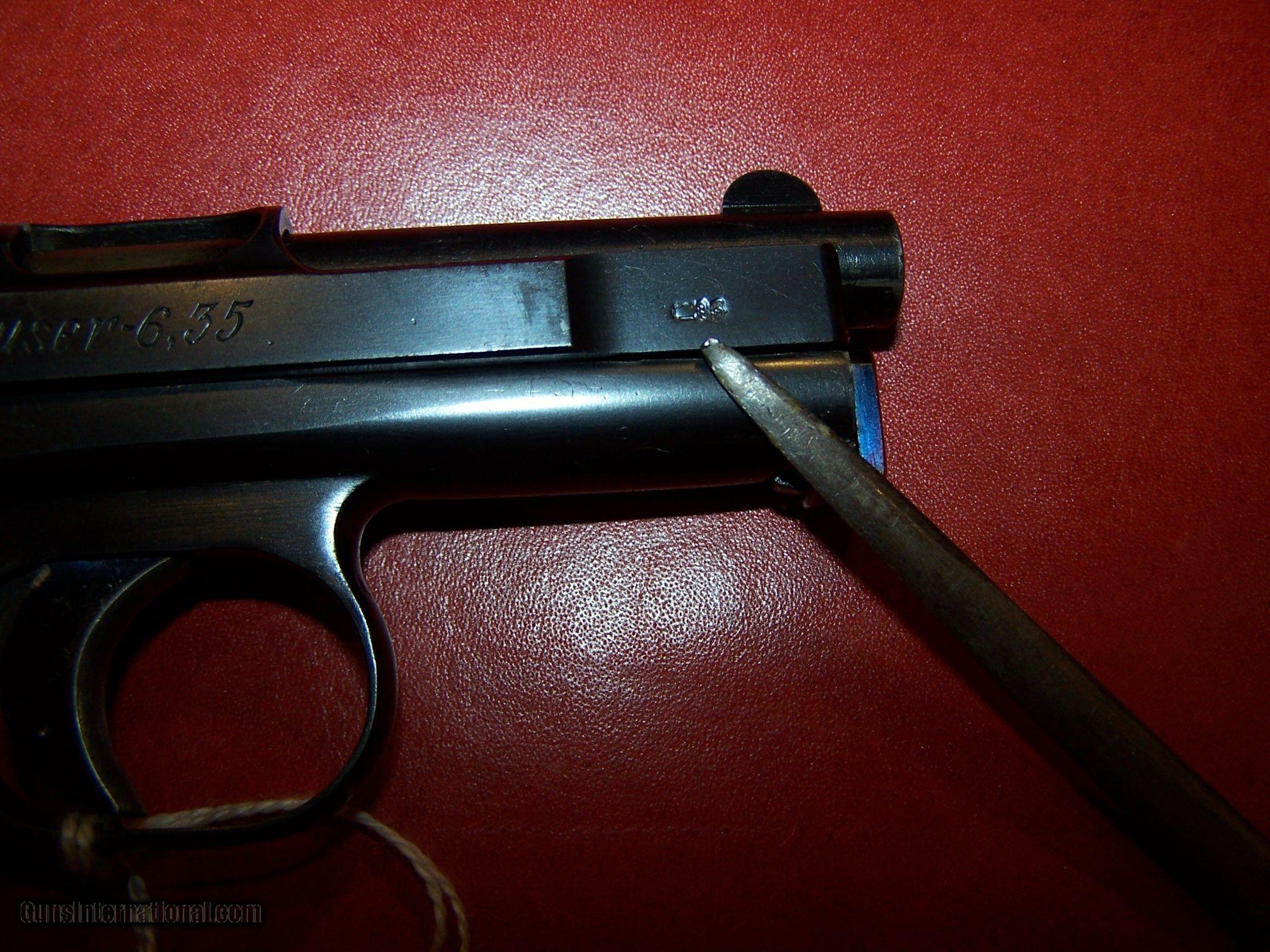 Description: MAUSER model M1910 6.35 mm semi-auto Military marked. One piece wooden grips flawless. (Grip color is true in photo #1, color is washed out due to flash in photo #10) 99% blued finish. Magazine stamped with Mauser badge. Bore is bright and shiney. Military mark on right front of slide. (see photo #2 letter opener pointing to military mark) See photo #5 - the tag has a sketch of the mark. Right side of slide "Mauser - 6,35 " Left side of slide "WAFFENFABRIK MAUSER A G OBERNDORF a N." Mauser badge stamped on left side of frame. All matching serial numbers appear in three places : 262893 left front of slide. 2893 on rear of frame just above grip. 2893 at underside of frame at trigger guard A minty semi-auto Mauser - I dont believe there could be a better one. The one piece wooden grips is a work of art just by itself !! I prefer bank cashiers check mailed to my POB. I am a LIFE NRA, and VP of my own local gun club. NO PAYPAL due to their draconian knee jerk rules on payments on firearms ! SOLD Curio/Relic: Yes |