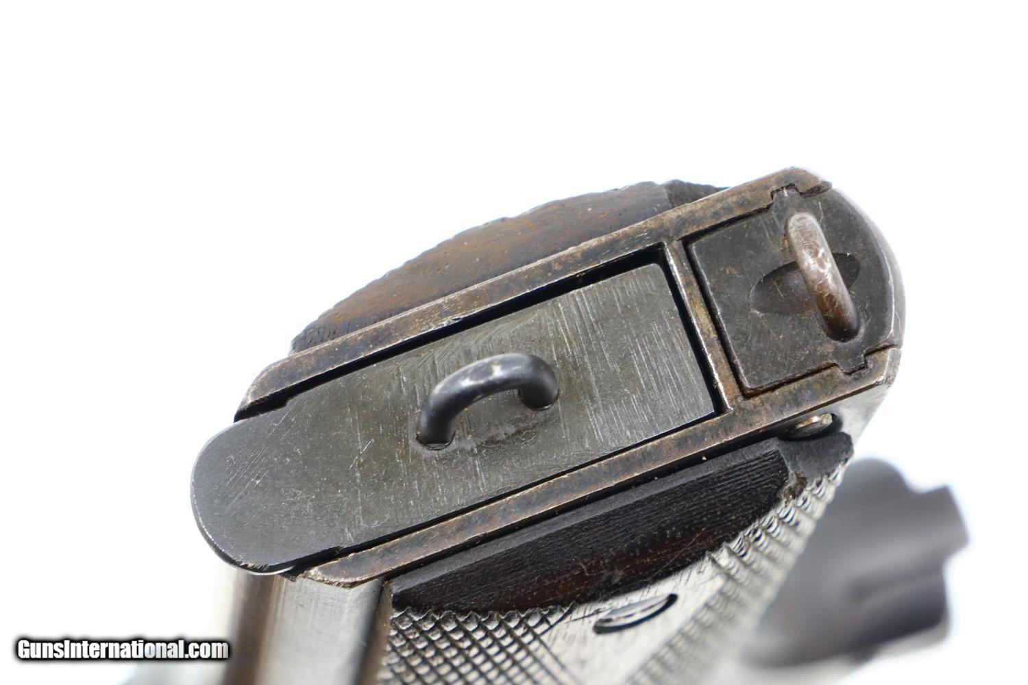 Description: Synopsis: Beautiful, all matching Norwegian 1914, Kongsberg Arsenal, 1926 Date, .45 ACP, 11024, A-1906 Description: Standard configuration Norwegian model 1914, caliber .45ACP, this example dated 1926, ALL MATCHING with correct, original grips, and magazine. Left side of slide with usual Norwegian reference with respect to caliber, model, and serial number. The right side of slide is dated 1926. Serial number is repeated on all major and minor components including the frame, slide release, trigger, safety, grip safety, main spring housing, barrel, firing pin retainer, hammer, magazine release, bushing, recoil spring guide and recoil spring cap. Grips and magazine were never numbered. All parts with original matte finish. Case hardened hammer. Fire blued extractor. Correct magazine with laynard loop. No import marks. Condition: Near EXC, wear consistent with light service use. Comparable condition grips and magazine. Mirror bright bore. Perfect manual mechanics. A very high condition Norwegian 1914, all matching, made in 1926! ~~Insured shipping fee of $75; most packages shipped using FedEx 2nd Day.~~ SOLD Manufacturer: Kongsberg Arsenal Serial Number: 11024 Caliber Info: .45 ACP |