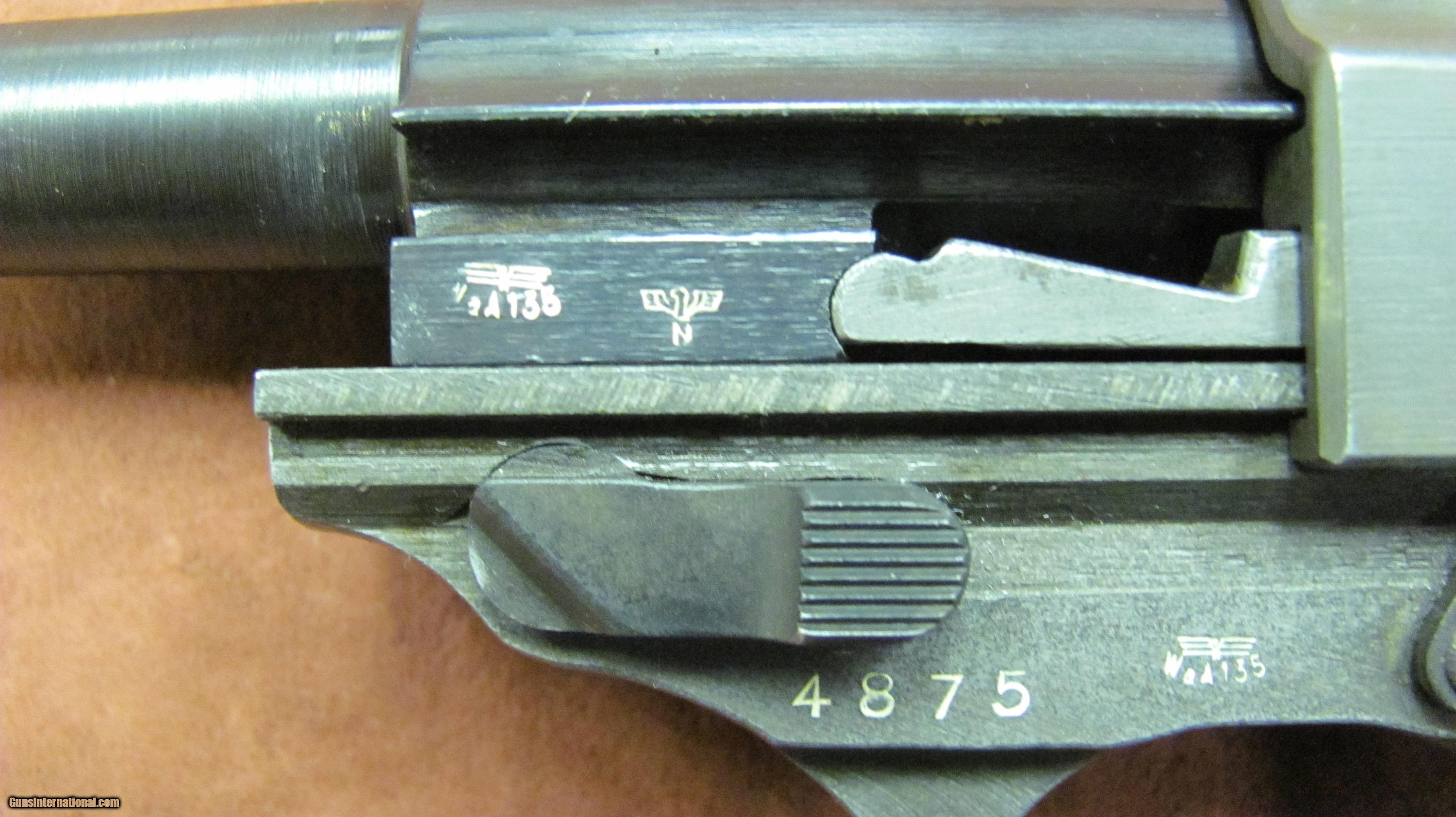 Description: This is an extremely RARE Police P.38. It is an "AC-43 (FN slide) Eagle F Police". Buxton's Vol. 2 The P.38 Pistol, list this variation as only 1% estimated of ALL the POLICE P.38's procured. Jan Still's Axis Pistols, estimated that total procurement of the AC-43 (FN) Police pistols at 100!. This gun's serial number is listed in those reported in Jan Still's book. The gun is in excellent condition. A two-tone variation, with blued barrel and phosphated slide and frame. All matching and the bore diameter (8.82) stamped on the bottom of the barrel. SOLD Curio/Relic: Yes Manufacturer: Mauser Model: P.38 Police Caliber Info: 9mm Bore: Excellent Condition: Excellent over all |
