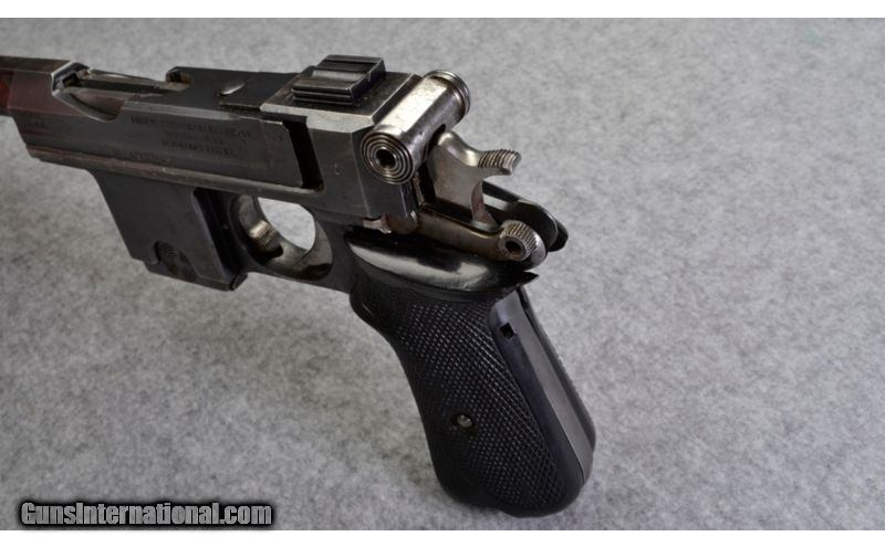 Description: Bergmann's patent manufactured by Anciens Etablissements Herstal-Liege Belgium. Serial number 17568. Also stamped Brevete S.G.D.G. Proofmarks include Crown over "D" on left side of frame, lone Crown on top of the slide. Right side rear of frame stamped 4572. Under barrel stamped 12. Magazine numbered 2055. SOLD Curio/Relic: Yes Manufacturer: 1901-1910 then 19*22-1935 Caliber Info: Not stamped on firearm, possibly 9mm Bergmann Metal Condition: Very Good for age and use. Bore Condition: Very Good for age and use. Barrels: 4" flat topped solid rib. Triggers: Polished trigger and hammer. Stock: Checkered plastic material similar to Bakelite. Weight: 2.5 Pounds Sights: Fixed Item Location: Springfield, OR |