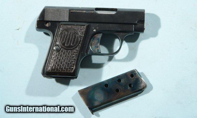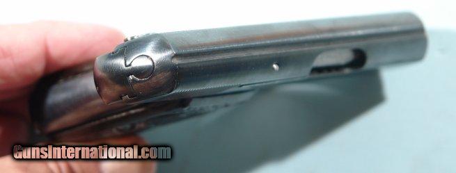 Description: PRE WAR CZ DUSEK DUO .25ACP POCKET PISTOL WITH EARLY TWO DIGIT SERIAL NUMBER. Serial number "4X". Custom blue with most of slide address and serial number visible as well as proof mark. Original magazine holds six. Custom case colored magazine and trigger. Original basket weave hard rubber grips fit nicely. Serial number on frame and under slide match. Slide address is "AUTOMATICKA PISTOLE "DUO" CAL. 6.35/ F. DUSEK, TOVARNA NA ZBRANE OPOCNO" denotes pre war manufacture and pre Nazi takeover of factory. Not exactly in working order. SOLD Curio/Relic: Yes |