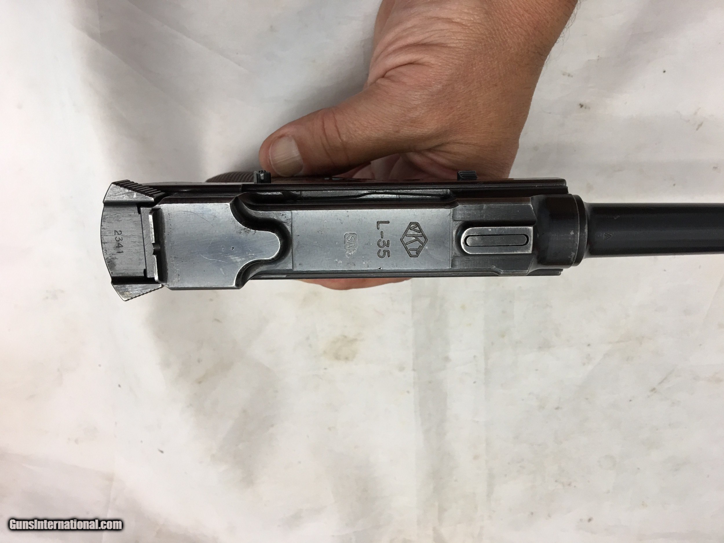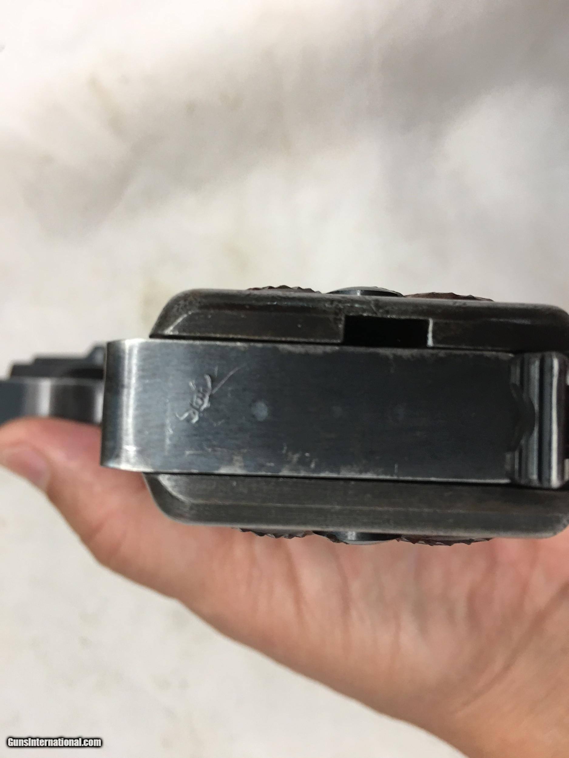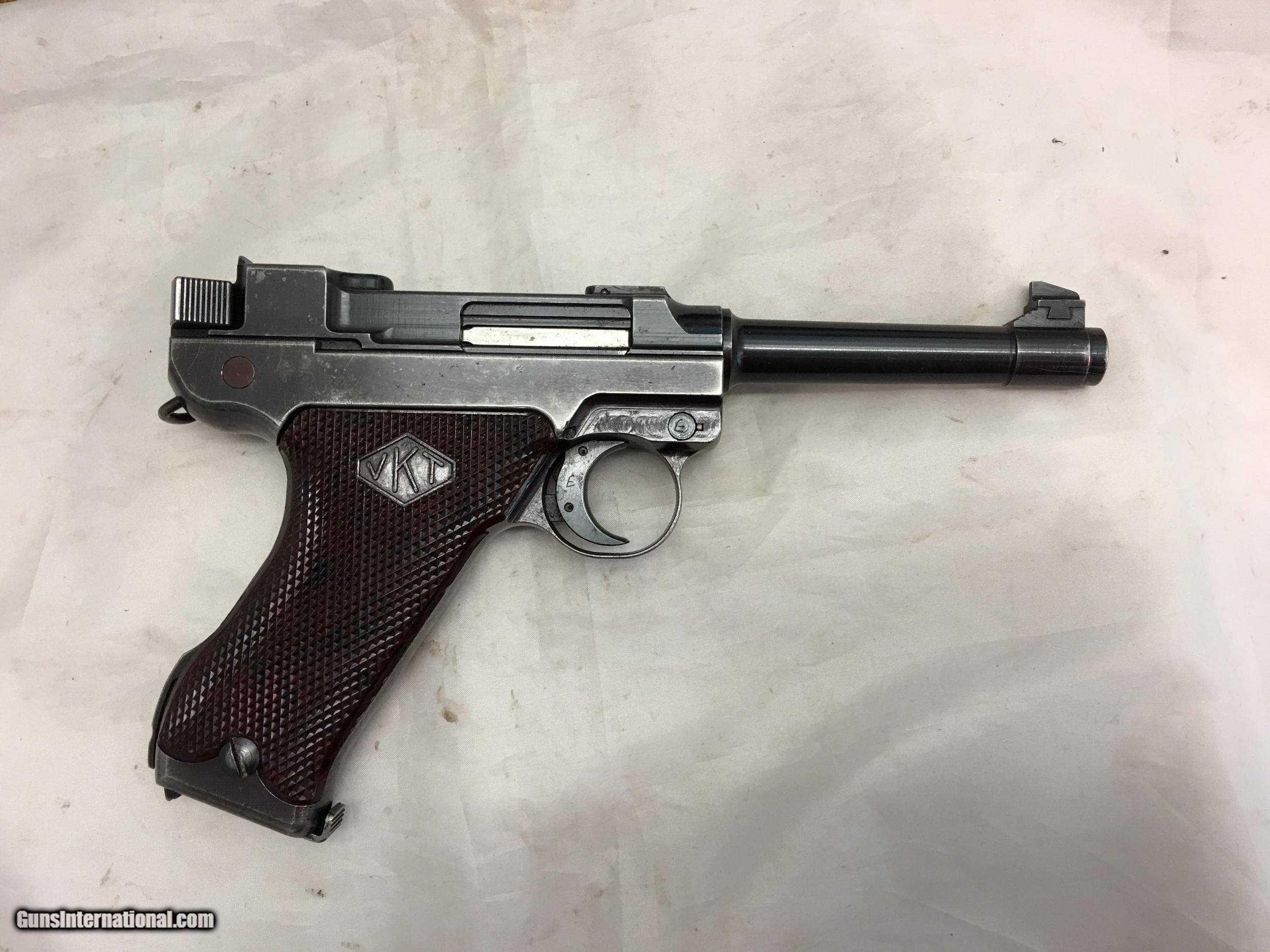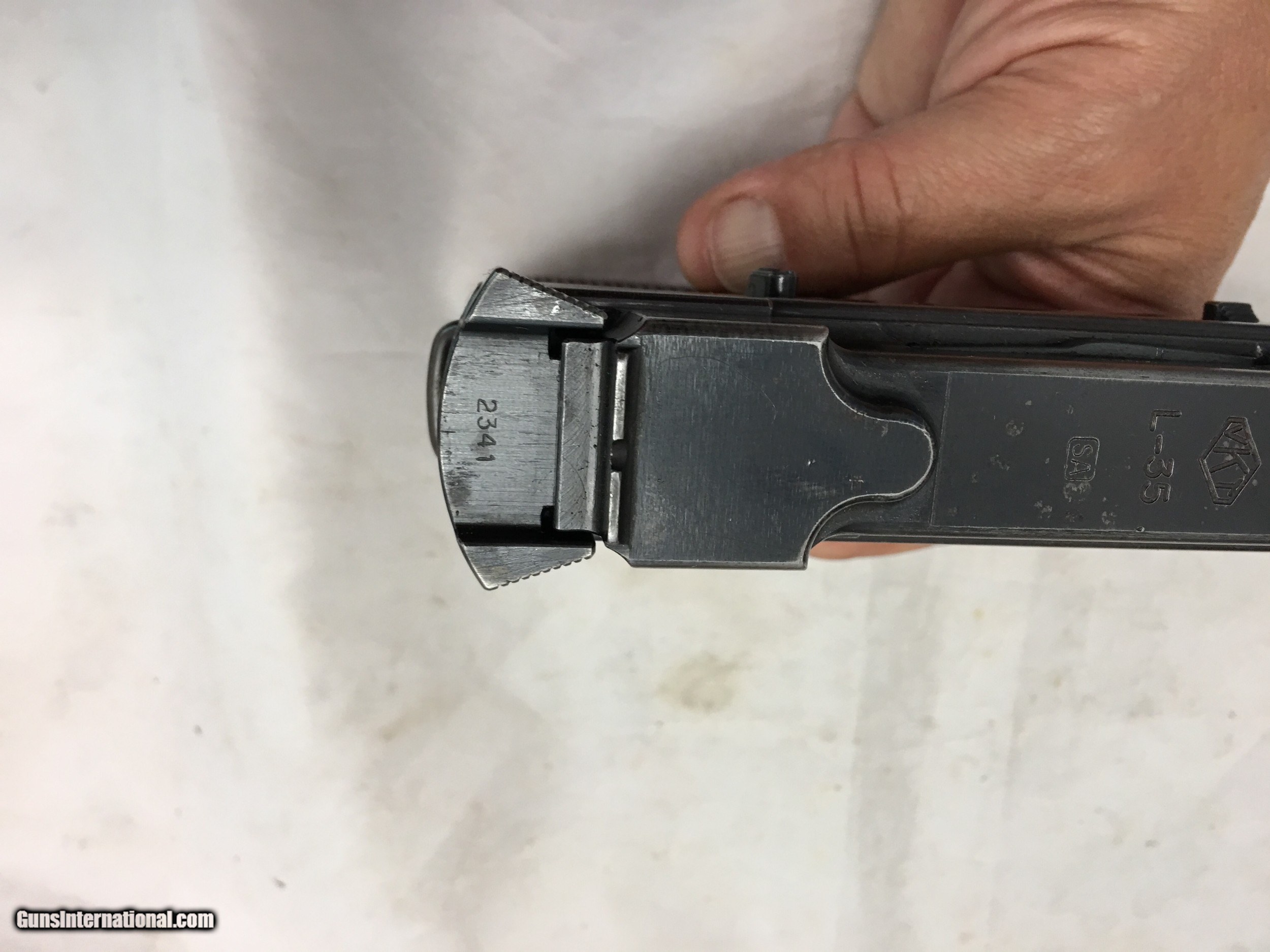 Description: This is one rare pistol. A first variation, military Finnish Lahti VKT L-35 pistol in excellent original condition. Only about 2000 of these rare guns were produced by the Finns in 1939-1940, with just a few being issued to the Finnish Army in time for the Winter War with the Soviet Union. This particular gun remains in its original "as issued" condition with about 90% of its original blueing remaining, with most of the wear limitied to the grip straps and to the high edges. It is an all matching gun with the frame, slide and the bolt having the same serial number. The VKT marked grips and the bore are mint. The top of the slide is stamped with the Finnish Army property mark - SA(SUOMI ARMEA) inside a rectangle. The floorplate of the magazine is stamped with the same marking as well. The gun comes with an original excellent brown holster, marked SA on the lid. The L-35 Lahti pistol was designed to withstand the temperatures of the Northern winters and was built like a tank. It is a heavy gun with very light felt recoil and has a grip angle similar to a Luger pistol. The first variation guns had a very distinctively shaped, curved rear slide bridge, that was eliminated on the subsequent production pistols. Only a handful of these guns exist in US, and near all of them reside in collections. This is a great opportunity to acquire an all original example in very good condition. FFL or C&R where allowed. SOLD Curio/Relic: Yes |
