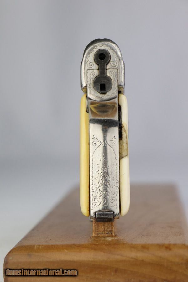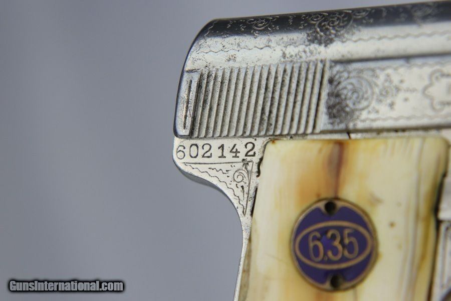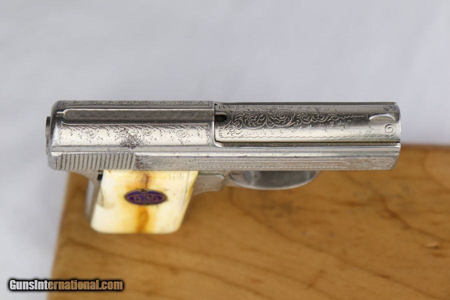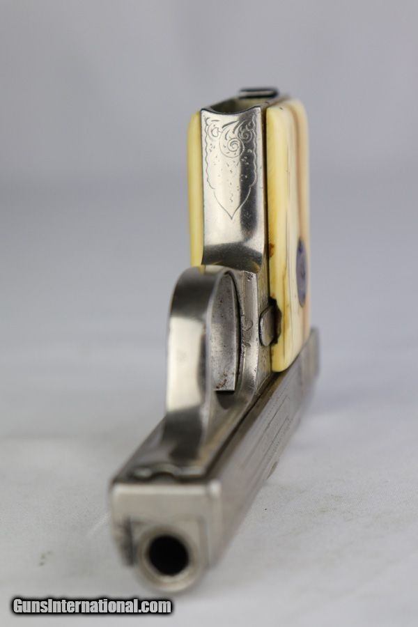Description: This is a very hard to find Engraved Walther Model 9. I am confident that the engraving is "factory", but there are no factory records to confirm that. The grips are slightly worn ivory and also factory original. The right grip panel is a bit loose, but could most likely be fixed with a "shim" in place under the grip, but if you know these guns, removing the grip is not something we want to mess with. It has an engraved bottom original Walther 9 magazine. The gun seems to function well, however, we are not necessarily recommending it be shot. The only part I am not sure about is the nickel finish. I believe it was originally nickel plated but may now have an old re-nickel finish. The finish does show age. Without question this is a rare factory Walther 9 in beautiful condition. It comes in a period display case, however, not a Walther factory case as there is no logo on the case. This gun comes to us as a consignment from a well known Walther collector. SOLD Curio/Relic: Yes Manufacturer: Walther Model: 9 Serial Number: 602142 Caliber Info: 6.35 Bore: 5/10 Condition: Very Good Metal Condition: Great Bore Condition: Used / Worn |