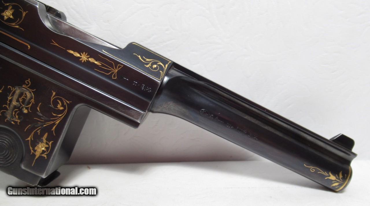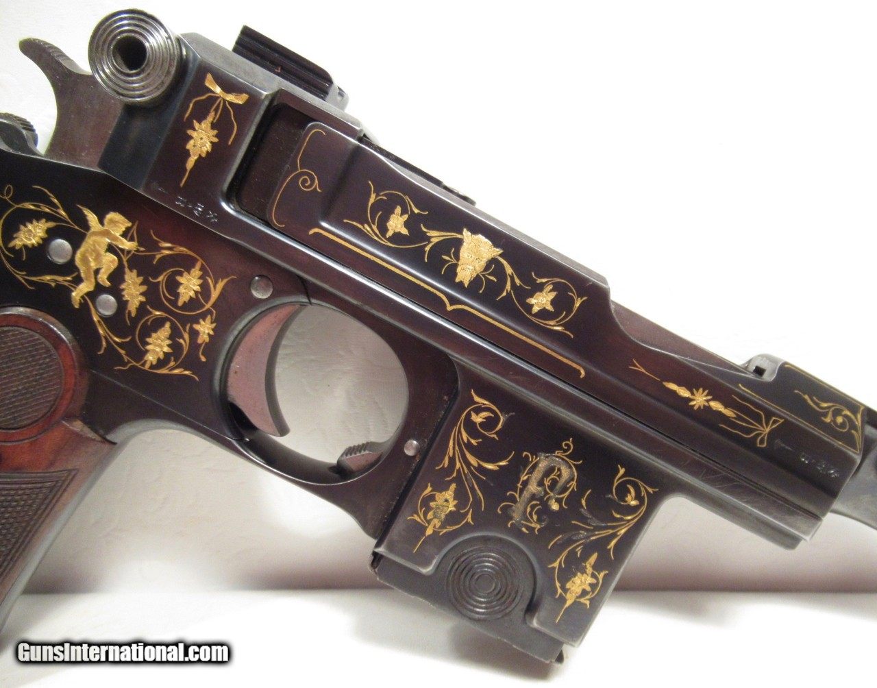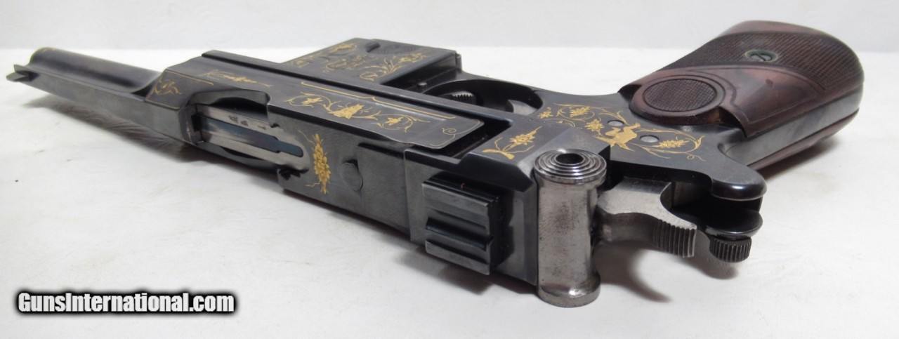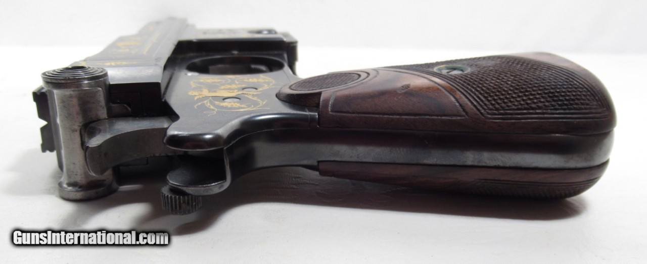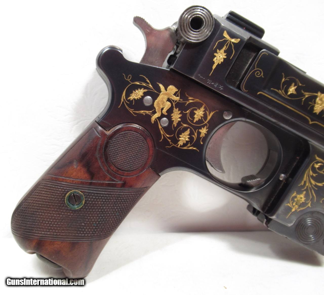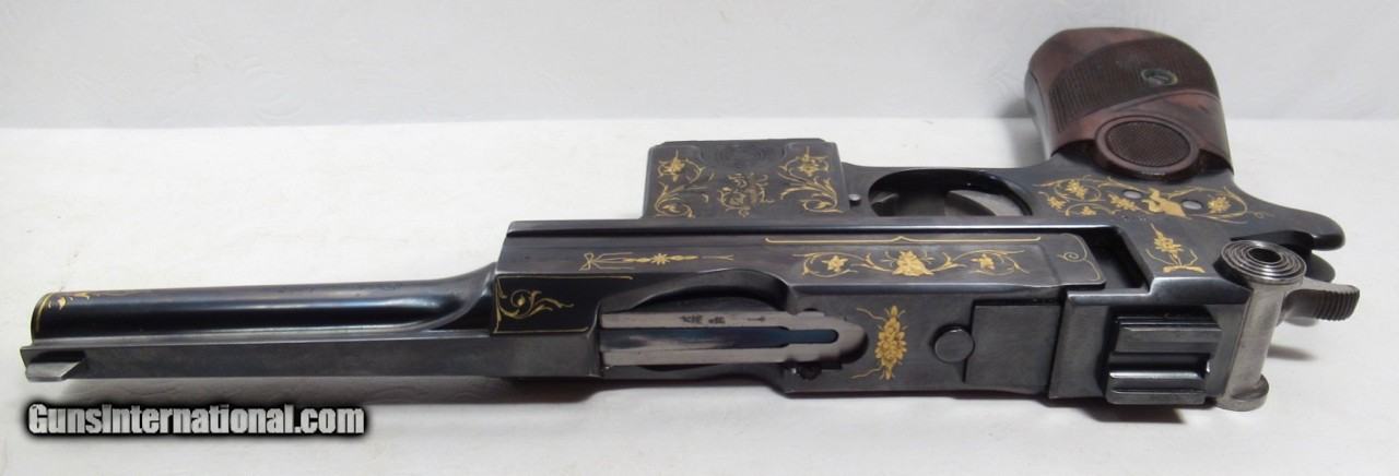 Description: Fantastic Presentation Bergman-Bayard Commercial Model 1910, Semi-Auto Pistol; Serial No. 5487; 9mm, Bergman (9x23) also 9mm Largo Caliber; Clearly a Presentation with Inlaid Gold Cherubs and Foliage in Fine Detail; Excellent Finish with some gold missing on left side and some gold line missing on rights side; 4” Barrel with Fine Burl Walnut Checkered Grips; Surely Done by a Master Engraver; Comes with Original Vintage Holster; Perfect Action, Strong Bore with minor flaws; Excellent Original Holster; Rare 110+ Year-Old Presentation Pistol; From the Buddy King, of Canadian, Texas Collection; See All Photos for Condition; No Texts; Call (254)541-5765 or Email Only; PERSONAL PROPERTY of Harold Wieser; Price: $12,975 + $45 S&H Via USPS PRIORITY MAIL; Payment Address: Harold Wieser - 1466 U.S. Hwy 77 - Rosebud, TX 76570; SEND PAYMENTS VIA USPS PRIORITY MAIL; BEWARE of SCAMS!!! – DO NOT SEND MONEY or CORRESPONDENTS ELECTRONICALLY UNLESS YOU HAVE SPOKEN to HAROLD WIESER FIRST! 254-541-5765 SOLD Manufacturer: Bergman-Bayard Model: 1910 Serial Number: 5487 |