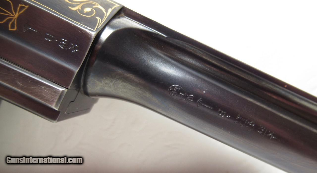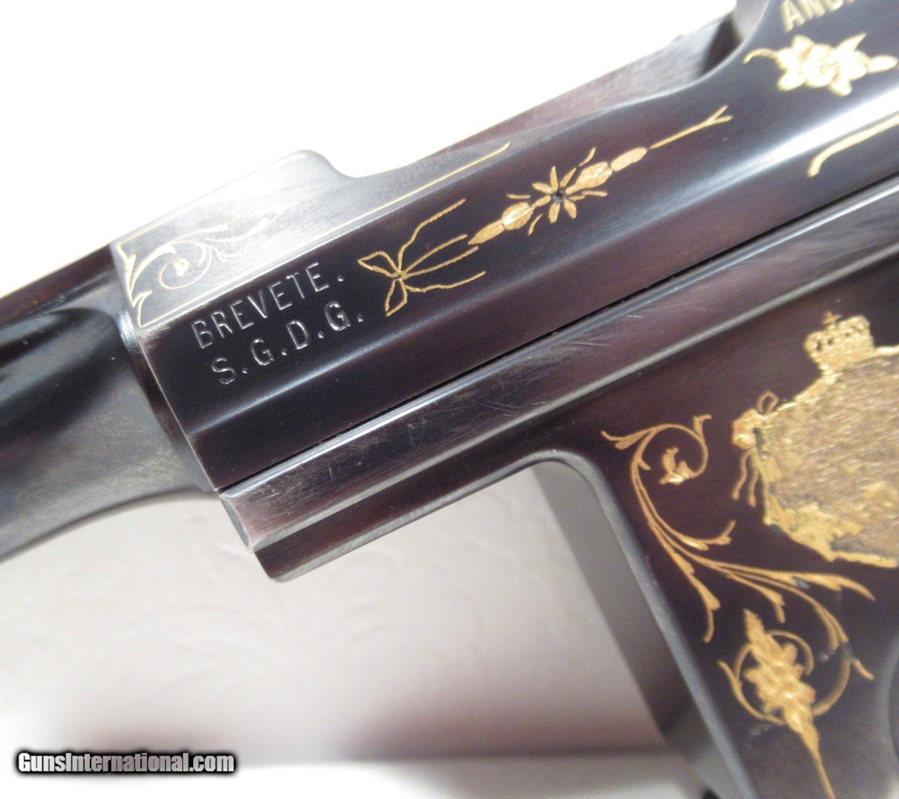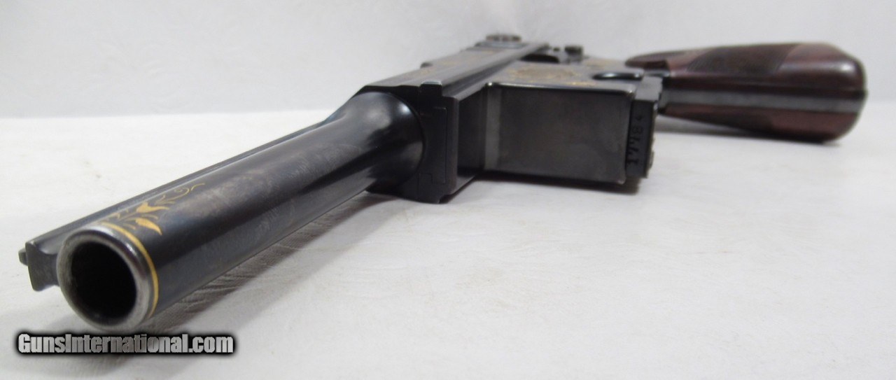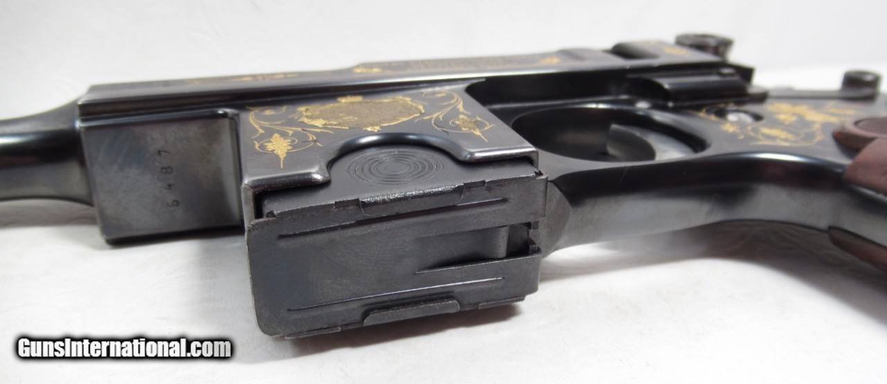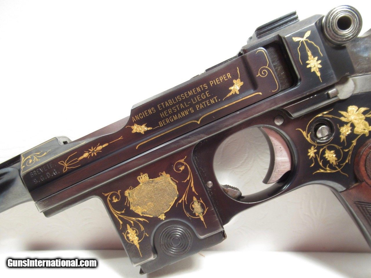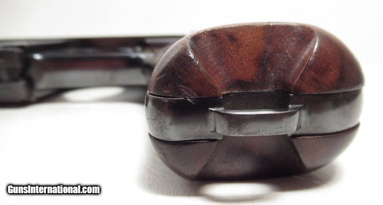 Description: Fantastic Presentation Bergman-Bayard Commercial Model 1910, Semi-Auto Pistol; Serial No. 5487; 9mm, Bergman (9x23) also 9mm Largo Caliber; Clearly a Presentation with Inlaid Gold Cherubs and Foliage in Fine Detail; Excellent Finish with some gold missing on left side and some gold line missing on rights side; 4” Barrel with Fine Burl Walnut Checkered Grips; Surely Done by a Master Engraver; Comes with Original Vintage Holster; Perfect Action, Strong Bore with minor flaws; Excellent Original Holster; Rare 110+ Year-Old Presentation Pistol; From the Buddy King, of Canadian, Texas Collection; See All Photos for Condition; No Texts; Call (254)541-5765 or Email Only; PERSONAL PROPERTY of Harold Wieser; Price: $12,975 + $45 S&H Via USPS PRIORITY MAIL; Payment Address: Harold Wieser - 1466 U.S. Hwy 77 - Rosebud, TX 76570; SEND PAYMENTS VIA USPS PRIORITY MAIL; BEWARE of SCAMS!!! – DO NOT SEND MONEY or CORRESPONDENTS ELECTRONICALLY UNLESS YOU HAVE SPOKEN to HAROLD WIESER FIRST! 254-541-5765 SOLD Manufacturer: Bergman-Bayard Model: 1910 Serial Number: 5487 |