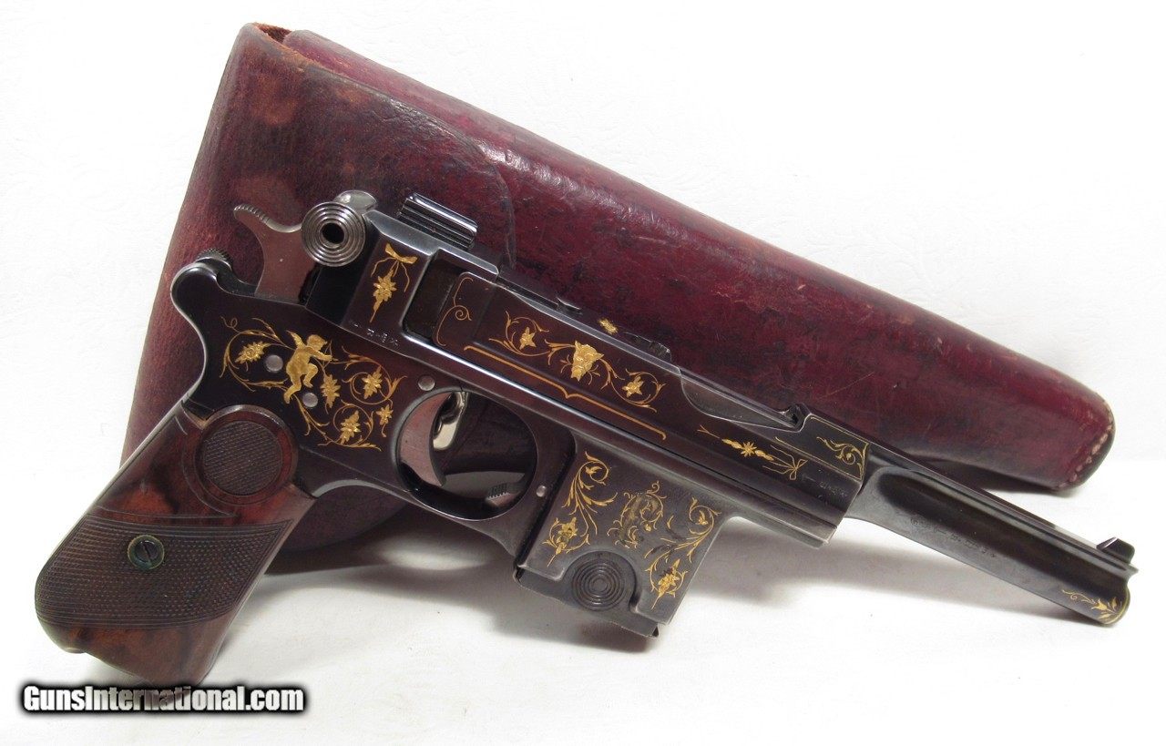 RARE PRESENTATION BERGMAN-BAYARD COMMERCIAL MODEL 1910 PISTOL from COLLECTING TEXAS – INLAID GOLD with ORIGINAL HOLSTER