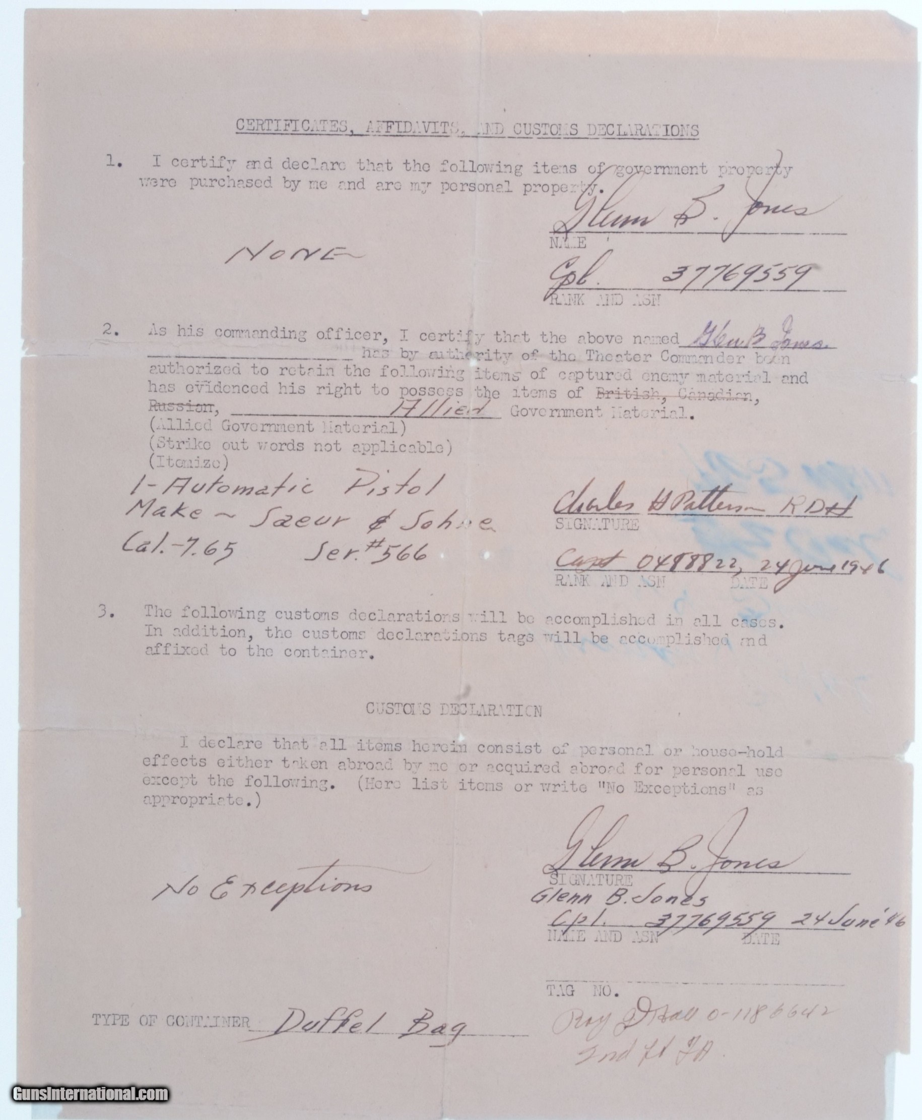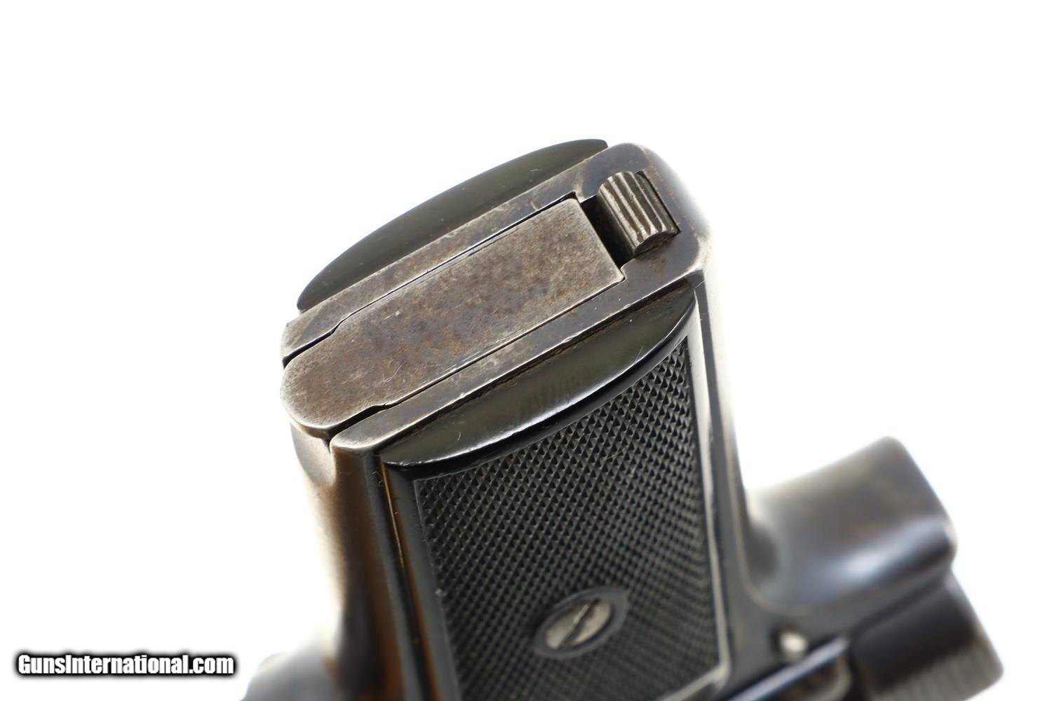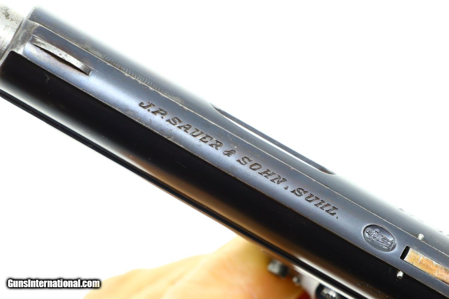 Description: Standard configuration Sauer & Sohn 1913, first variation, with fixed front and rear sights, the latter used as a stop for the firing pin retention knob. Top of slide is manufacturer marked with the left side marked “Patent” and the right side with the caliber. Full serial number on left frame that has been fitted with a push button behind the trigger guard cutout. Only the first variation pistols had this button that requires depression to fire. Crown/N proofing in usual locations. Lightly scribed “FH” on right frame. Black plastic grips with the S&S logo surmounting a checkered bordered field. Original magazine with two oval windows on each side and an unmarked fixed base. Complete with original capture paper showing SN of pistol, dated 24 June 1946, and noted to be in “Duffel Bag”. Synopsis: Super early Sauer M1913, first variation with trigger safety button, crisp original grips, correct magazine and original WWII capture paper. Condition: VG+ bright, original rust blue finish with holster wear in expected places and slight speckling/toning of the gripstraps. Crisp original grips. Bright bore with sharp rifling. Perfect manual mechanics. Capture paper with folds and minor edge losses as photographed. A super rare Sauer in its own right, even better with crisp original capture paper! A HISTORIC INVESTMENT! ~~Insured shipping fee of $65; most packages shipped using FedEx 2nd Day.~~ SOLD Manufacturer: Sauer & Sohn Serial Number: 566 Caliber Info: 7.65 mm |